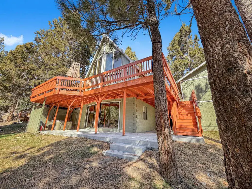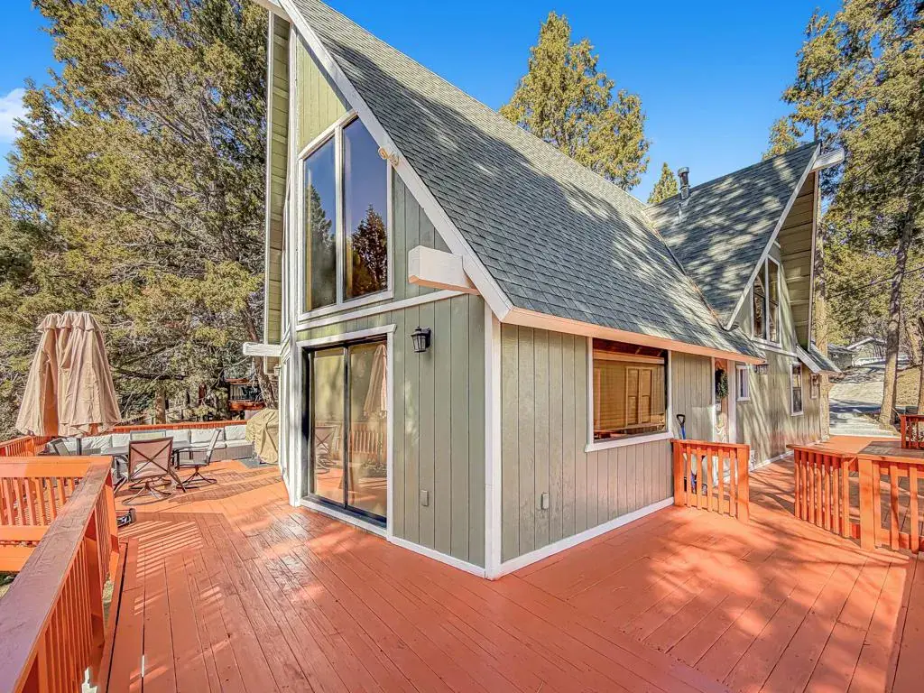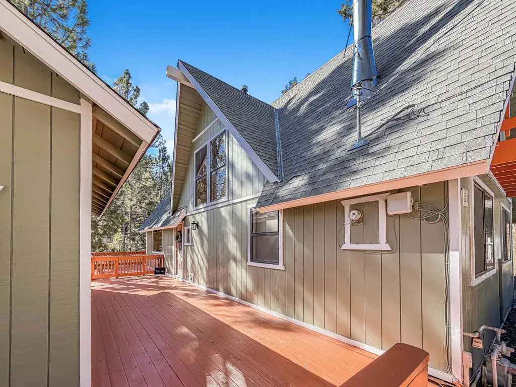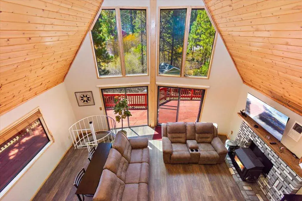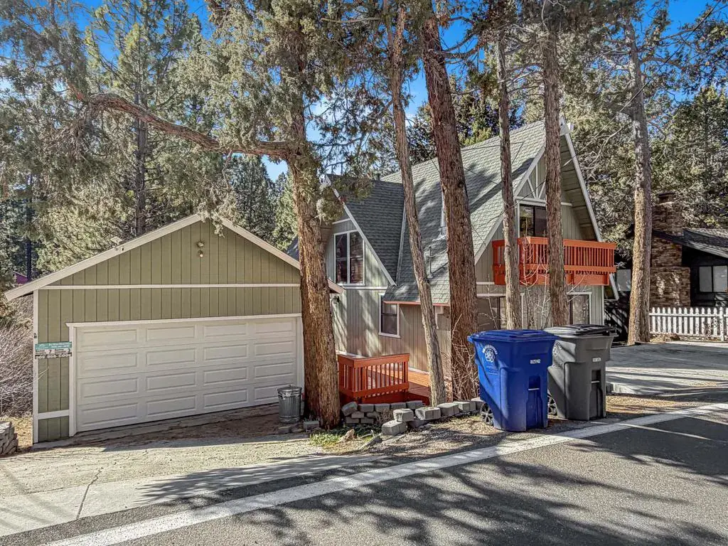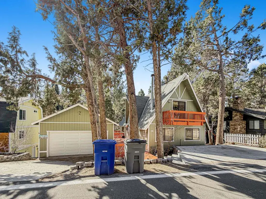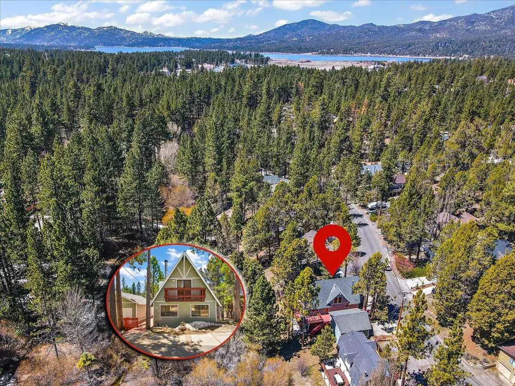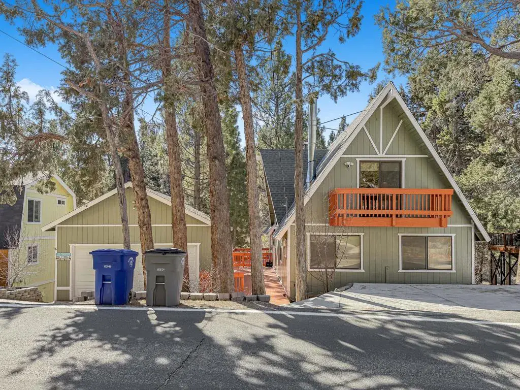 Discover your perfect investment or mountain getaway in Big Bear Lake with this stunning Fox Farm Chalet. Its prime location offers exceptional stargazing thanks to the high altitude and distance from city lights, making the night skies ideal for viewing constellations and meteor showers. This astounding home is a perfect fit for a short-term rental investment, a second home, or year-round living. Featuring 3 bedrooms, 3 bathrooms, and a versatile bonus room, the home boasts an eye-catching A-frame roof and abundant windows and sliding doors that flood the over 1,800 sq ft of living space with natural light. The uniquely designed, tri-level floor plan centers around the mid-level, the heart of the home. Here, a semi-open layout connects a sizable living room, complete with a cozy wood-burning fireplace, to a modern kitchen. The kitchen impresses with white cabinets, quartz countertops, a convenient island, stainless steel appliances, and distinctive lighting. This level also features two stylish bedrooms with lovely outdoor views and a full-size bathroom. Ascend to the top level for a private master bedroom retreat. This serene space includes its own cozy fireplace, exquisite outdoor views, and an extended loft area.The spiral staircase leads down from the mid-level to the ground floor, which is designed as an entertainment space and game room. This flexible area can be transformed into a man-cave, a children’s den, an office workspace, or even set up as a fourth bedroom. A third full bathroom is also located on this level. Complementing these interior features is an incredible outdoor deck, perfect for seating and enjoying the mountain air.