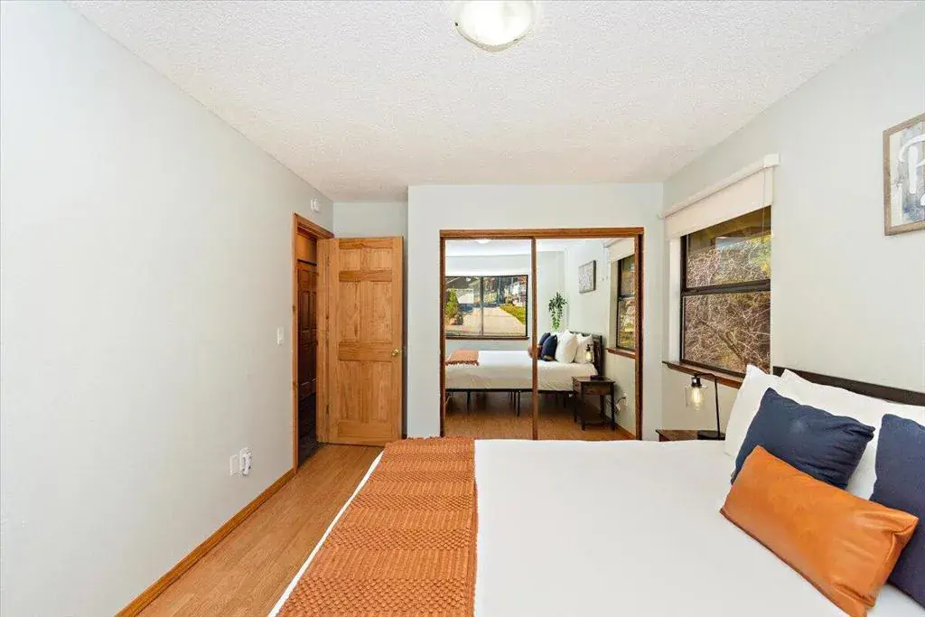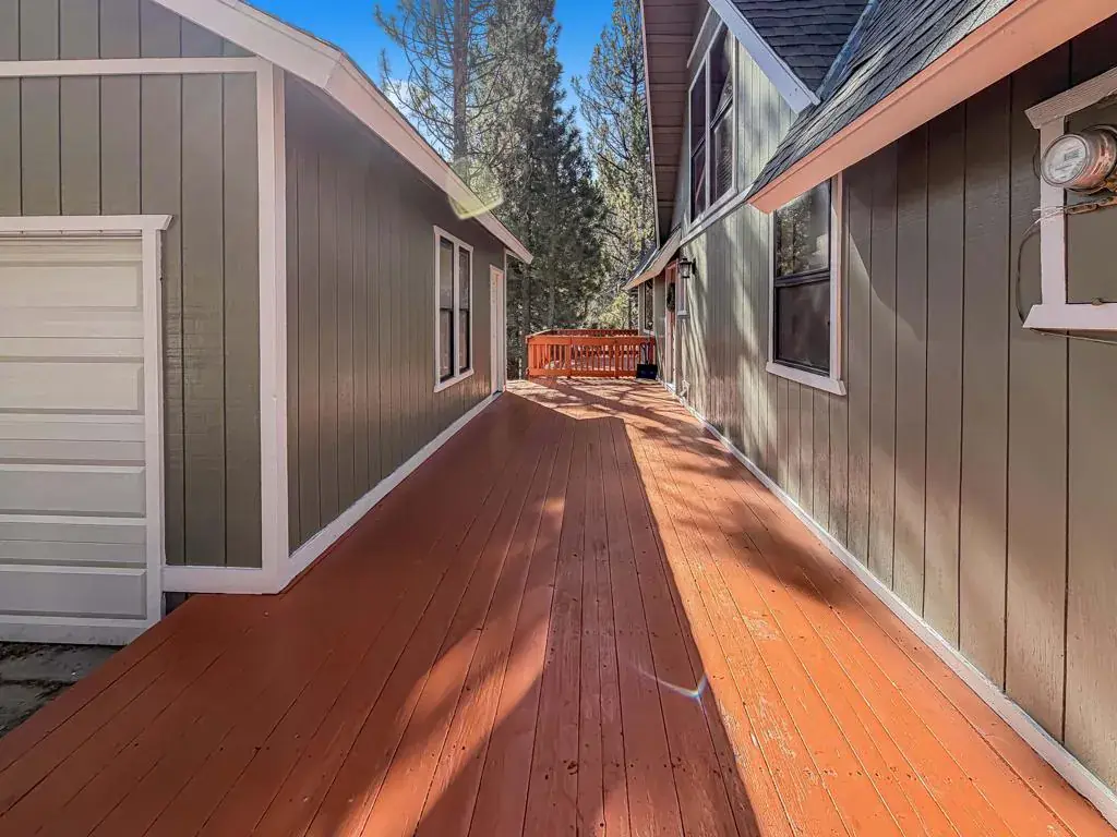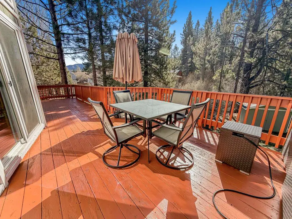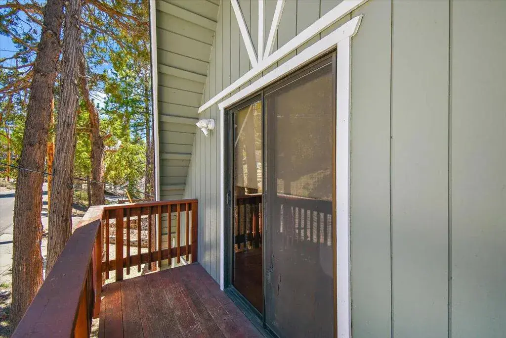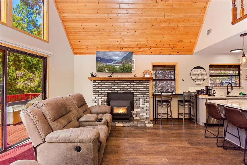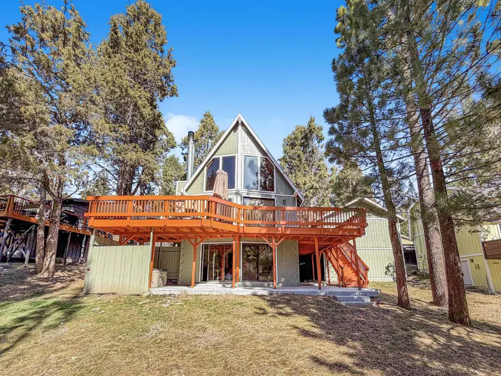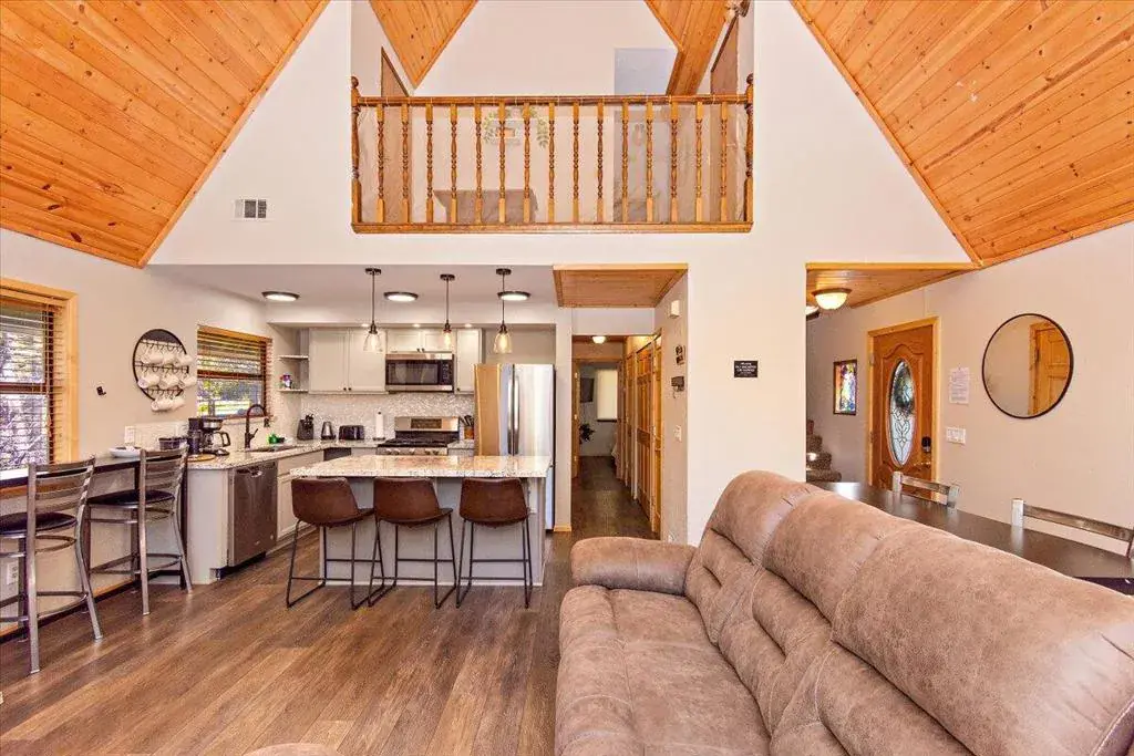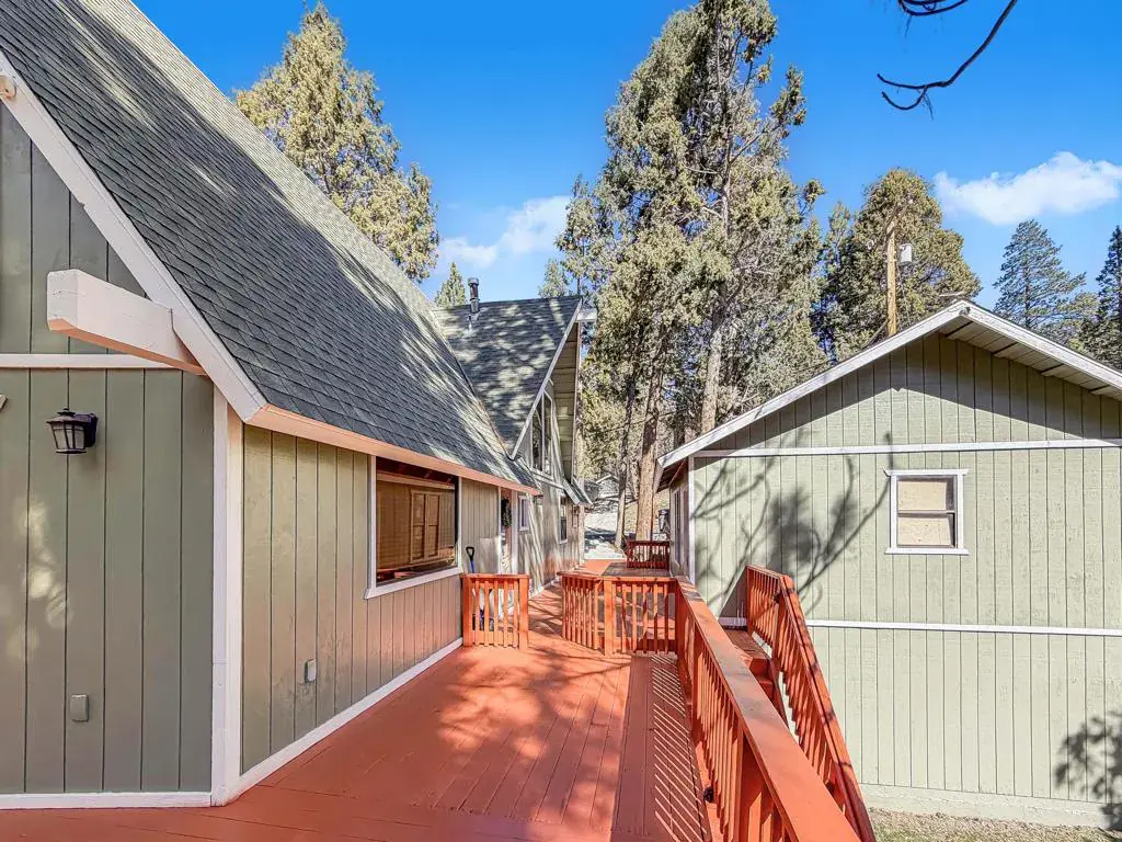 Discover your perfect investment or mountain getaway in Big Bear Lake with this stunning Fox Farm Chalet. Its prime location offers exceptional stargazing thanks to the high altitude and distance from city lights, making the night skies ideal for viewing constellations and meteor showers. This astounding home is a perfect fit for a short-term rental investment, a second home, or year-round living. Featuring 3 bedrooms, 3 bathrooms, and a versatile bonus room, the home boasts an eye-catching A-frame roof and abundant windows and sliding doors that flood the over 1,800 sq ft of living space with natural light. The uniquely designed, tri-level floor plan centers around the mid-level, the heart of the home. Here, a semi-open layout connects a sizable living room, complete with a cozy wood-burning fireplace, to a modern kitchen. The kitchen impresses with white cabinets, quartz countertops, a convenient island, stainless steel appliances, and distinctive lighting. This level also features two stylish bedrooms with lovely outdoor views and a full-size bathroom. Ascend to the top level for a private master bedroom retreat. This serene space includes its own cozy fireplace, exquisite outdoor views, and an extended loft area.The spiral staircase leads down from the mid-level to the ground floor, which is designed as an entertainment space and game room. This flexible area can be transformed into a man-cave, a children’s den, an office workspace, or even set up as a fourth bedroom. A third full bathroom is also located on this level. Complementing these interior features is an incredible outdoor deck, perfect for seating and enjoying the mountain air.