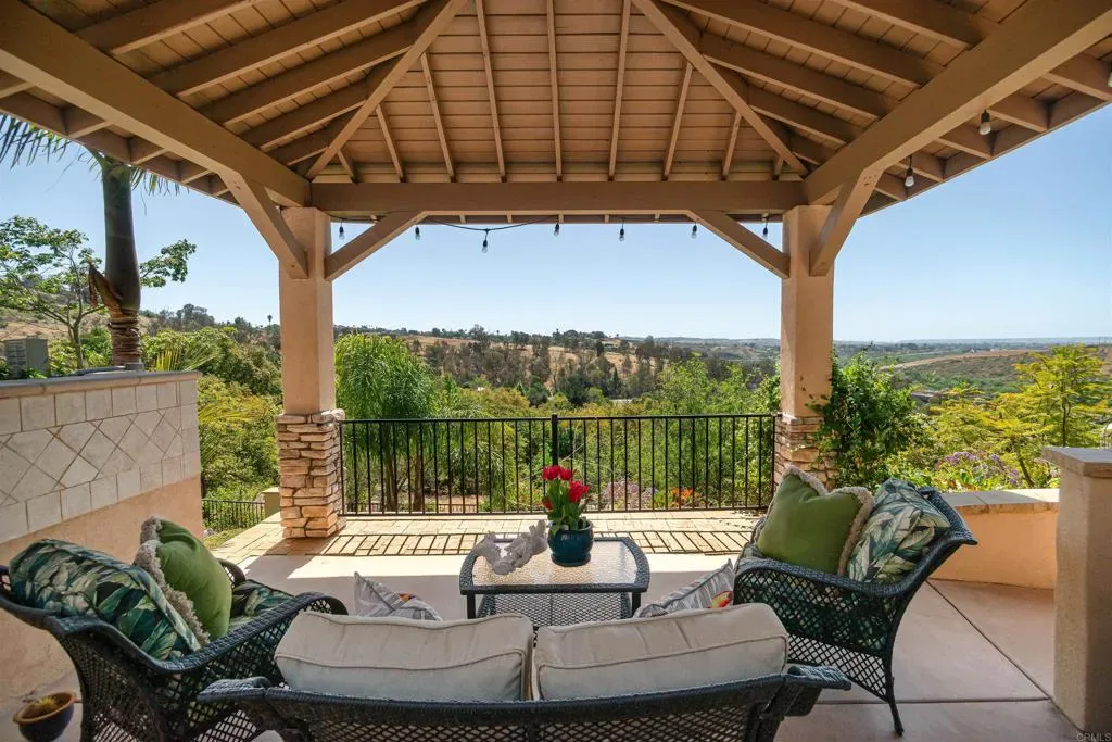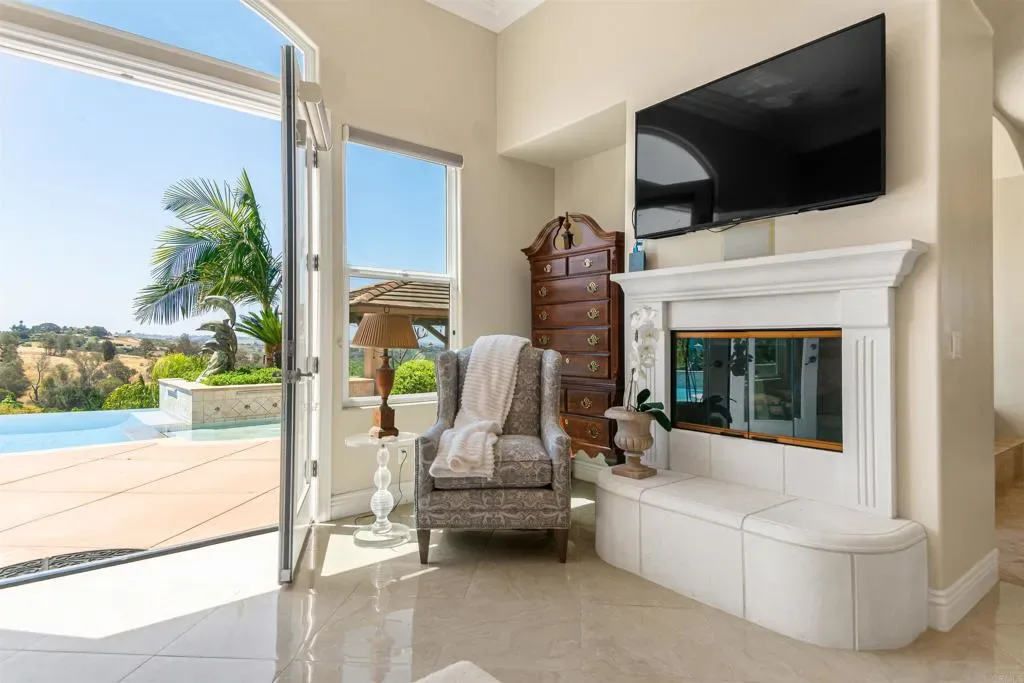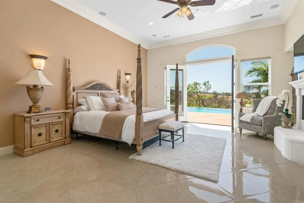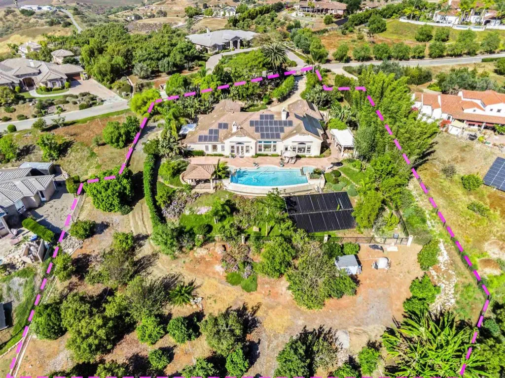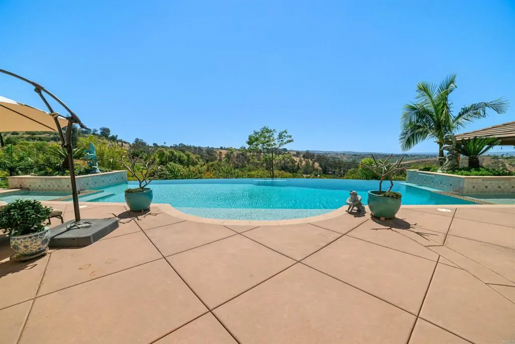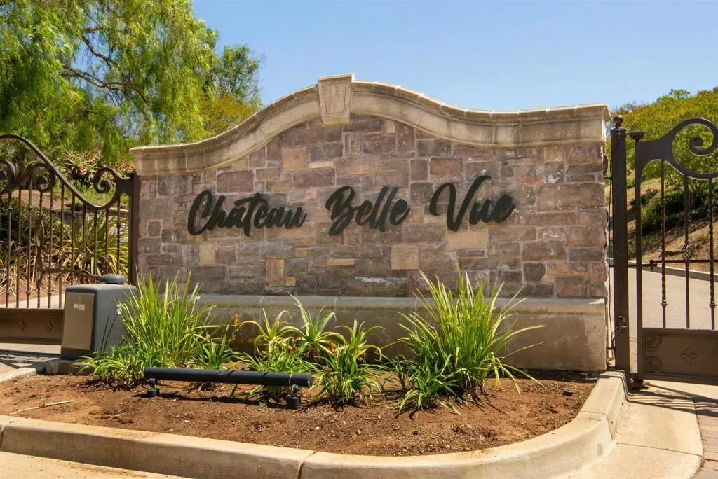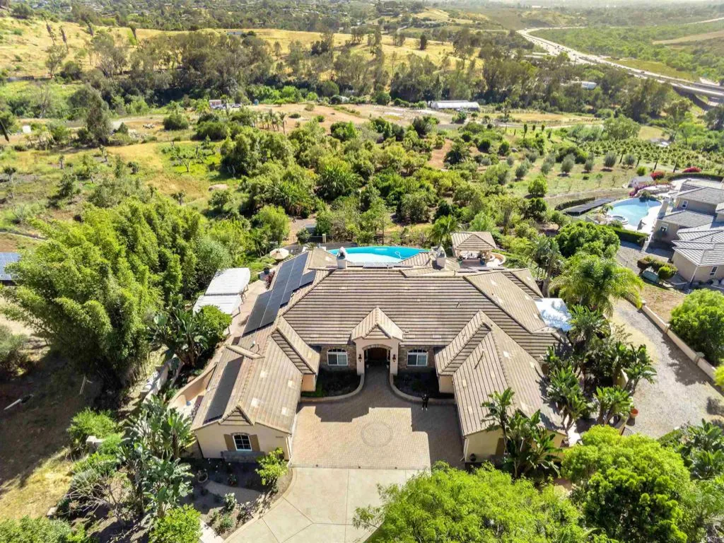 Luxury, privacy, and breathtaking views define this single-story 4,400 sq. ft. estate in the prestigious gated community of Château Belle Vue. Set on 2.2 serene acres, this Mediterranean-inspired residence welcomes you with a private curved driveway, custom paver courtyard, and lush, meticulously landscaped grounds. Inside, soaring ceilings, wood-beam accents, and an open, sun-filled layout create an atmosphere of elegance and ease. The gourmet kitchen features high-end stainless steel appliances, a 6-burner range with pot-filler, granite countertops, an oversized island, and a walk-in pantry. The adjoining living spaces offer seamless indoor-outdoor flow, perfect for both everyday comfort and grand entertaining. Custom window coverings, including plantation shutters and designer roller shades, enhance both style and privacy throughout the home and also, motorized rolled shades on the exterior back of the property. The luxurious primary suite provides a peaceful retreat with its own fireplace, a spa-style bath, soaking tub, dual vanities, and a spacious walk-in closet. All additional bedrooms include private en-suite baths. Step outside to your own private resort: an infinity-edge pool, expansive patios, and a pergola-covered outdoor kitchen/BBQ. Two additional covered pergola sitting areas offer the perfect spots to unwind, enjoy the breeze, and take in the stunning sunset views. The grounds also feature an avocado grove, citrus trees, solar, and a 4-car garage. Additional highlights include a waterfall with a lily pond, a private entry gate, and a separate grove service gate, enhancing both convenience and seclusion. All of this is located within just 10 miles of some of San Diego’s most beautiful beaches, offering the perfect blend of country tranquility and coastal lifestyle. A rare opportunity to own a true Bonsall luxury estate, tranquil, private, and crafted for exceptional living.