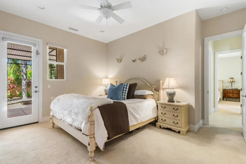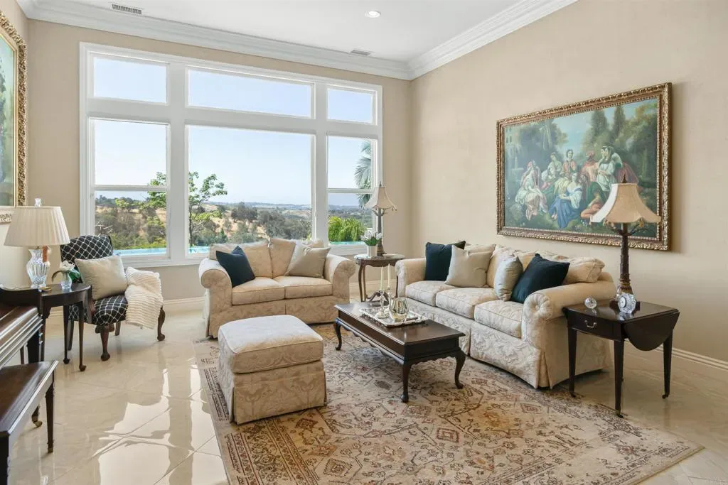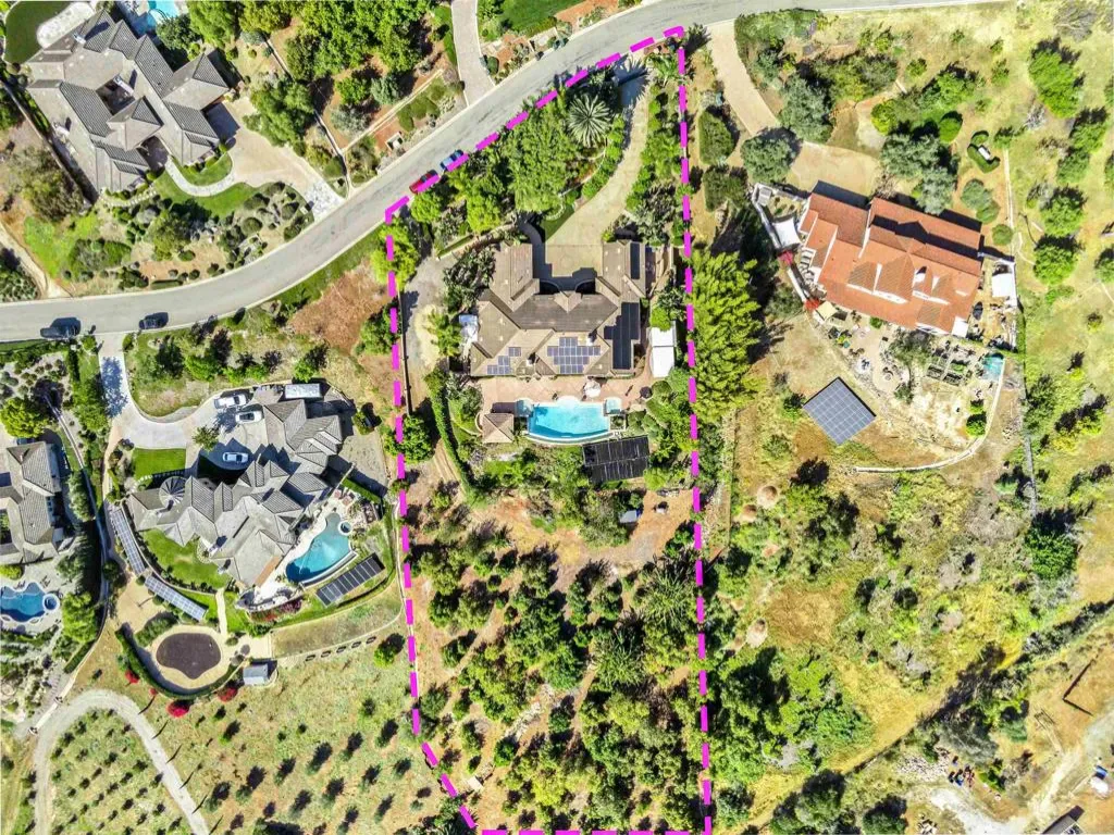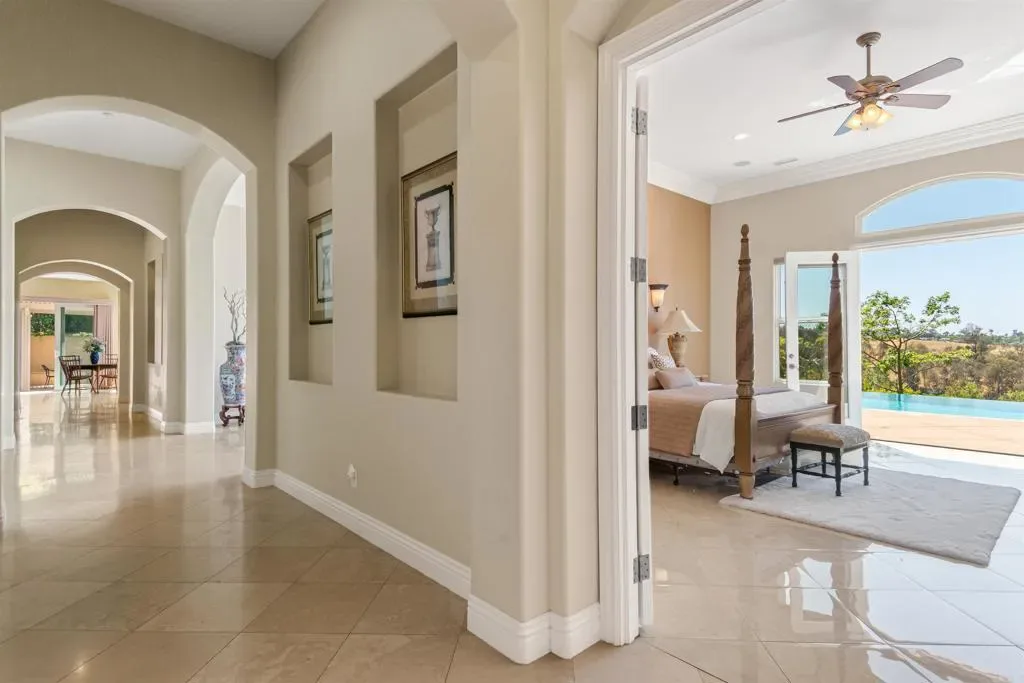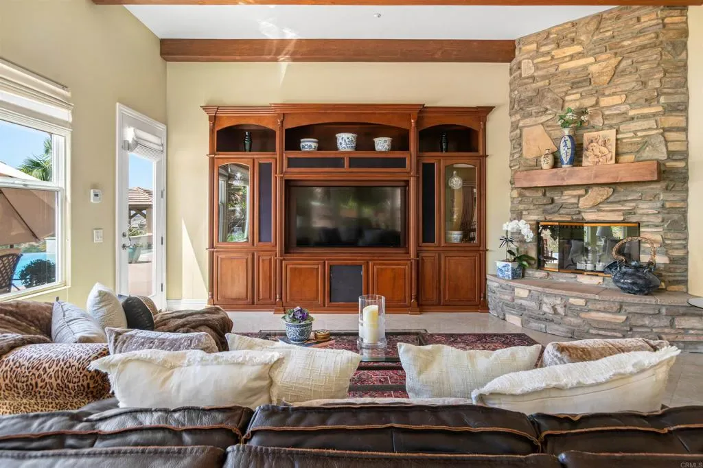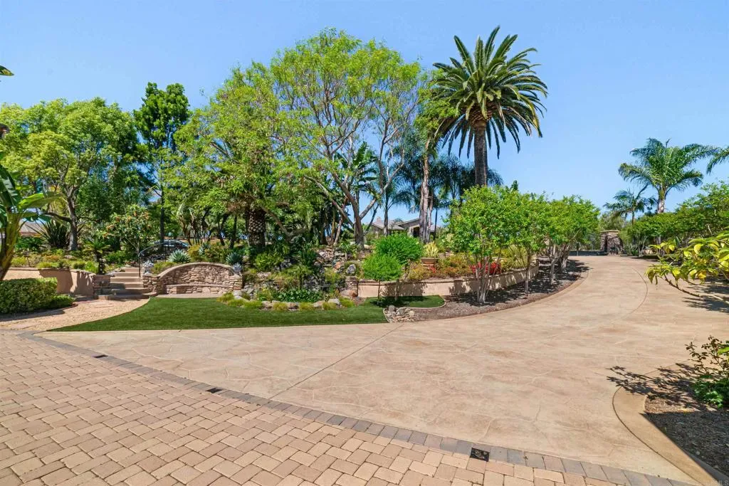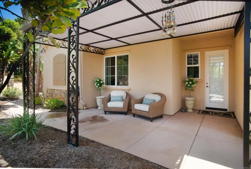 Luxury, privacy, and breathtaking views define this single-story 4,400 sq. ft. estate in the prestigious gated community of Château Belle Vue. Set on 2.2 serene acres, this Mediterranean-inspired residence welcomes you with a private curved driveway, custom paver courtyard, and lush, meticulously landscaped grounds. Inside, soaring ceilings, wood-beam accents, and an open, sun-filled layout create an atmosphere of elegance and ease. The gourmet kitchen features high-end stainless steel appliances, a 6-burner range with pot-filler, granite countertops, an oversized island, and a walk-in pantry. The adjoining living spaces offer seamless indoor-outdoor flow, perfect for both everyday comfort and grand entertaining. Custom window coverings, including plantation shutters and designer roller shades, enhance both style and privacy throughout the home and also, motorized rolled shades on the exterior back of the property. The luxurious primary suite provides a peaceful retreat with its own fireplace, a spa-style bath, soaking tub, dual vanities, and a spacious walk-in closet. All additional bedrooms include private en-suite baths. Step outside to your own private resort: an infinity-edge pool, expansive patios, and a pergola-covered outdoor kitchen/BBQ. Two additional covered pergola sitting areas offer the perfect spots to unwind, enjoy the breeze, and take in the stunning sunset views. The grounds also feature an avocado grove, citrus trees, solar, and a 4-car garage. Additional highlights include a waterfall with a lily pond, a private entry gate, and a separate grove service gate, enhancing both convenience and seclusion. All of this is located within just 10 miles of some of San Diego’s most beautiful beaches, offering the perfect blend of country tranquility and coastal lifestyle. A rare opportunity to own a true Bonsall luxury estate, tranquil, private, and crafted for exceptional living.