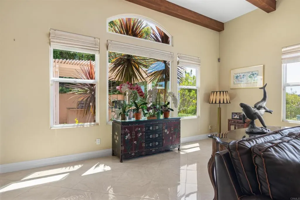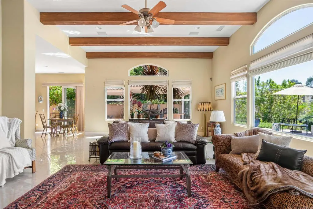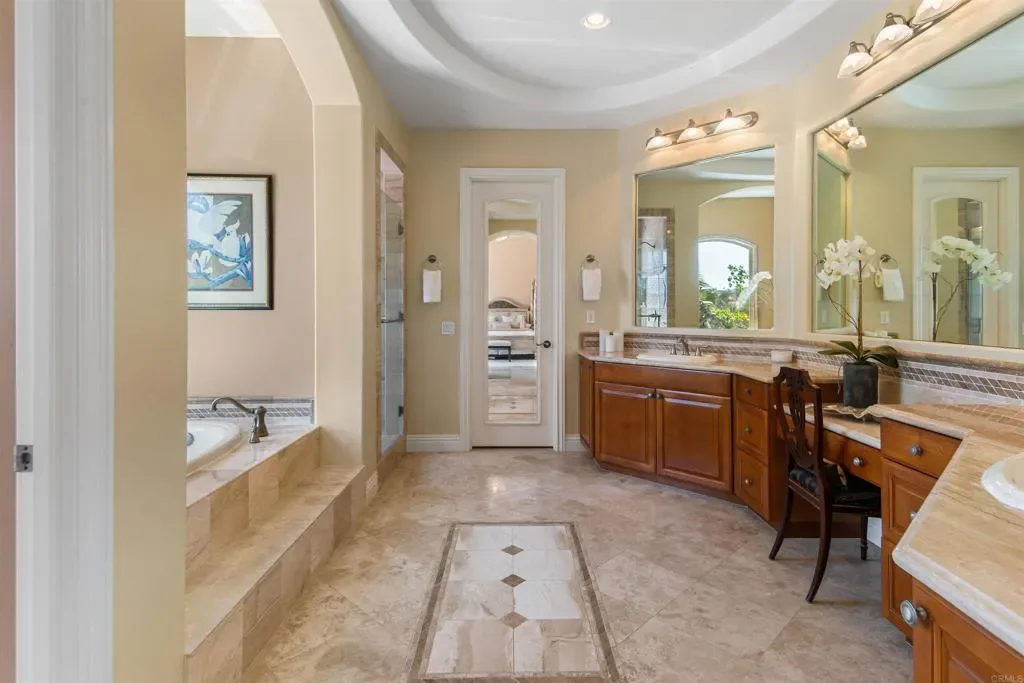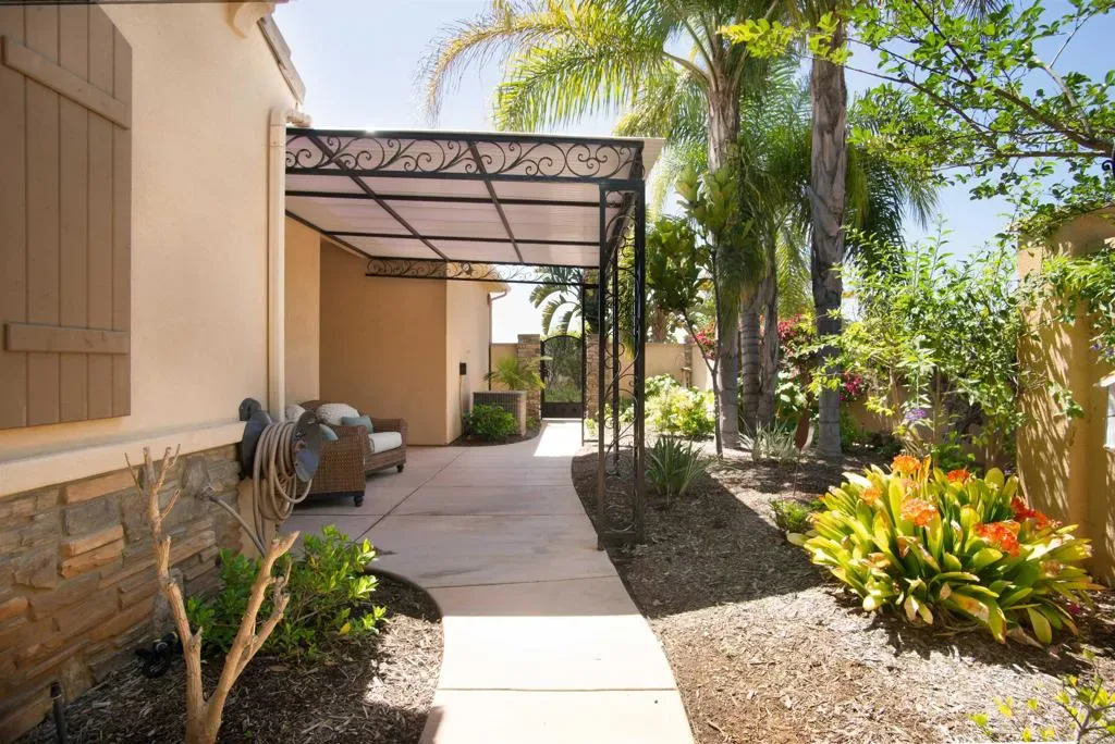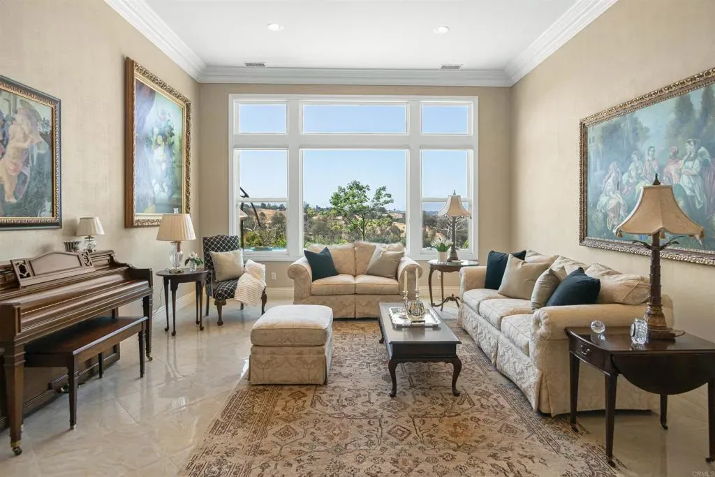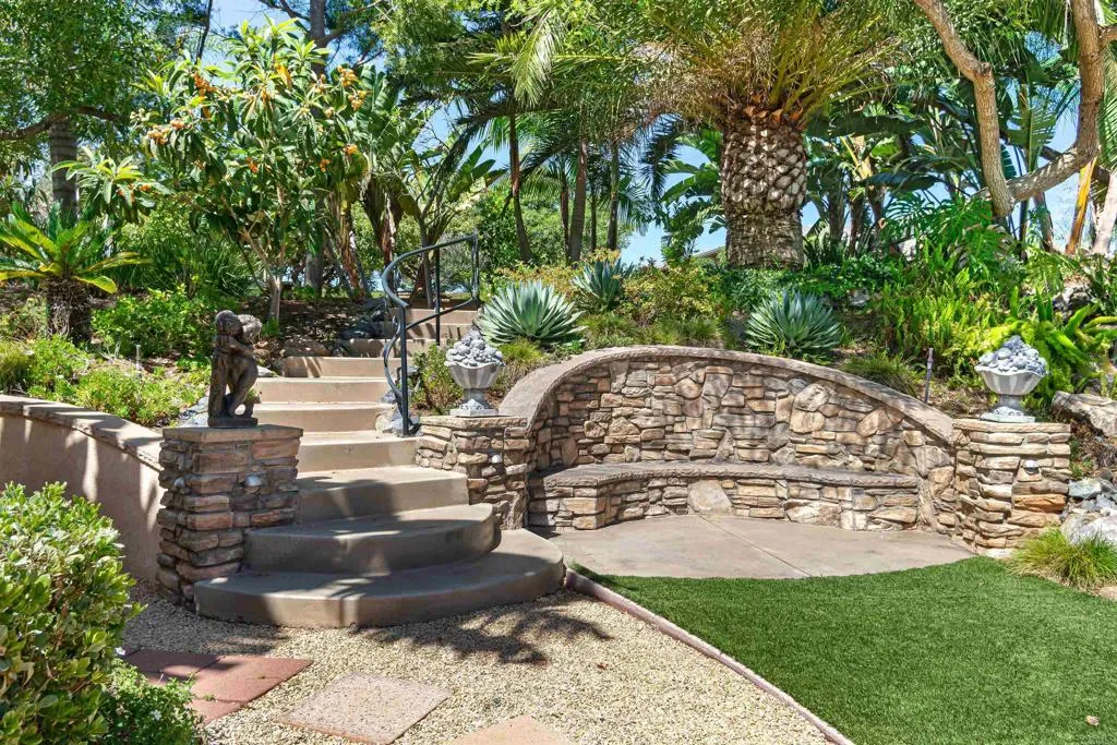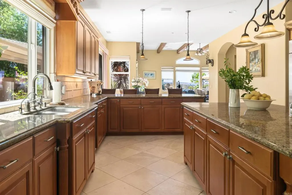 Luxury, privacy, and breathtaking views define this single-story 4,400 sq. ft. estate in the prestigious gated community of Château Belle Vue. Set on 2.2 serene acres, this Mediterranean-inspired residence welcomes you with a private curved driveway, custom paver courtyard, and lush, meticulously landscaped grounds. Inside, soaring ceilings, wood-beam accents, and an open, sun-filled layout create an atmosphere of elegance and ease. The gourmet kitchen features high-end stainless steel appliances, a 6-burner range with pot-filler, granite countertops, an oversized island, and a walk-in pantry. The adjoining living spaces offer seamless indoor-outdoor flow, perfect for both everyday comfort and grand entertaining. Custom window coverings, including plantation shutters and designer roller shades, enhance both style and privacy throughout the home and also, motorized rolled shades on the exterior back of the property. The luxurious primary suite provides a peaceful retreat with its own fireplace, a spa-style bath, soaking tub, dual vanities, and a spacious walk-in closet. All additional bedrooms include private en-suite baths. Step outside to your own private resort: an infinity-edge pool, expansive patios, and a pergola-covered outdoor kitchen/BBQ. Two additional covered pergola sitting areas offer the perfect spots to unwind, enjoy the breeze, and take in the stunning sunset views. The grounds also feature an avocado grove, citrus trees, solar, and a 4-car garage. Additional highlights include a waterfall with a lily pond, a private entry gate, and a separate grove service gate, enhancing both convenience and seclusion. All of this is located within just 10 miles of some of San Diego’s most beautiful beaches, offering the perfect blend of country tranquility and coastal lifestyle. A rare opportunity to own a true Bonsall luxury estate, tranquil, private, and crafted for exceptional living.