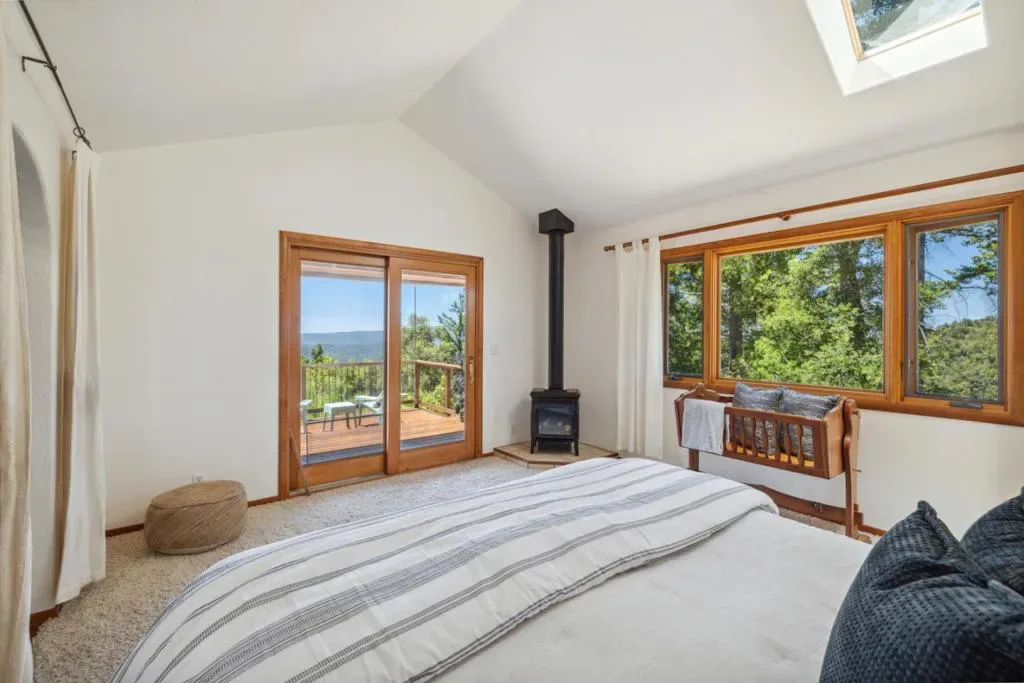 Adventurers! Embrace an independent lifestyle in this 28 acres off-grid ridge top home in one of California’s most beautiful regions with peace, space and privacy. You will be greeted by the sight of little waterfalls trickling into small ponds as you approach the entrance to your home. Open the front door and see breathtaking views of mountains of redwoods, Monterey Bay and the Monterey Peninsula. This beautifully-designed 2-bedroom, 2-bath home with a bonus room features large picture windows & skylights filling the home with sunlight. Curved archways, vaulted ceilings, and beautiful hardwood floors add to the warm, inviting atmosphere. The primary bathroom features a large jacuzzi bathtub with views of the surrounding forest and Monterey Bay. Turnkey solar energy system, backup batteries, and a reliable private well. Internet/cell service is available. Two 5,000 gal. water tanks and hydrant, and the detached 400-sf workshop includes a guest quarters loft with air-conditioning. The large fenced area hosts organic vegetable beds and mature fruit trees. Photos show the garden in its previous and future glory. Potting shed has attached cold frame, and the greenhouse provides year-round growing. Root cellar/wine storage add functional charm for homesteading and connoisseurs alike.