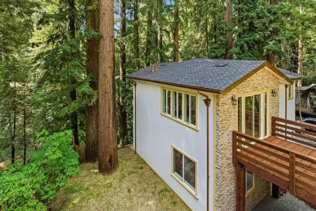 Experience Exceptional New Construction with striking contemporary design, beautifully accented by timeless Carmel stone. This rare custom-built home by a licensed contractor/engineer reflects quality craftsmanship and thoughtful design throughout. The open floor plan features expansive windows that flood the home with abundant natural light, highlighting a large open-concept gourmet kitchen w/stainless appliances, spacious living room w/vaulted ceilings and bonus room/office. High-end finishes include custom cabinetry, tile flooring, floor-to-ceiling tile in bathrooms & laundry, Italian marble countertops. Distinctive details include copper cladding, copper gutters, downspouts and roof fixtures, recessed lighting, Brazilian Sapele stair railings, and motion-sensor lighting. Enjoy a sunny deck perfect for morning coffee or evening entertainment with friends & family. The glow of custom lighting enhances the evening ambiance. A thoughtfully designed paved parking area accommodates up to 3 vehicles & provides easy access across the deck to the second-floor main living space. Nestled in a beautiful, sun-filled setting surrounded by stunning redwoods, this incredible home offers the perfect blend of tranquility and modern living, and so close to downtown Boulder Creek & amenities