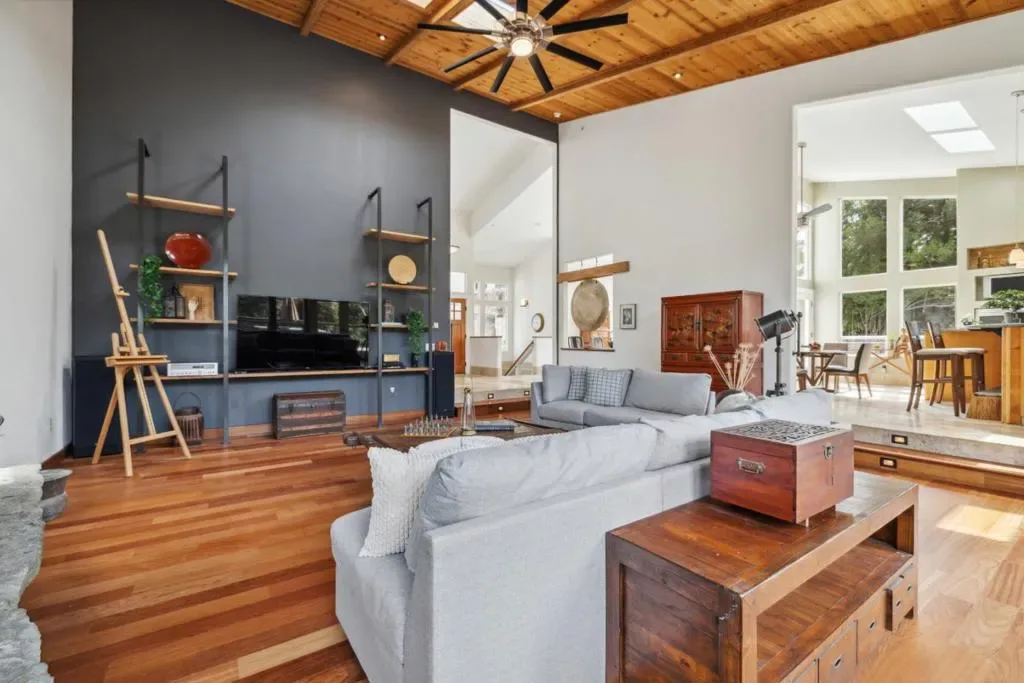 Experience luxury, space, and versatility in this palatial estate, which is ideal for multi-generational compound living thanks to an ADU and over 10 acres of serene privacy. The main home offers 7 bedrooms and 6 bathrooms, highlighted by soaring 16-foot ceilings and expansive windows that fill the home with beautiful natural light while showcasing breathtaking views of the surrounding landscape. At the heart of the home, the kitchen features a dine-in breakfast bar and generous counter space for preparing a gourmet meal. Adjacent to the kitchen is a formal dining room, the dream for those who love entertaining. Or have guests venture outside to dine al fresco on the expansive deck and explore winding pathways through lush, mature gardens featuring vibrant Japanese Maples, fruit-bearing trees, and blooming crepe myrtle. Car collectors and hobbyists alike will appreciate the designer 3-car garage, complete with sleek oak cabinetry, mirrored storage, and a private bathroom. Ideally located off Bear Creek Road, this estate provides easy access to both charming downtown Boulder Creek and the innovation hubs of Silicon Valley, such as Nvidia, Netflix, Apple, and more.