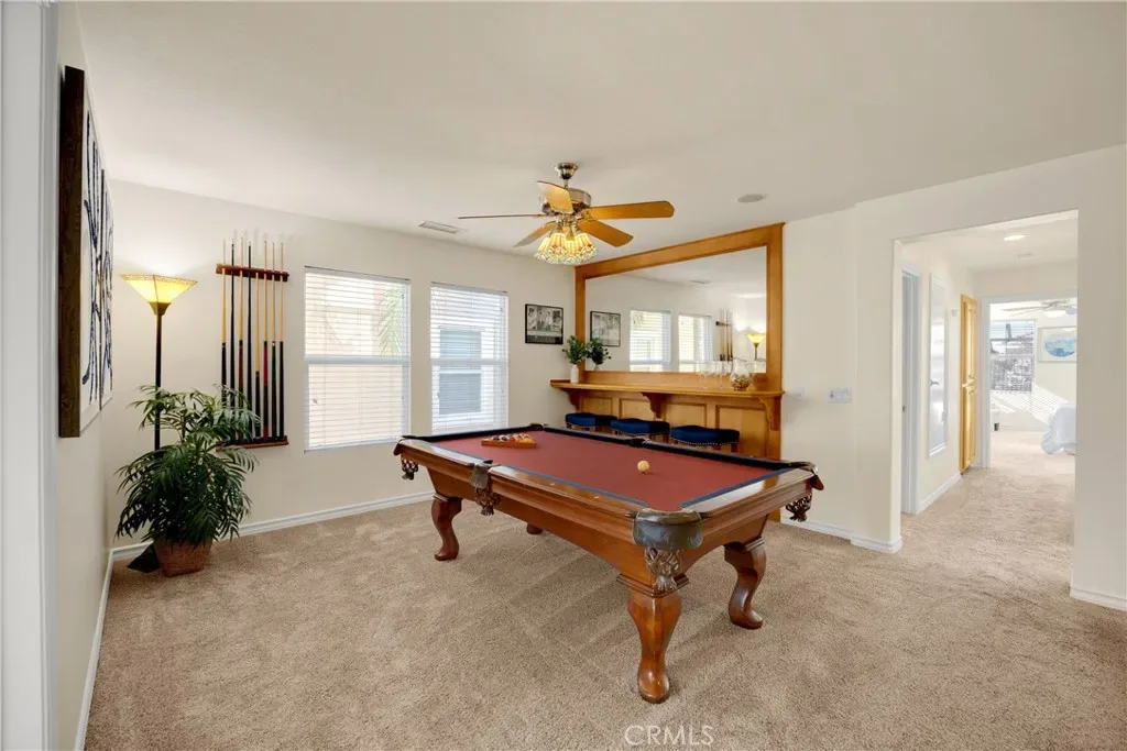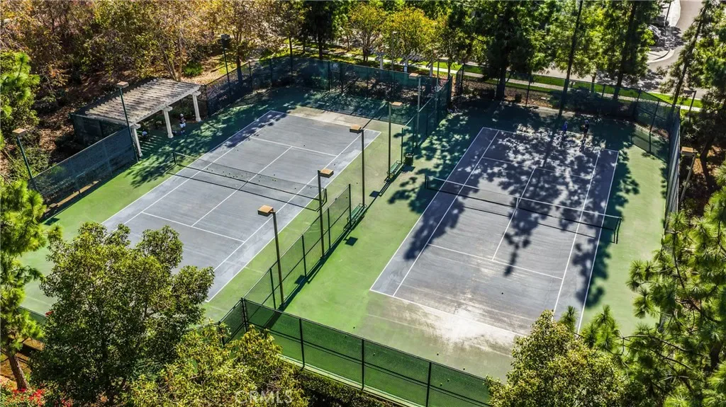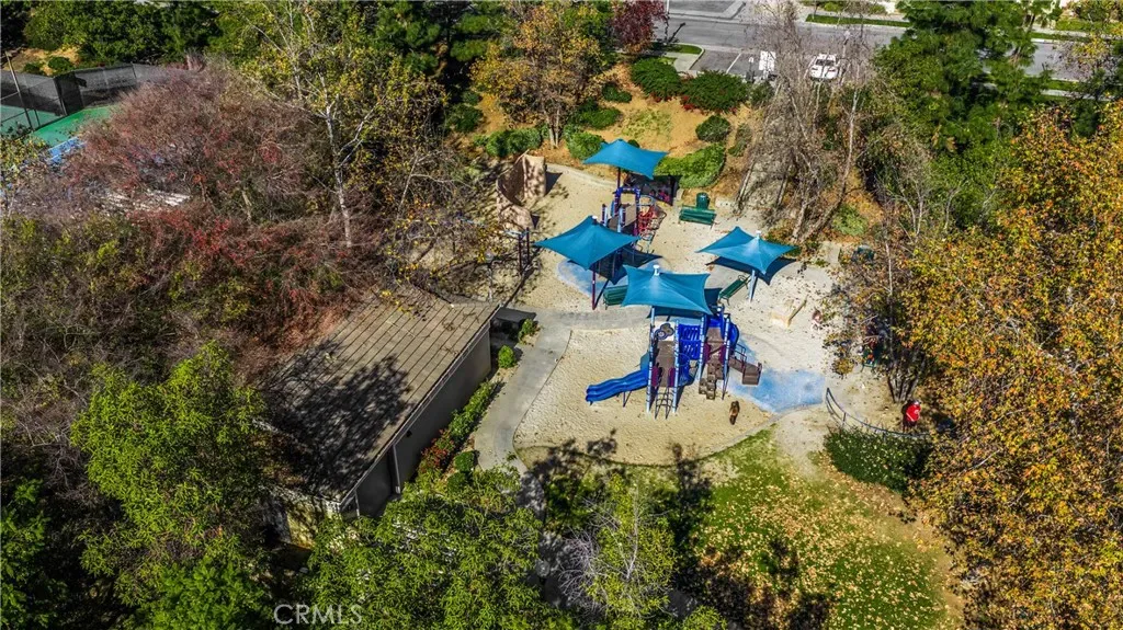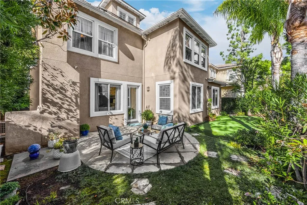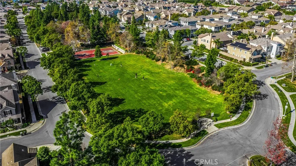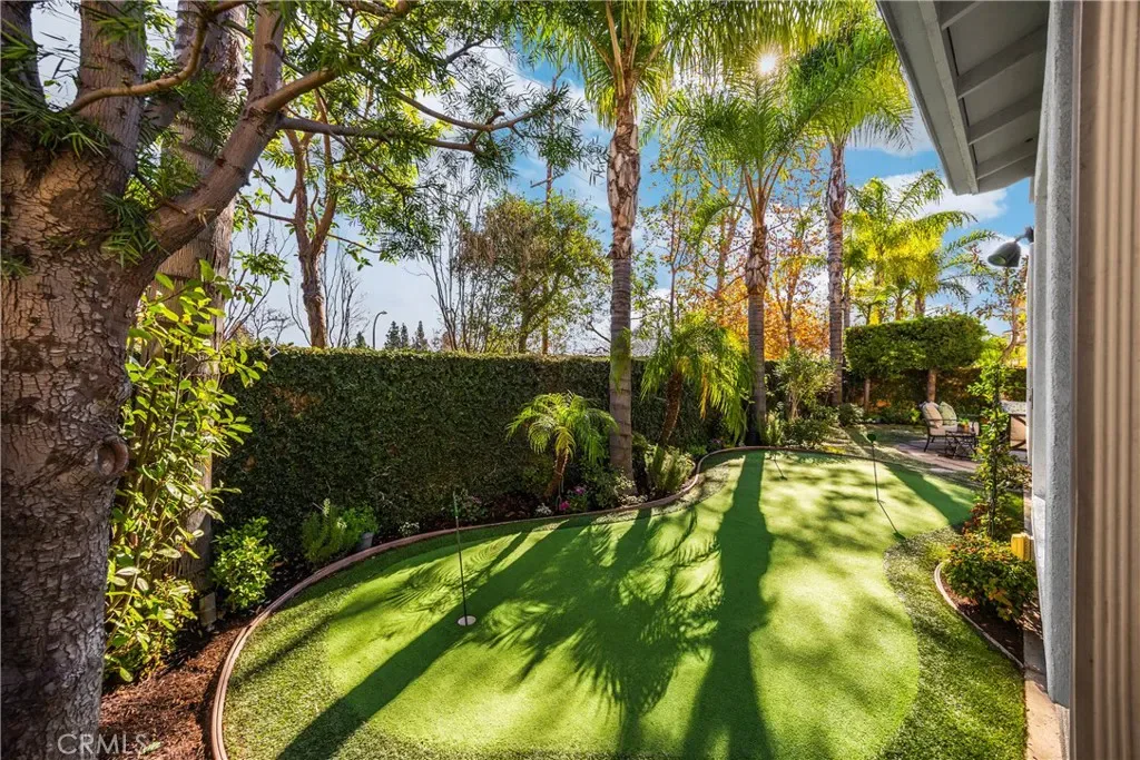 The low-maintenance yard provides ease of living while the park directly across the street offers expansive outdoor space including field playground tennis basketball & community pool and spa effectively extending your backyard without the upkeep. The backyard offers privacy with no direct rear neighbors featuring a custom putting green & lush landscaping. The lot sits elevated with trees & a landscaped walkway behind the property creating a pleasant buffer.