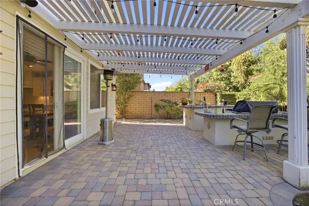 Outdoor living is enhanced by multi-colored paver hardscape, a covered patio with built-in BBQ island and prep sink, and a private backyard overlooking a landscaped HOA-maintained greenbelt hillside.