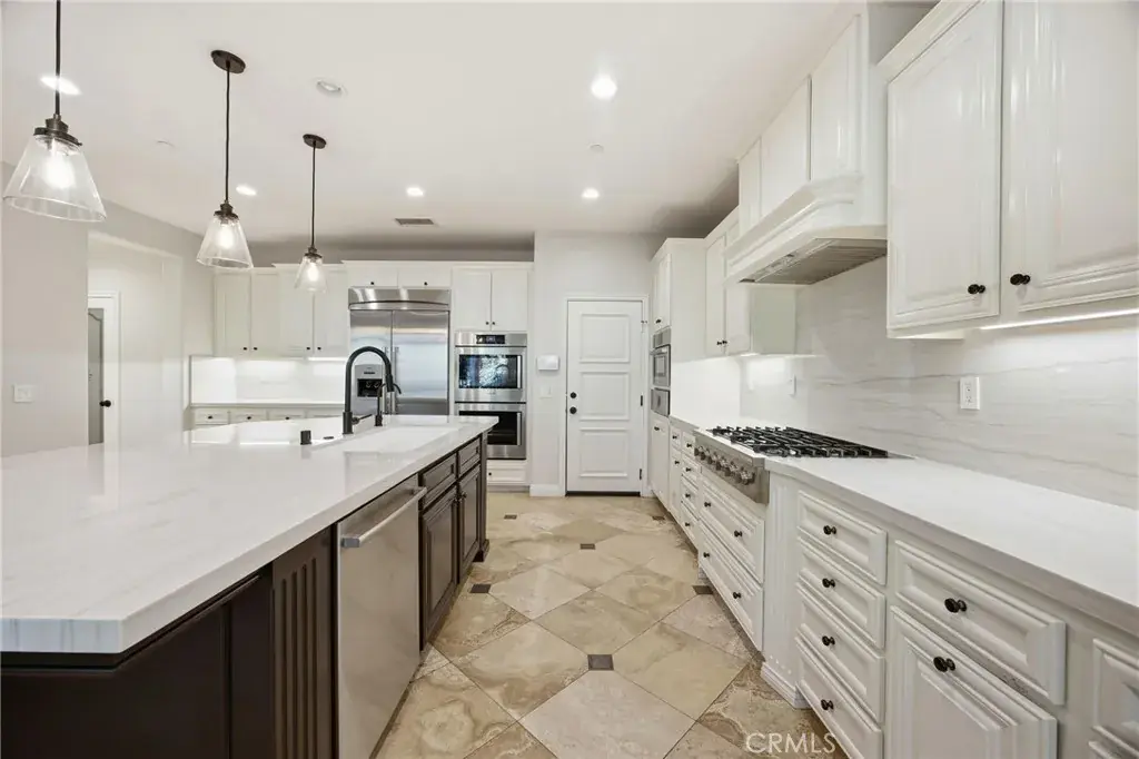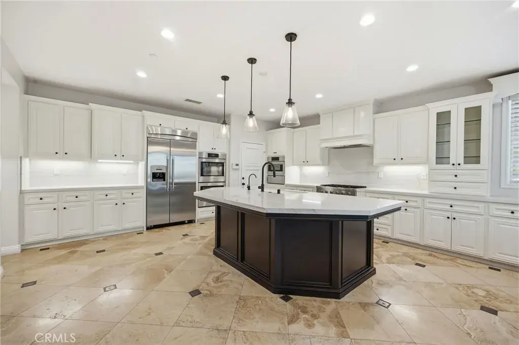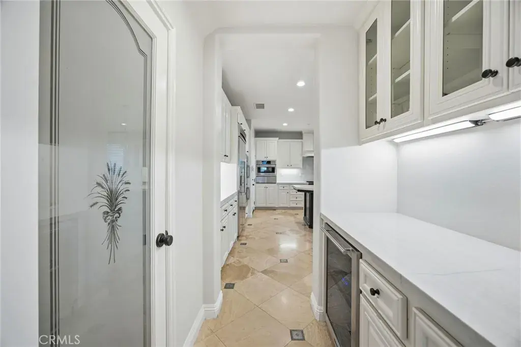 The fully renovated kitchen serves as the centerpiece of the home, highlighted by striking White Lux Quartzite natural stone countertops and full-height backsplash, refinished cabinetry in contrasting designer tones, and a Bosch stainless steel appliance suite including double convection ovens, 6-burner gas range, warming drawer, and an oversized enameled cast-iron undermount sink. A butler’s pantry with built-in wine refrigerator provides additional prep and entertaining space.