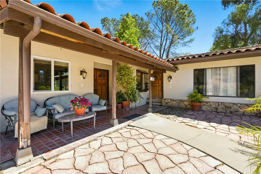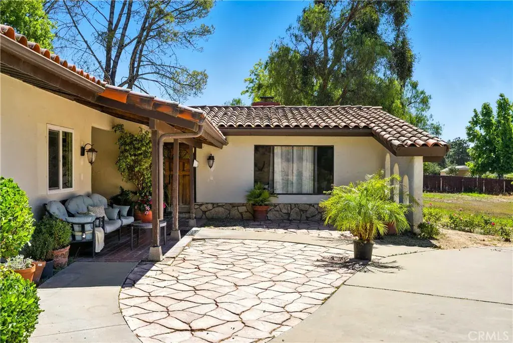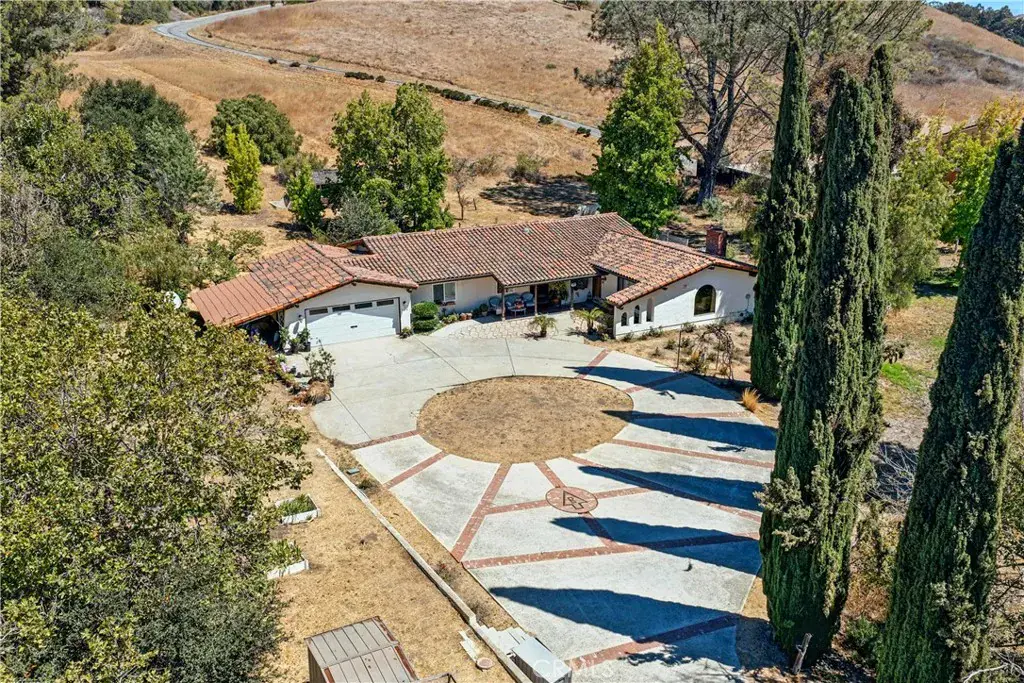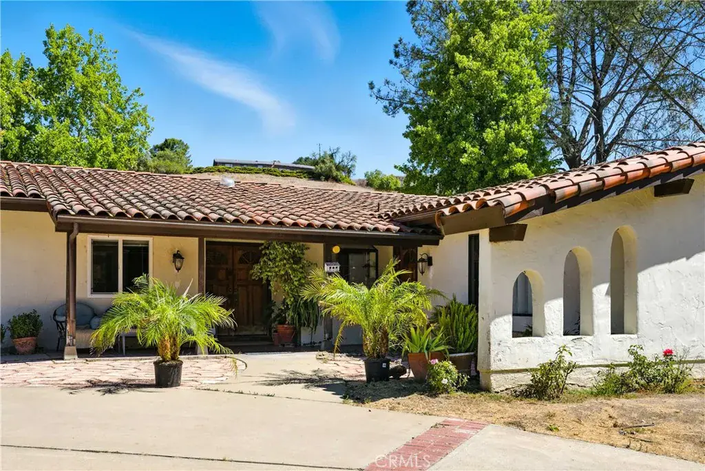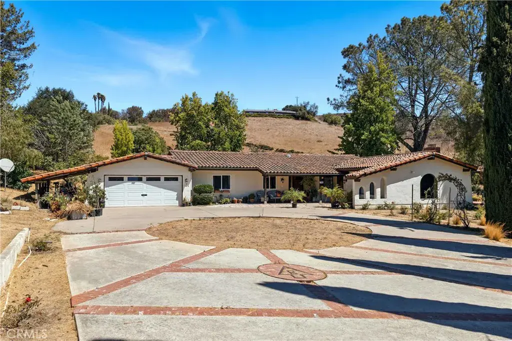 A circular driveway leads to the single level four bedroom two bathroom residence which spans approximately 2,800 square feet and features a stucco exterior with a clay tile roof, an attached two car garage, timeless Saltillo tile flooring throughout, and a cozy fireplace that anchors the living space with warmth and character.