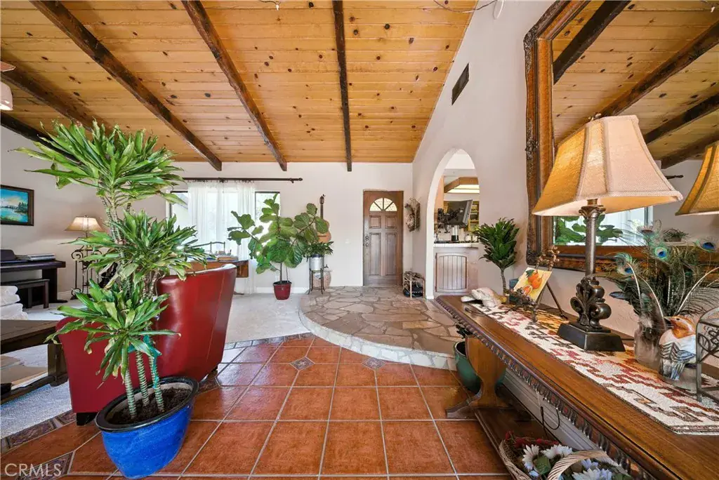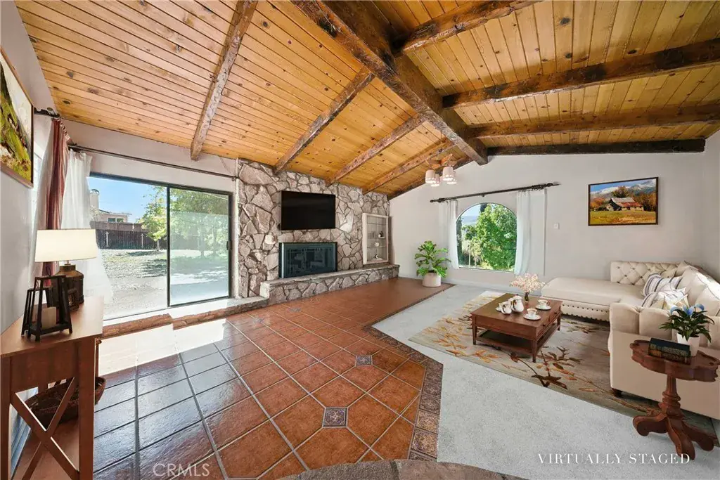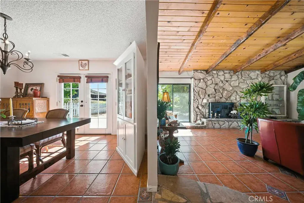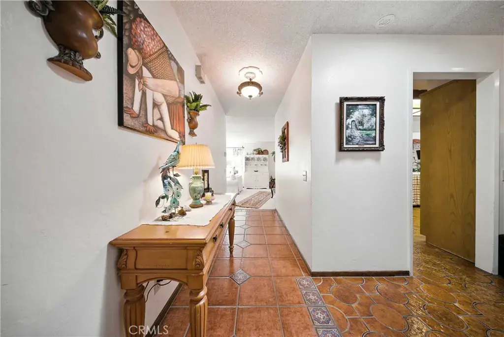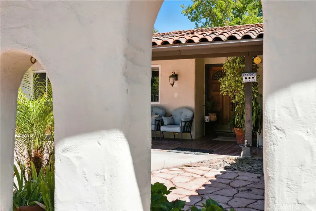 A circular driveway leads to the single level four bedroom two bathroom residence which spans approximately 2,800 square feet and features a stucco exterior with a clay tile roof, an attached two car garage, timeless Saltillo tile flooring throughout, and a cozy fireplace that anchors the living space with warmth and character.