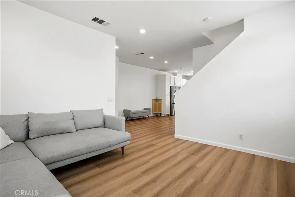 The kitchen is a standout, featuring sleek quartz countertops and clean white cabinetry that opens up to the main living area. One of the best features of this floor plan is the ground-level bedroom, offering the perfect setup for a home office, guest suite, or multigenerational living. For added convenience, the laundry closet is located upstairs near the primary bedrooms.