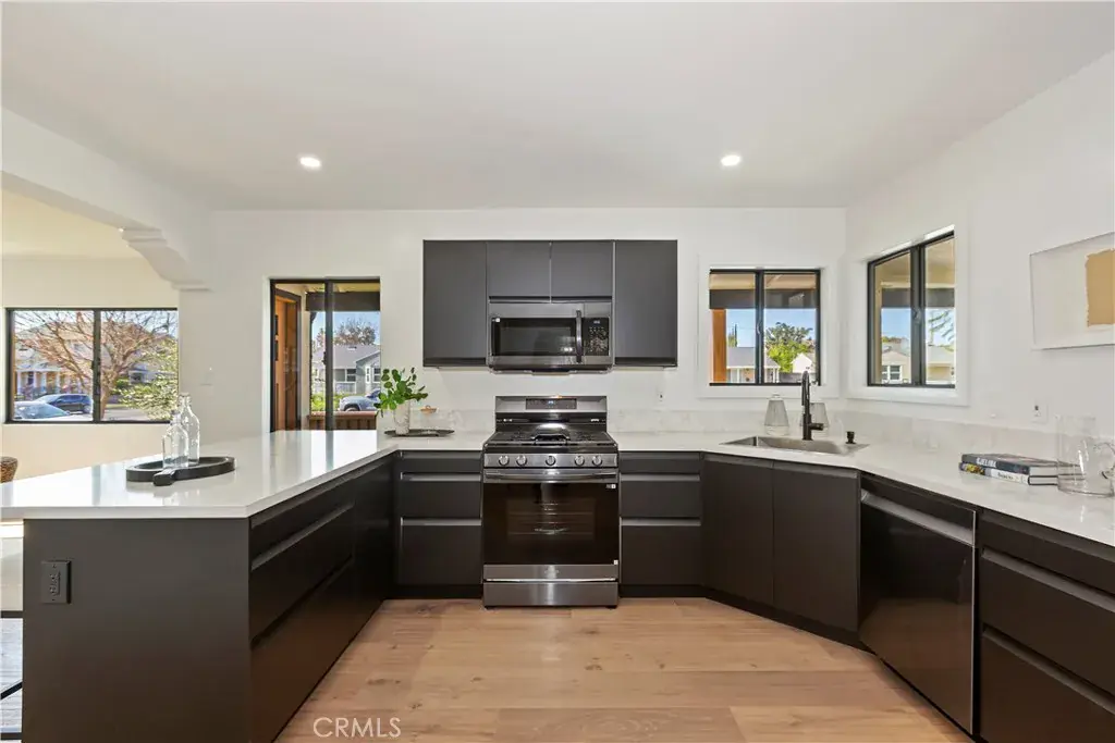 The single-story layout flows effortlessly, blending warmth and sophistication with contemporary design. Wide-plank engineered hardwood floors, abundant natural light, and custom solid wood doors create continuity and texture throughout. The welcoming living room opens seamlessly into a designer kitchen where quartz countertops, dark stainless steel appliances, and an open-concept layout invite both everyday living and effortless entertaining.