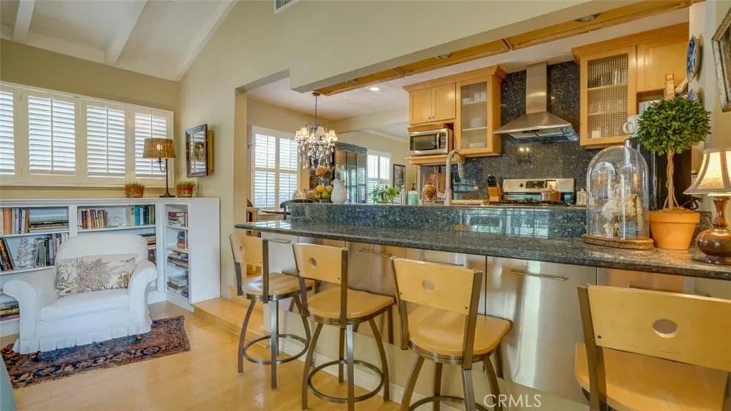 The remodeled kitchen features granite slab countertops, a quiet Bosch dishwasher, and a breakfast bar that opens seamlessly to the family room. A custom built-in entertainment center with integrated Bose speakers, flat-screen inset, HDMI connectivity, and surround sound pre-wiring makes the space perfect for movie nights and gatherings.