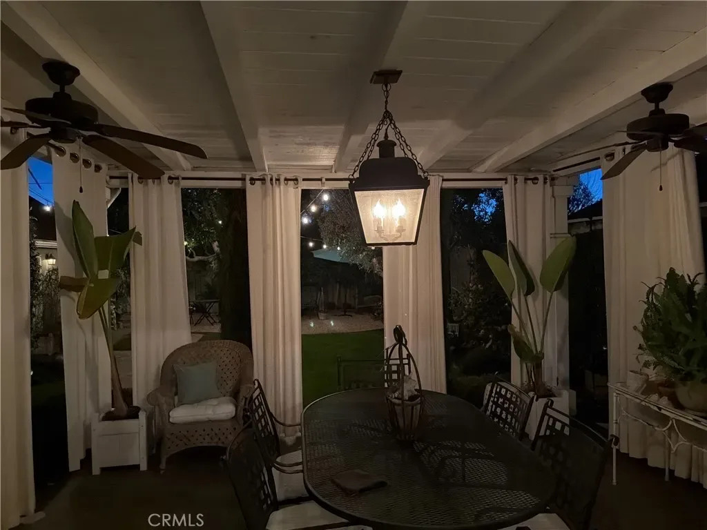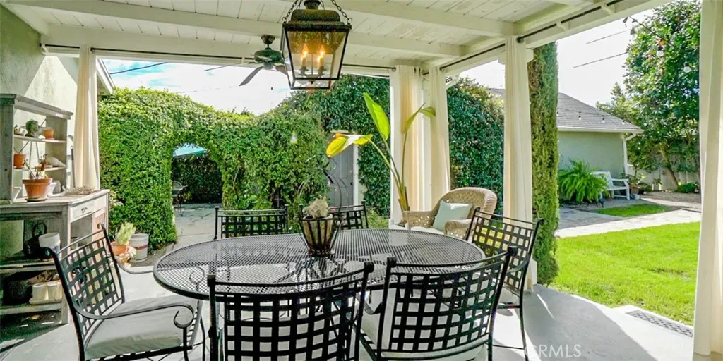 Step outside to an expansive covered deck overlooking a professionally landscaped backyard, offering the perfect balance of lush lawn and patio space. Accent string lighting creates an ideal setting for relaxing evenings or entertaining under the stars.