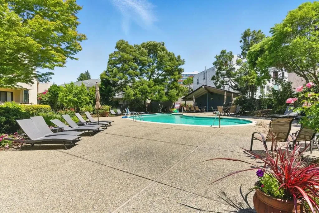 TOP Floor one bedroom and one full bathroom condominium residence ideally located near vibrant downtown Burlingame with its fine dining, shopping, library, an Apple store. Living room/dining room combination with access to spacious balcony overlooking the pool. The kitchen is equipped with built-in electric oven range, refrigerator, dishwasher, garbage disposal, with plenty of cabinetry and counter space. Laundry facilities are available in a community utility room. One-car garage + 2 storage lockers. Complex includes recreation/play room, exercise room, billiard/game room; pool, BBQ area.
