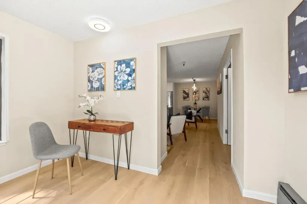 Priced to sell with very motivated sellers, this 2 bedroom condo in prime Burlingame located in close proximity to Burlingame Avenue and downtown! Spanning 993 square feet, this tastefully renovated condo boasts new hardwood floors throughout, updated open kitchen with new appliances, kitchen cabinets and counter tops,light fixtures and breakfast bar. This first floor corner unit is located at the rear of the building allowing abundant natural light into almost every corner of the home. Enjoy the comforts of a spacious living room leading to a light-filled sun room/office space with access to a concrete patio overlooking the common pool area. The light filled open kitchen comes fully equipped with all new modern appliances making meal preparation and entertaining a breeze. Adjacent dining area and counter top bar eases the service and consumption of meals. The flooring throughout the home ensures a clean and attractive look suitable for various interior design choices. The secluded main bedroom leads into the updated bathroom with double sinks and shower over tub. Convenience is key with an in-unit washer and dryer ensuring laundry tasks are handled with ease. Within the highly rated Burlingame school district. The condo comes with 2 assigned parking spaces in the common garage.