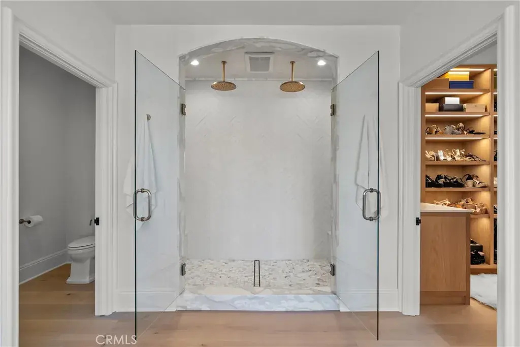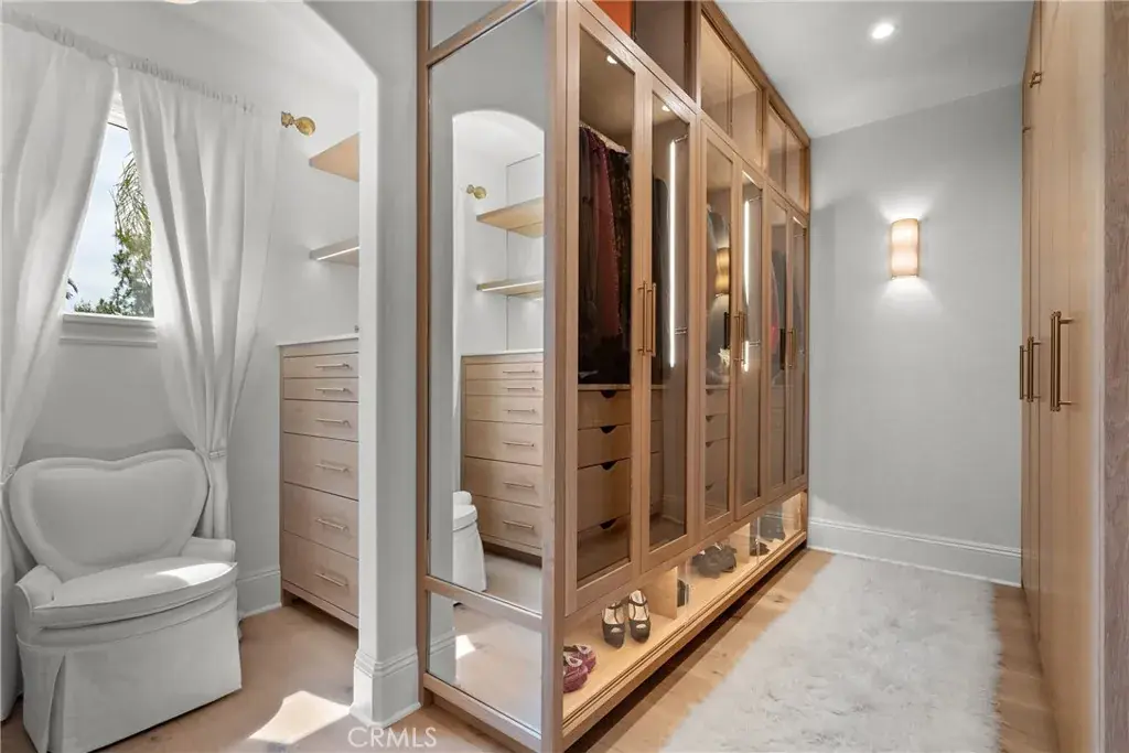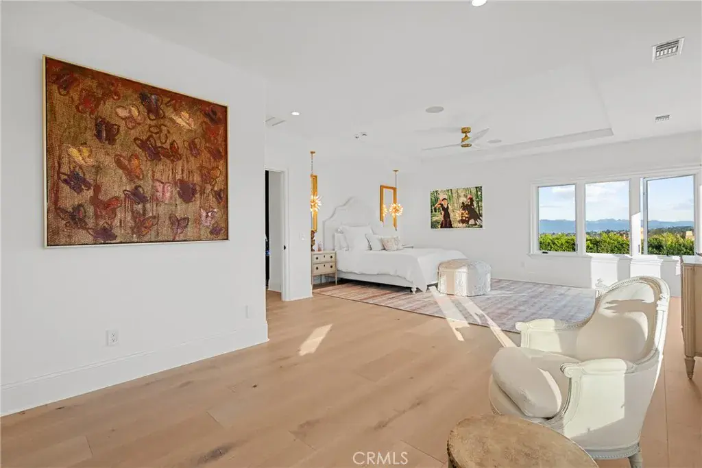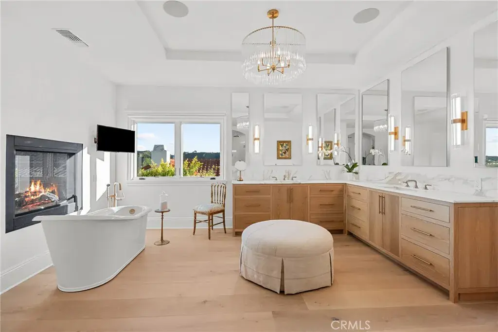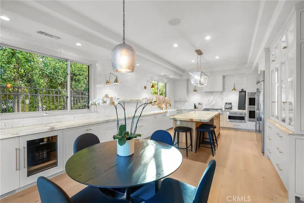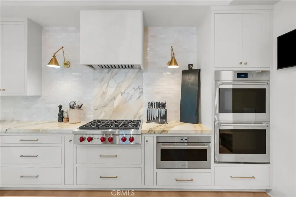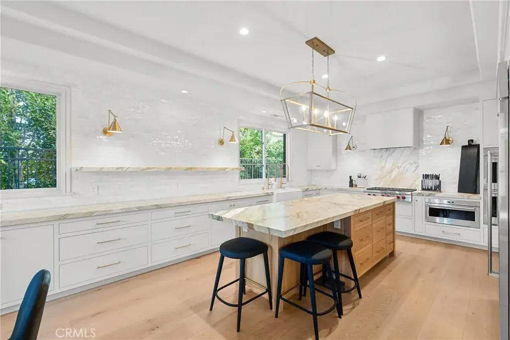 Welcome home to this stylish and elegant home in the guard-gated community of The Ridge in the heart of Calabasas. Situated near the end of a cul-de-sac, this extensively renovated home has been updated to the highest standards – with no expense spared – and is perfectly designed to enjoy indoor-outdoor living at its best. As you enter the two-story foyer, you’ll notice the gorgeous large slab limestone floors, an abundance of natural light, and beautifully appointed formal living and dining rooms on either side. Just beyond, the spacious family room with fireplace looks out over the entertainer’s backyard and flows into the show-stopping chef’s kitchen, featuring striking Calcutta Borghini marble counters and center island, Wolf appliances, custom solid flat sawn white oak cabinetry, and Zellige tiles. The lower level also includes an office overlooking the backyard, a bedroom with en-suite bath, and a fabulous powder room with a backlit onyx sink. The beautiful limestone extends upstairs, with 10″ wide European white oak wood flooring covering the remainder of the residence. Once upstairs, you find a generous loft/family room and a balcony with sweeping views. The private primary suite boasts stunning views, a two-sided fireplace, and a luxurious spa-like bath with a soaking tub, large walk-in shower, and dual custom closets – all crafted with timeless, high-end materials. The refined details extend to the secondary bathrooms, where you’ll also find solid white oak cabinets, hand-made and cut terra cotta and marble flooring, Zellige tiles, and premium fixtures. The backyard oasis features a pool and spa framed by beautiful hedges and includes a fire-pit, a bbq area with a pizza oven, a cozy dining area, and lush, sophisticated landscaping – perfect for both relaxing and entertaining. Finally, this home is outfitted with a tankless water heater, premium audio, and a comprehensive video security system.