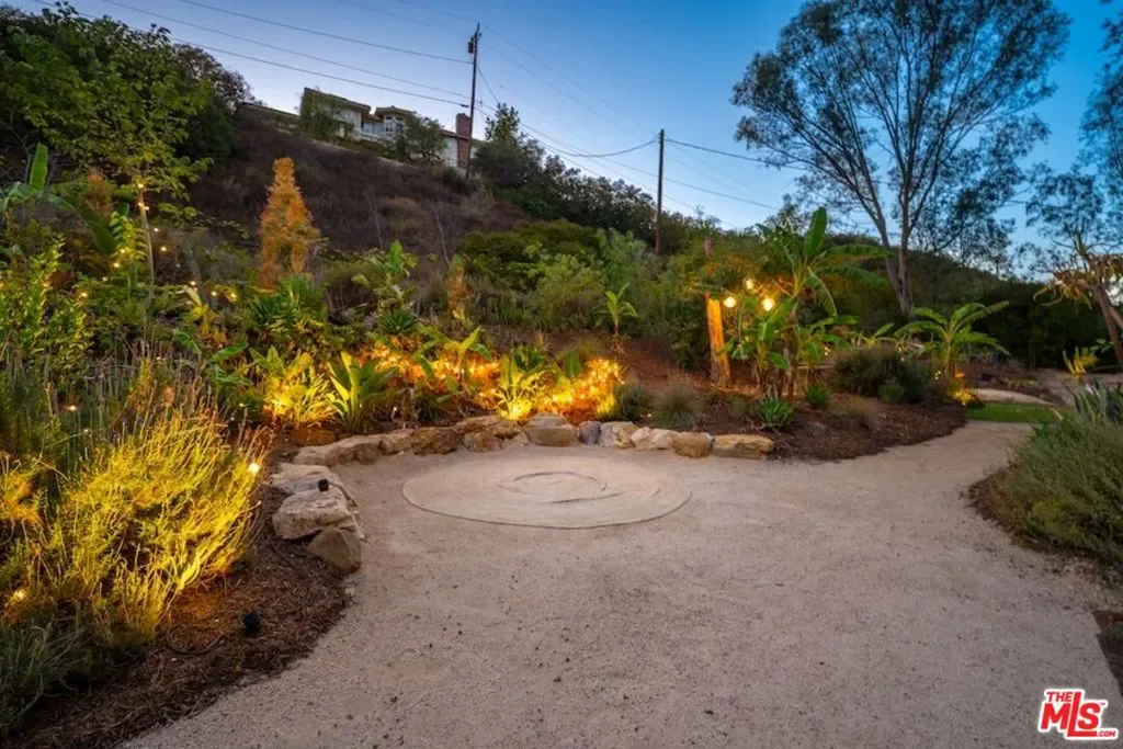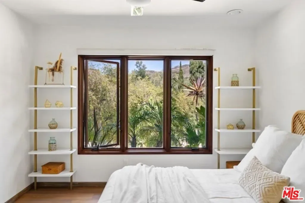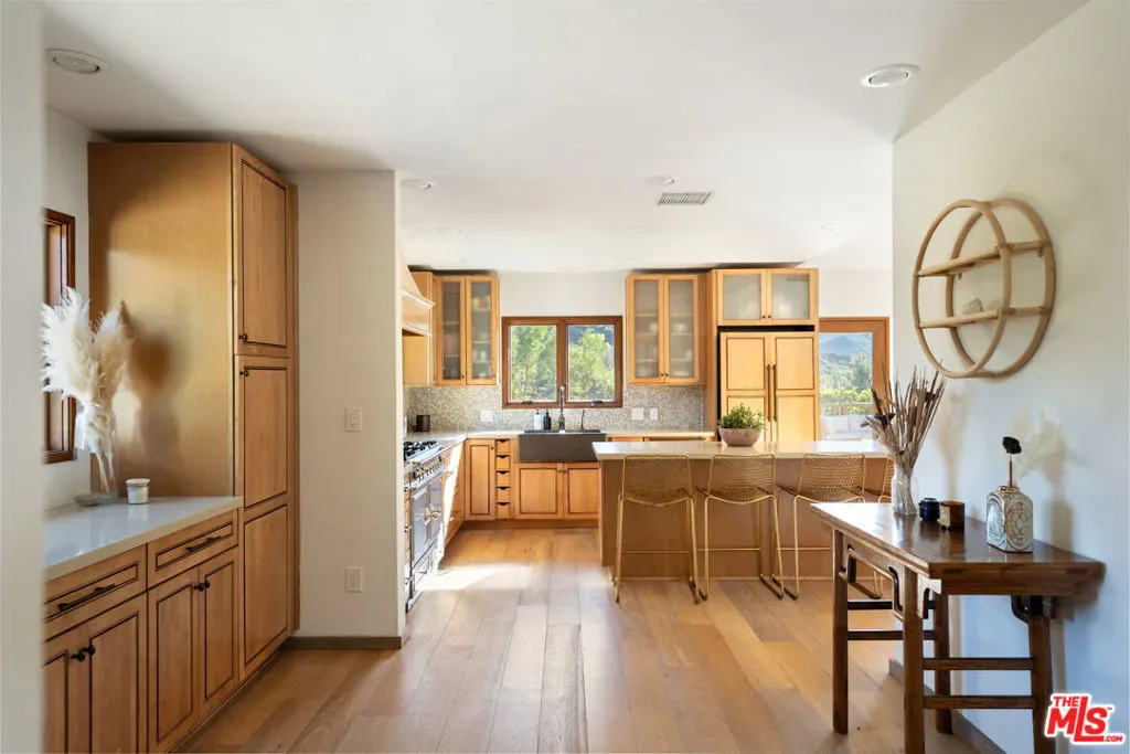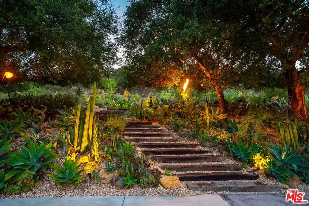A very special offering in Calabasas, this gated Zen contemporary mini-estate sits atop its own private promontory with serene mountain views overlooking the Mulholland Scenic Corridor. Set on over an acre of land, the property includes a large fenced area with excellent potential for horses, gardens, or additional outdoor amenities, offering a rare combination of privacy, flexibility, and connection to nature just minutes from city conveniences.The beautifully updated main residence features an open-concept floor plan filled with natural light, soaring ceilings, recessed lighting, white oak wood floors, and custom wood interior windows that seamlessly blend indoor and outdoor living. The great room flows into a generous dining area, creating an ideal setting for entertaining or everyday living. The island kitchen is a standout, featuring a rare La Cornue five-burner stove with pot filler, copper farmhouse sink, striking countertops with glass tile backsplash, and a center island for casual seating.Outdoor living is at the heart of the home, with sweeping views of the pool, gazebo, mountains, and expansive grounds. The grounds have been carefully and thoughtfully designed by Natural Earth Landscaping, featuring hundreds of mature plantings that create a sense of serene privacy and a tranquil, nature-forward aesthetic. The fully usable acre offers lush yet drought-conscious landscaping, meandering pathways, meditation gardens, fruit trees, and several beautifully curated outdoor spaces that invite relaxation, gatherings, and quiet reflection. Enjoy a sparkling saltwater pool, cold plunge, mineral-rich swim spa, BBQ area with outdoor refrigerator, and peaceful seating areas throughout the property, along with a natural amphitheater ideal for wellness activities and entertaining.The spacious primary suite offers a tranquil retreat with a steam shower and dual walk-in closets. Additional space includes an attached junior primary suite with a separate entrance and a detached bonus structure with kitchenette and deck space, currently used as a recording studio and creative workspace, offering versatility as a car barn, studio, or private retreat. A dedicated yoga studio and professional recording space further complement the property’s serene and creative atmosphere.Additional features include an owned solar system, Pella windows, ample on-site parking via a long meandering driveway, storage sheds, and open usable land ideal for equestrian use. Located just minutes from The Commons at Calabasas, Woodland Hills, top public and private schools, scenic hiking and horseback riding trails, and the beaches of Malibu, this exceptional property offers a rare opportunity to live, create, and thrive in a setting that feels like a private retreat while remaining close to everything. An absolute must see.