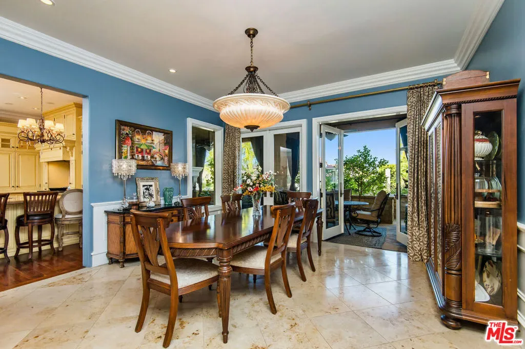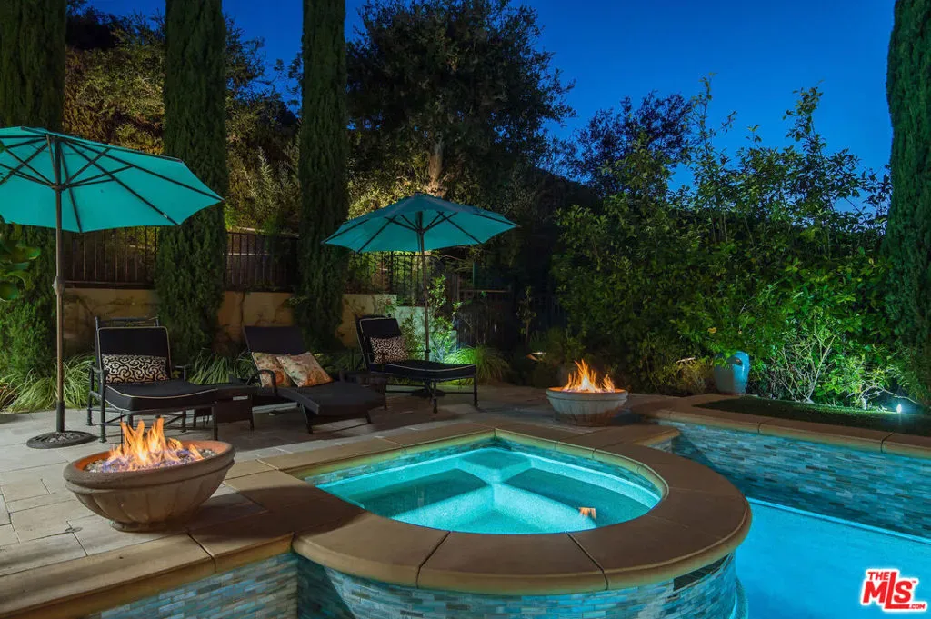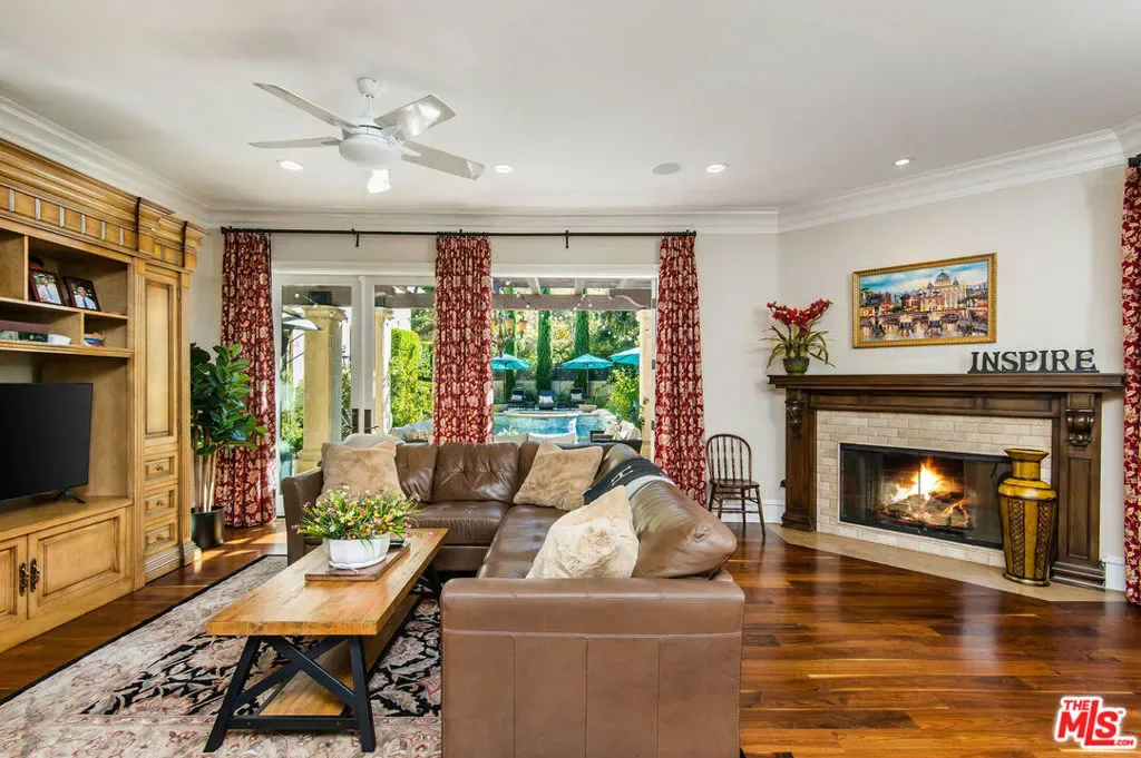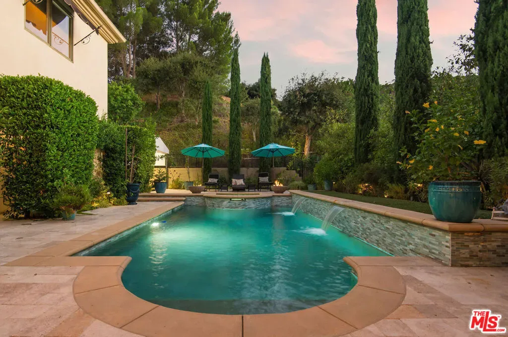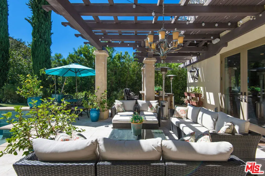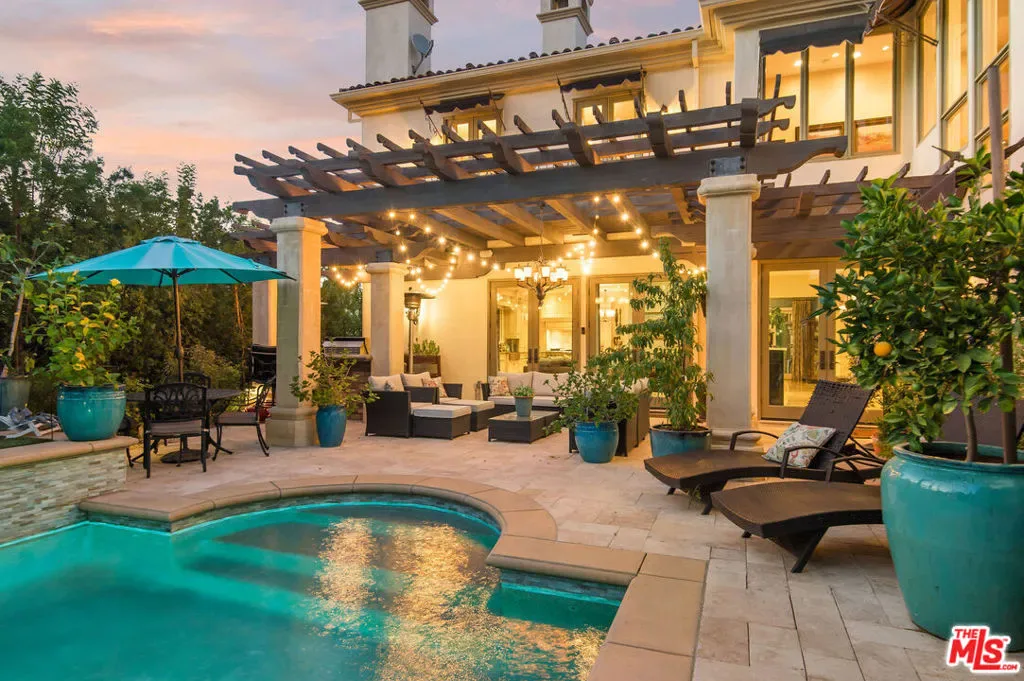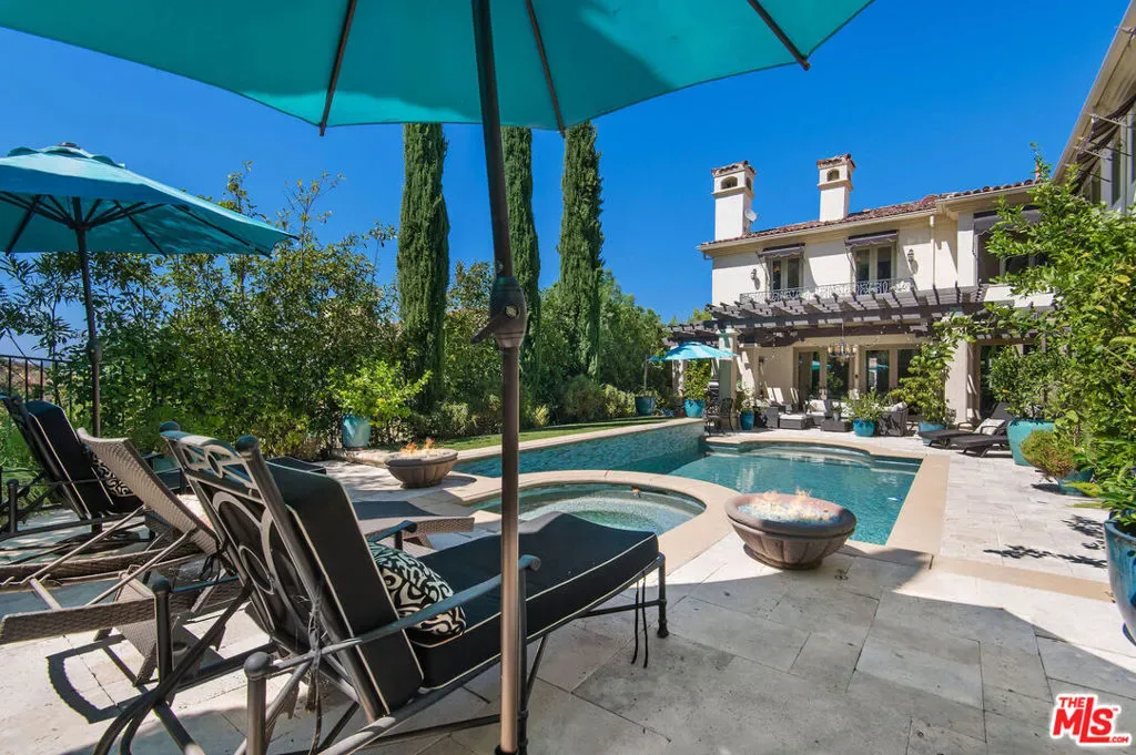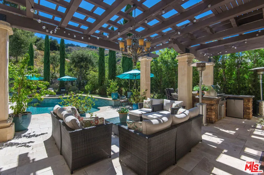 Tuscan Grandeur Meets Calabasas ChicStep into a masterclass of timeless elegance. This breathtaking villa blends Old World charm with modern scale, featuring an expansive open floor plan anchored by rich walnut and limestone flooring. Every inch is illuminated by sophisticated designer lighting, creating a warm, museum-quality glow throughout.The culinary wing is a true showstopper: a Chef’s kitchen featuring professional stainless steel appliances, granite island with breakfast bar, and the rare convenience of dual full-size dishwashers. Host unforgettable evenings in the formal dining room, where a coffered ceiling and a custom temperature-controlled wine closet set the stage for your finest vintages.The primary suite is a sanctuary of its own, offering a fireplace-warmed seating area and a marble-clad bath with an oversized soaking tub. Outside, the “Resort Life” awaitsvine-covered terraces, a stone wrap-around patio, and a sparkling pool framed by mature, lush gardens.