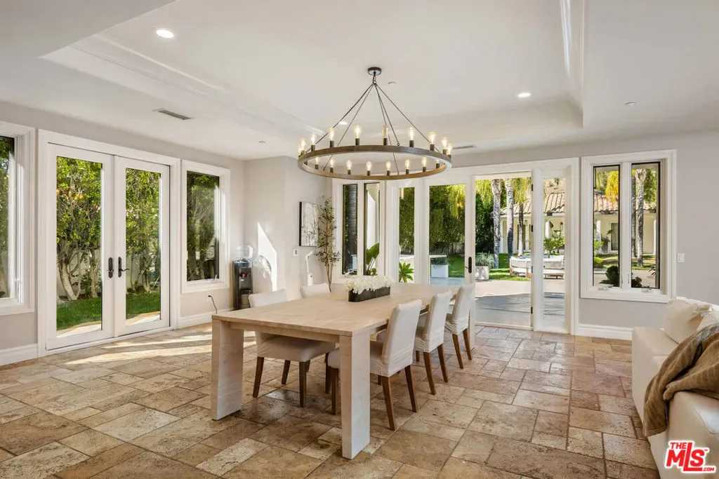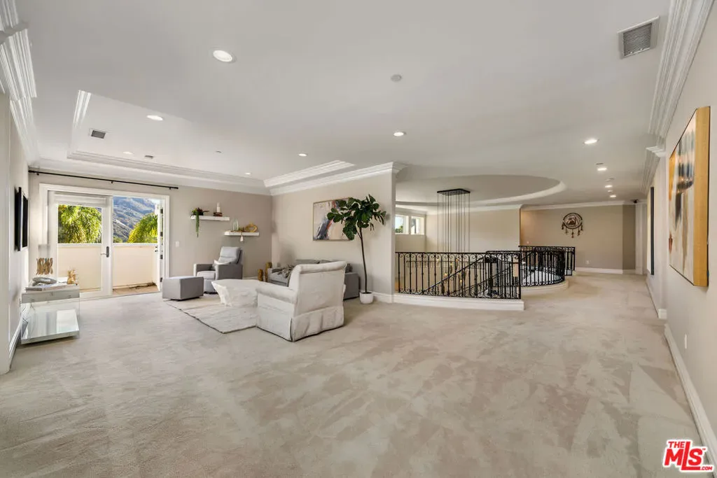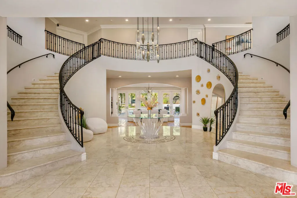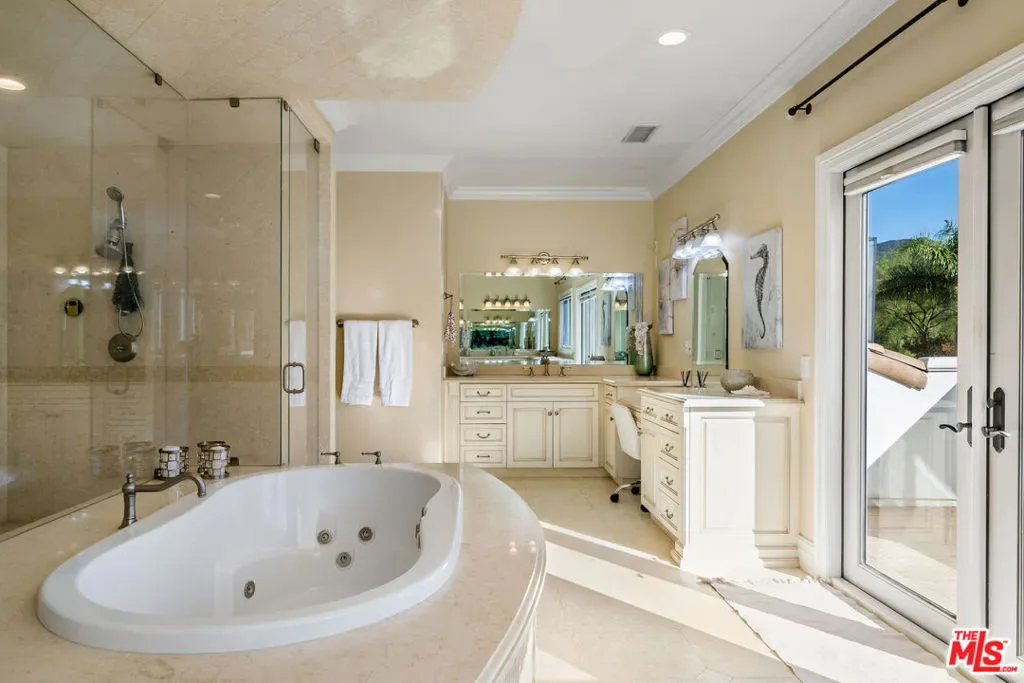 Tucked behind the coveted gates of Abercrombie Ranch Estates, an exclusive enclave of custom estates and celebrity residents, this breathtaking compound offers nearly ten acres of serene, unspoiled privacy. A long, private drive introduces the residence, revealing a grand architectural statement that blends timeless sophistication with the warmth of a true Calabasas retreat. Beyond the dramatic double glass doors, a soaring foyer unfolds around a sweeping dual staircase, setting an unforgettable tone of grandeur. To one side, the formal living room invites elegant gatherings beneath high ceilings and refined finishes; opposite, a gracious dining room provides the perfect setting for intimate dinners or lavish entertaining. At the heart of the home lies a chef’s kitchen designed for both beauty and function, featuring custom cabinetry, stone countertops, an oversized island, and professional-grade appliances all flowing seamlessly into a welcoming family room with fireplace and views of the resort grounds beyond. Upstairs, the private primary suite serves as a tranquil sanctuary with its own sitting area, fireplace, and balcony overlooking the estate’s lush landscape. The spa-inspired bath pampers with dual walk-in closets, a steam shower, and dual water closets. Three additional en-suite bedrooms surround a secondary lounge upstairs, while two more suites grace the main level, ideal for guests or multi-generational living.Outside, the grounds evoke the feeling of a five-star resort towering palms, vast lawns, and a glistening pool with Baja shelf and spa create an idyllic setting for leisure or large-scale entertaining. The outdoor kitchen and bar extend the home’s social spirit, while the detached pool house, complete with living room, fireplace, bedroom, and bath, offers a private guest hideaway. With two double-car garages, panoramic views of the Santa Monica Mountains, and a solar power system with full-house generator, this rare estate combines luxury, self-sufficiency, and unparalleled privacy all just minutes from The Commons, fine dining, and the vibrant energy of Calabasas life. A true sanctuary where luxury meets peace, sophistication meets seclusion, and every moment feels worlds away yet effortlessly close to everything.