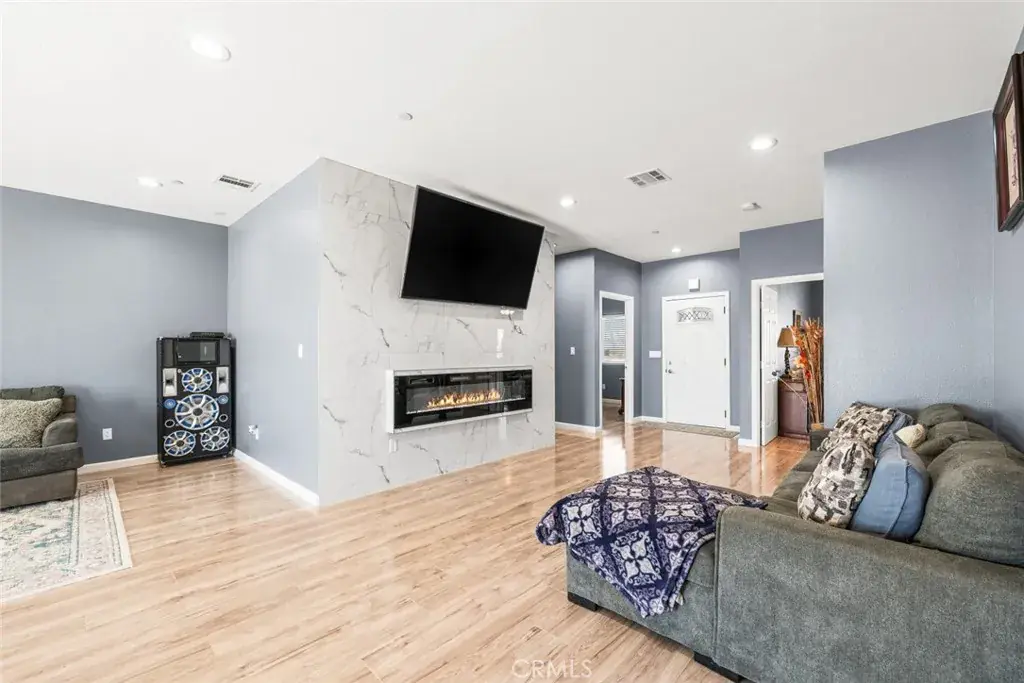 Inside, an expansive open floor plan filled with natural light creates an inviting atmosphere, ideal for both everyday living and entertaining. The heart of the home features a custom fireplace with an elegant marble backsplash, creating a warm yet sophisticated focal point. The spacious kitchen boasts quality flooring, a generous walk-in pantry, and seamless flow into the main living and dining areas.