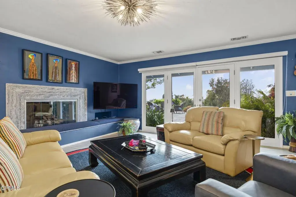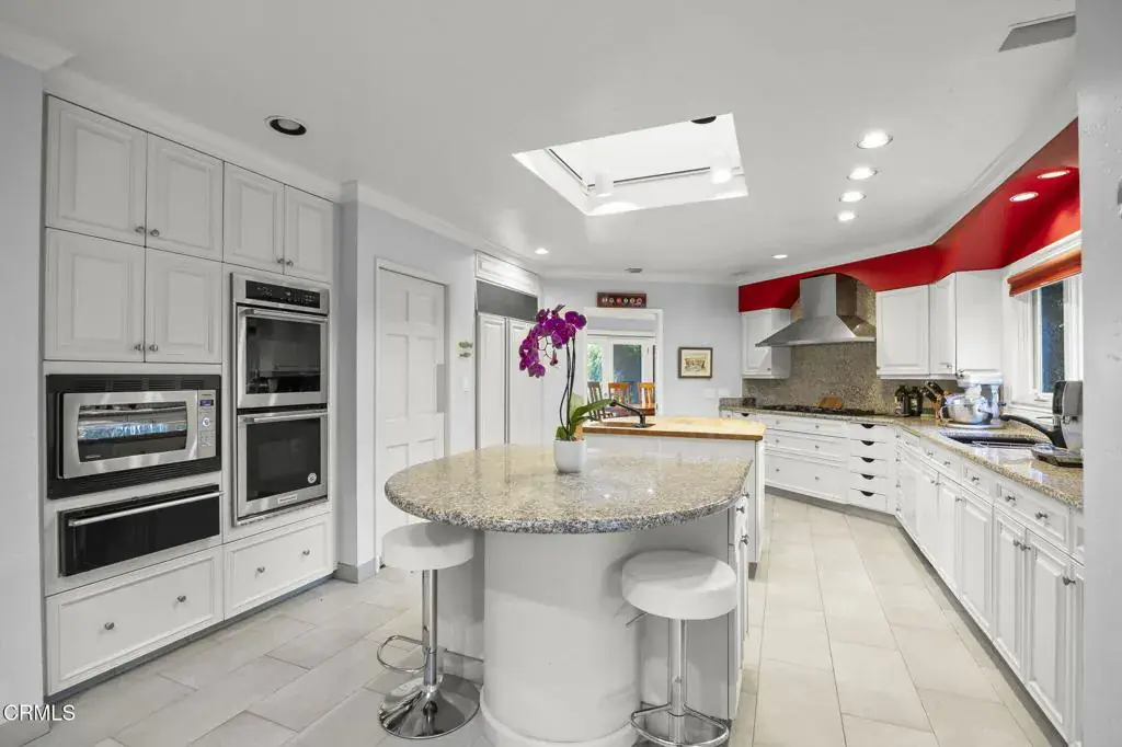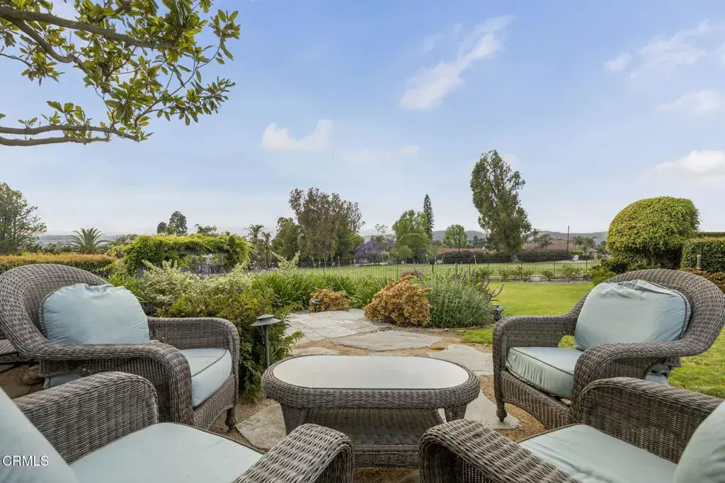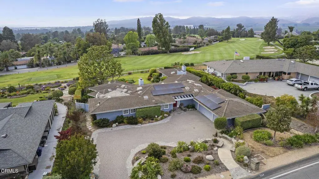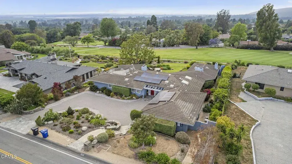 Back on the market with a incredible price improvement! Experience breathtaking golf course and mountain views from this stunning single-story home, ideally positioned on the 16th fairway of the Las Posas Country Club. Designed for true indoor-outdoor living, this property offers expansive multiple flagstone patios, lush landscaping, vibrant rose gardens, and a majestic magnolia tree–all framed by the natural beauty of the golf course. A gated path provides direct access to the fairway, perfect for a peaceful morning stroll or evening golf cart ride.From the moment you arrive, the home makes a refined statement with a oversized paver stone driveway, a bold red front door, and elegant flagstone entry. Inside, soaring ceilings, light wood-look tile flooring, skylights, and abundant natural light create an inviting, airy atmosphere. The home is thoughtfully equipped with an owned solar energy system and backup battery for energy efficiency and peace of mind.Views from almost every room! Formal living and dining rooms each feature a fireplace and French doors that open to the backyard, seamlessly blending indoor comfort with sweeping outdoor vistas. A third fireplace warms the secondary suite, offering a cozy retreat in its own private wing.The chef’s kitchen is both stylish and functional, with dual islands (granite for seating and butcher block for prep), white cabinetry, granite backsplash, and premium appliances. A walk-in pantry provides ample storage, while a built-in breakfast nook with yard access adds charm.The spacious primary suite is a true sanctuary, with French doors framing spectacular views, with a office enclave with built-ins, and a spa-like bathroom featuring a copper soaking tub, dual copper sinks, beautiful curved tiled custom shower, private water closet, and a boutique-style dressing room with custom extensive built-ins.Additional bedrooms offer crown molding, plantation shutters, mirrored closets, and built-in storage. The Jack-and-Jill bath includes a tiled tub/shower and skylight, while a marble-accented powder room adds a refined touch for guests.A well-appointed laundry room offers access to the side yard and a beautifully finished three-car garage with built-in cabinetry and extra storage.Capture this rare opportunity to own a thoughtfully upgraded home in one of Camarillo’s most prestigious golf course communities–where panoramic views and effortless elegance define everyday living.