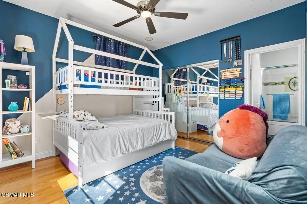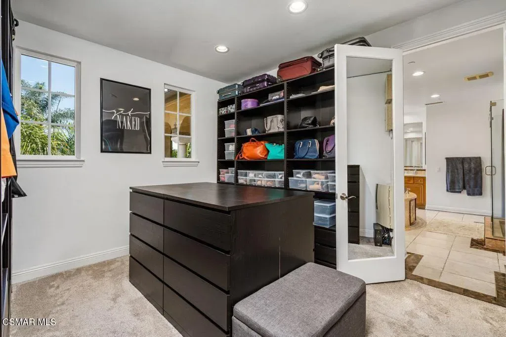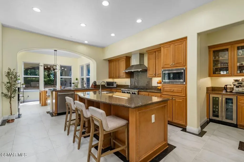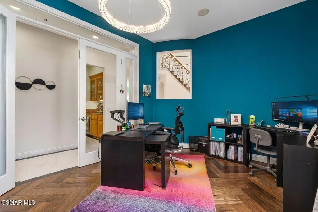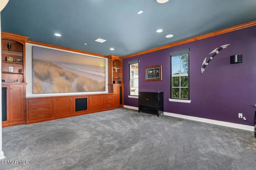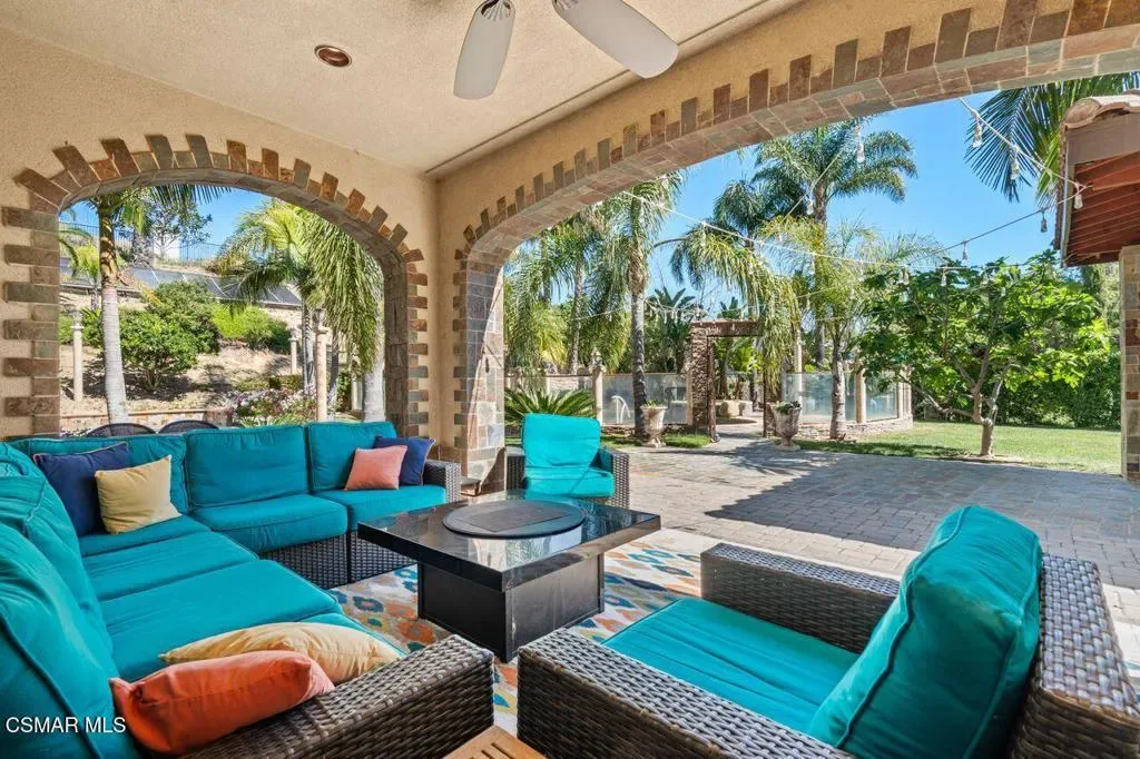 Resort-Style Mediterranean Ranch Living in the Heart of Camarillo. Experience the ease of California luxury in this beautifully appointed Mediterranean estate, where timeless architecture and relaxed indoor-outdoor living come together in a private, resort-inspired setting. From the moment you arrive, the home’s clay tile rooflines, and graceful arched entry set a tone of understated elegance and warmth. Step inside to a dramatic two-story foyer, where a sweeping curved staircase with wrought-iron detailing frames the space, and intricate travertine medallion flooring makes an unforgettable first impression. Natural light pours through the home, highlighting soaring ceilings, refined finishes, and a seamless flow between formal and casual living areas designed for both entertaining and everyday comfort. At the heart of the home, the chef’s kitchen blends functionality with style and features rich wood cabinetry, granite countertops, stainless steel appliances, and a generous center island perfect for gathering. Multiple living spaces offer flexibility and comfort, while a dedicated home theater/media room with custom built-ins creates the ultimate setting for movie nights and relaxed evenings in. Outdoors, the property truly shines as a private retreat. A resort-style, free-formed pool is surrounded by terracotta paver decking, and a poolside bathroom/dressing room, evoking a boutique hotel ambiance. The covered patio, framed by decorative brick, invites al fresco dining and year-round enjoyment, all set against a backdrop of mature tropical landscaping, including stately king and fan palms and meticulously manicured grounds. Private Guest House Retreat: Adding exceptional versatility, the detached guest house mirrors the main residence in both architectural charm and quality. Featuring one bedroom, one bath, in-unit laundry, and its own private patio, this self-contained space offers comfort and independence for extended family, guests, or potential rental income. With its cohesive Mediterranean styling–cream stucco exterior, clay tile accents, dark shutters, and terracotta paver details–it feels like a natural extension of the estate while maintaining its own sense of privacy. A rare offering that blends elegance, comfort, and flexibility, this Camarillo property captures the essence of refined Southern California living.