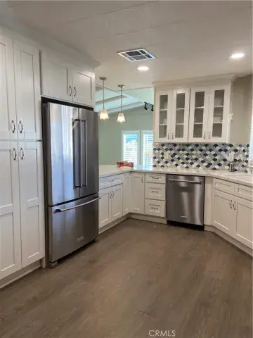 Looking for Quiet Relaxation? You don’t want to miss this Beautifully Remodeled Home in a 55+ park. 6 years ago with designer vinyl plank flooring throughout. The Kitchen was completely gutted and reimagined with quartz counters, all new cabinets and stainless appliances, Open to both Living Room and Family Room. The remodel included the Primary Bath Room which features Dual Vanity with custom lighting, Quartz counters. Separate bath and shower. Enjoy the year round amenities such as: 9-hole golf course, Olympic-sized pool, spa, steam rooms, clubhouse, billiard and card rooms. Carport facilitates 2 cars and a motorcycle and a storage shed. There is ample guest parking throughout the park. Check with Park Manager regarding RV parking.