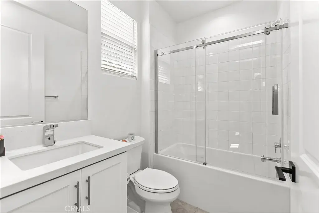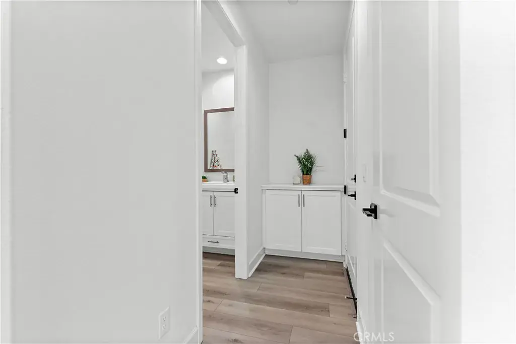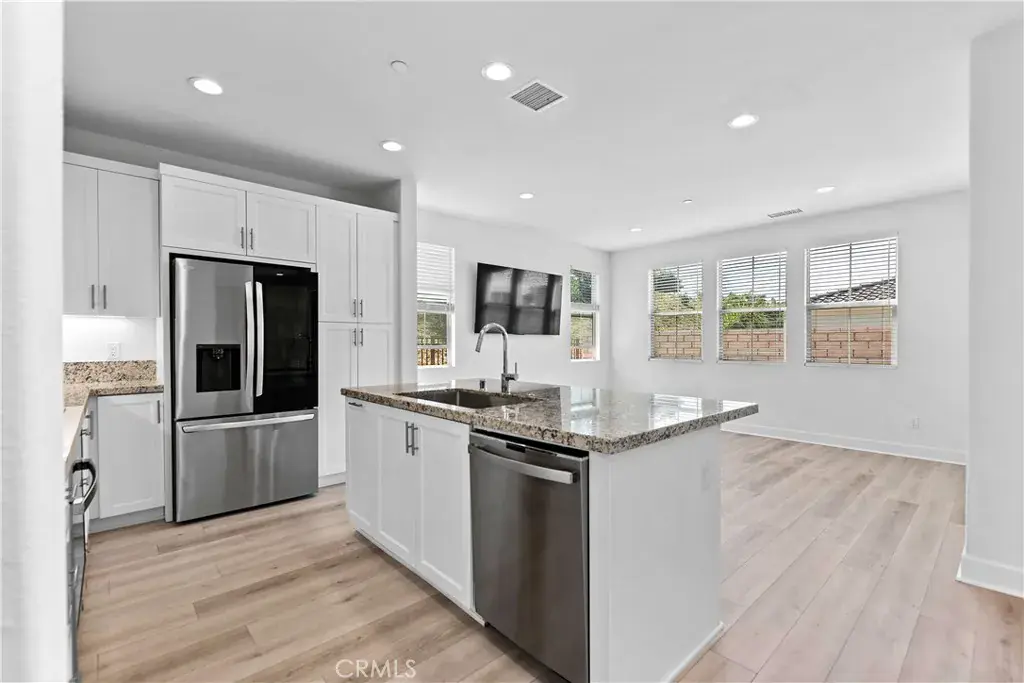 This home boasts an open floor plan accentuated by neutral-tone vinyl plank flooring, dual-pane windows, and stylish white wood blinds, creating an inviting and airy atmosphere. The kitchen is a culinary dream, featuring soft-close white shaker cabinets, sophisticated granite countertops, and premium stainless steel appliances, all beautifully highlighted by recessed lighting. The living area smoothly extends to a covered patio complete with a ceiling fan, making it a perfect spot for relaxation. Outside, you’ll find an extra-wide side yard and a private wrap-around patio that presents idyllic hillside views, ideal for entertaining or unwinding.