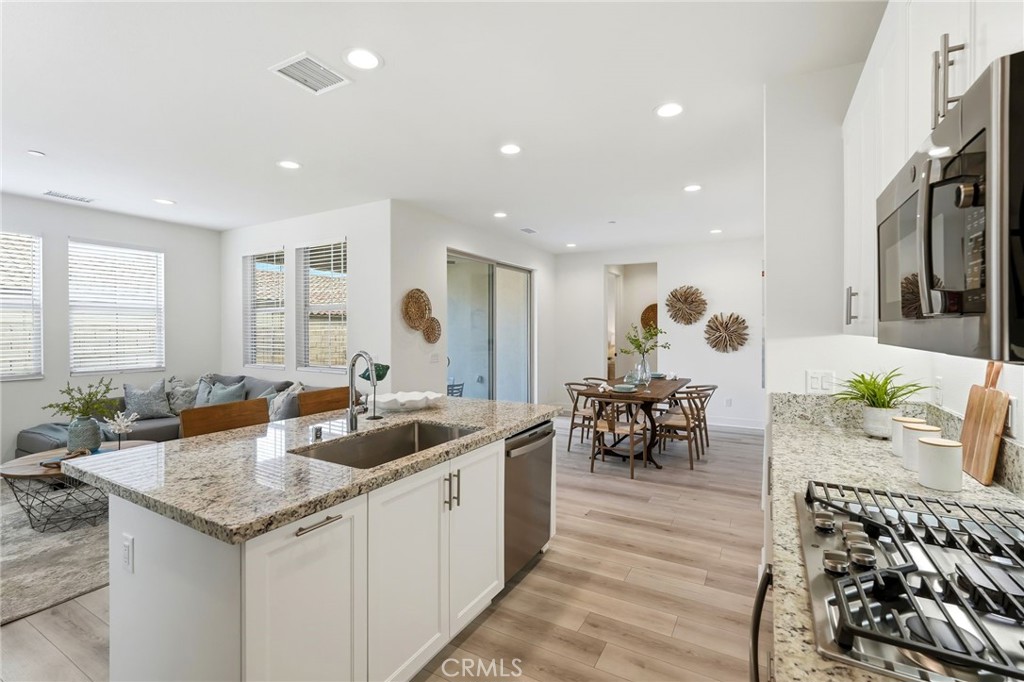 The open-concept floor plan is enhanced by luxury vinyl wood plank flooring throughout, providing durability with a warm, sophisticated aesthetic. Dual-pane windows and classic white wood blinds fill the home with natural light while maintaining privacy. The kitchen stands out with upgraded white shaker cabinetry with soft-close doors and drawers, granite countertops, stainless steel appliances, and recessed lighting—creating an inviting space for cooking and entertaining. The living area flows seamlessly to a covered patio with a ceiling fan, perfect for outdoor enjoyment.