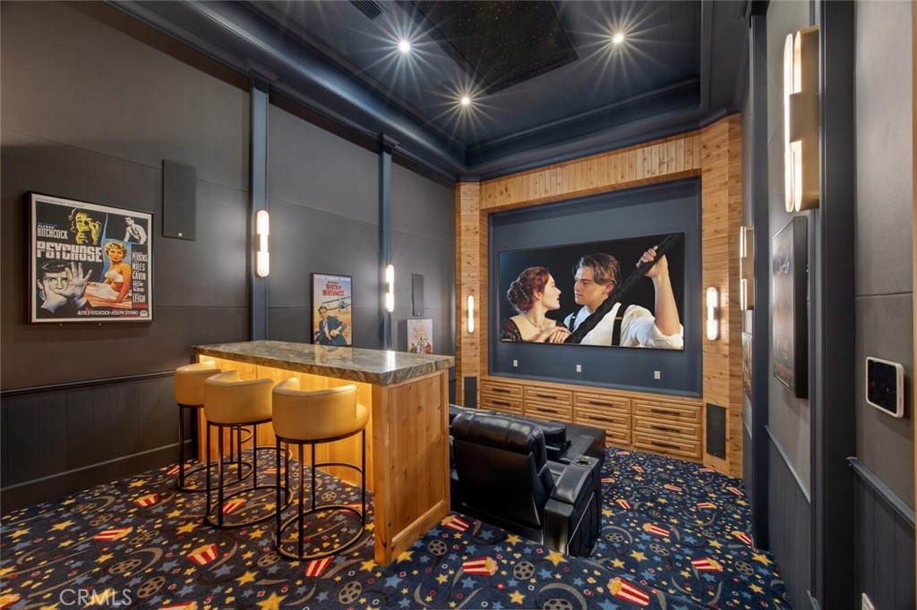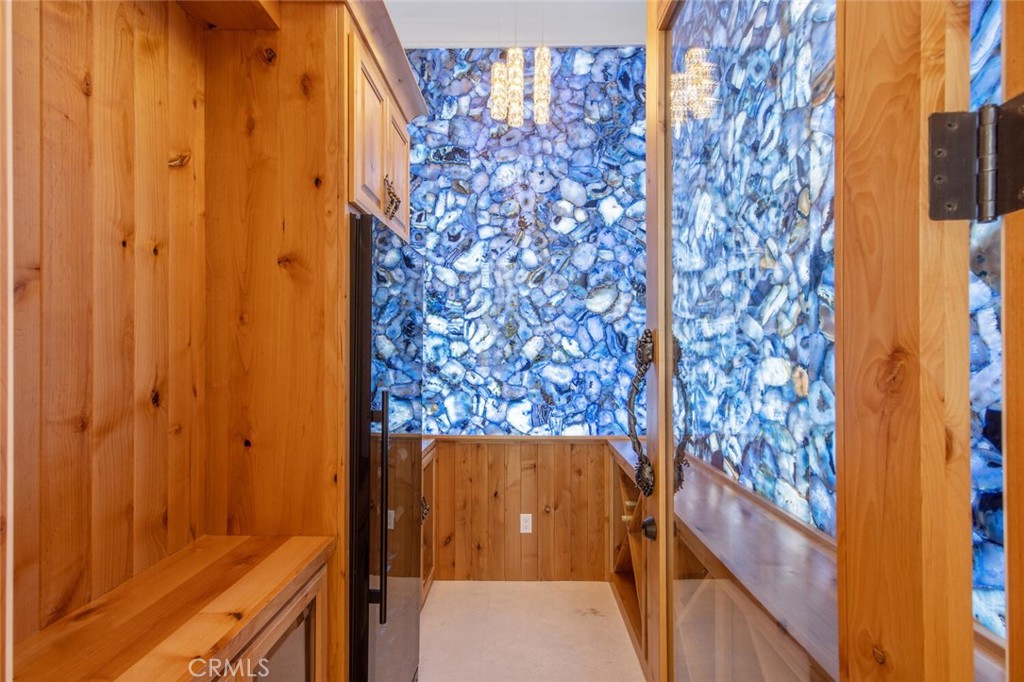 The wine room is a statement piece, clad in backlit gemstone slabs with custom alder racking and a 70-bottle refrigerator. A 50-foot gallery hallway leads to a show-stopping powder room and into thoughtfully designed private spaces, including a tiered theater with 140-inch screen and full bar, and a sophisticated study with quartzite fireplace and French doors opening to a secluded patio.