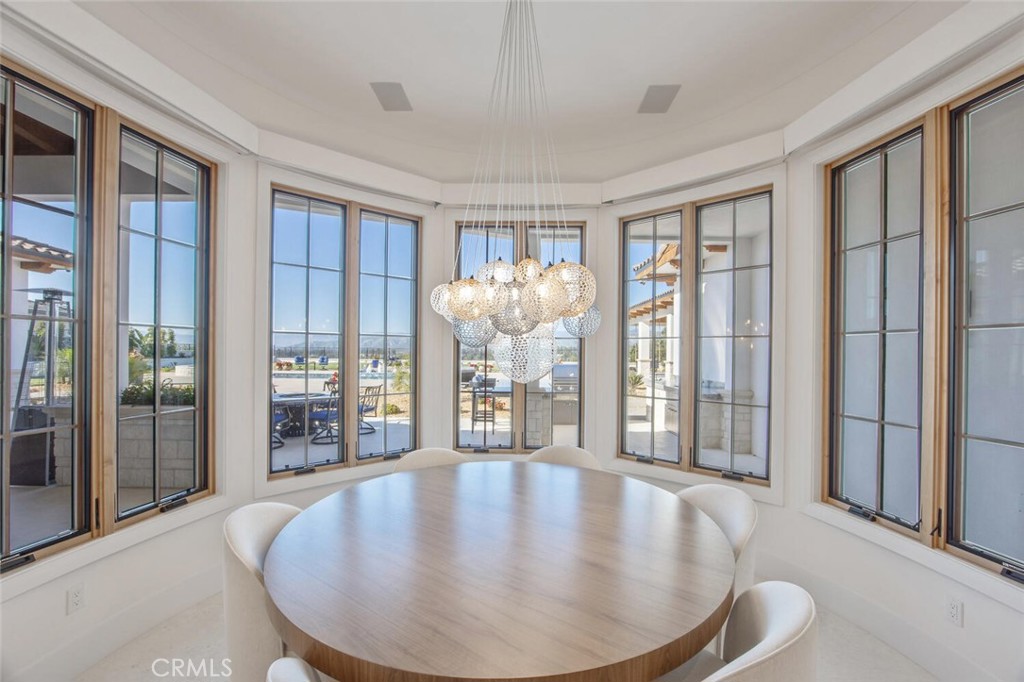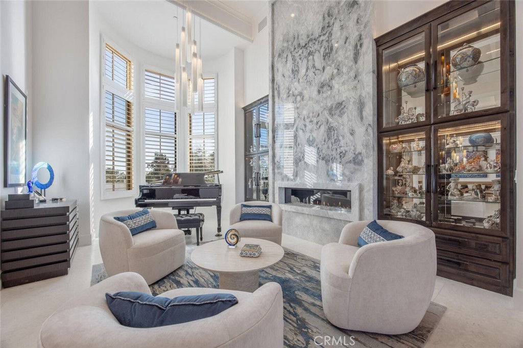 A dramatic foyer introduces Turkish white limestone floors, hand-applied Venetian plaster walls, and a sculptural multi-tier chandelier. Beyond, the great room soars to 26-foot ceilings with a limestone fireplace and expansive 20-foot disappearing nano doors that dissolve the boundary between interior and exterior living.