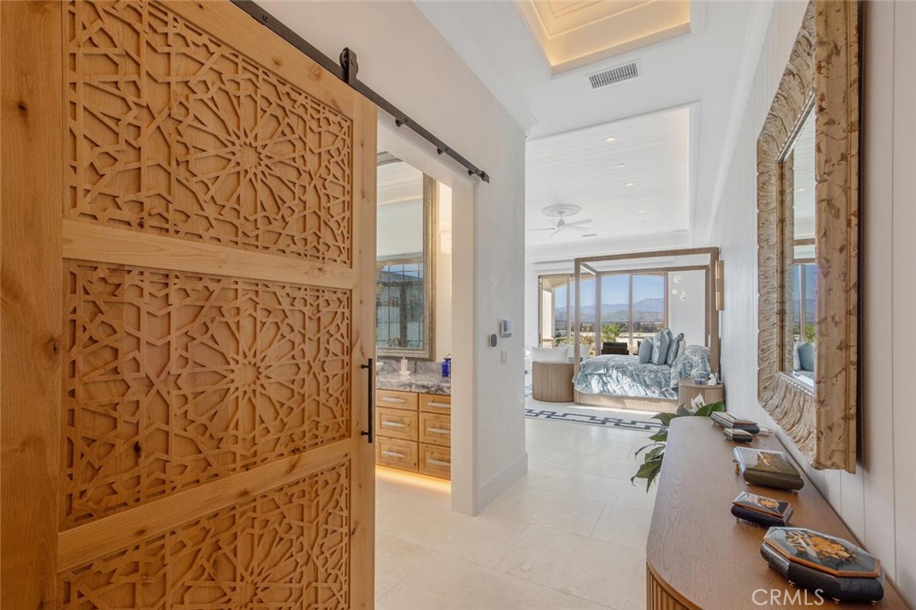 Three secondary bedroom suites feature bespoke finishes and private baths, with one currently styled as a gym overlooking pool and mountain views. The primary suite is a retreat of its own, complete with fireplace, nano doors to the yard, dual custom walk-in closets, and a spa-inspired bath offering a sculptural soaking tub, quartzite vanities, and an oversized backlit quartzite steam shower.