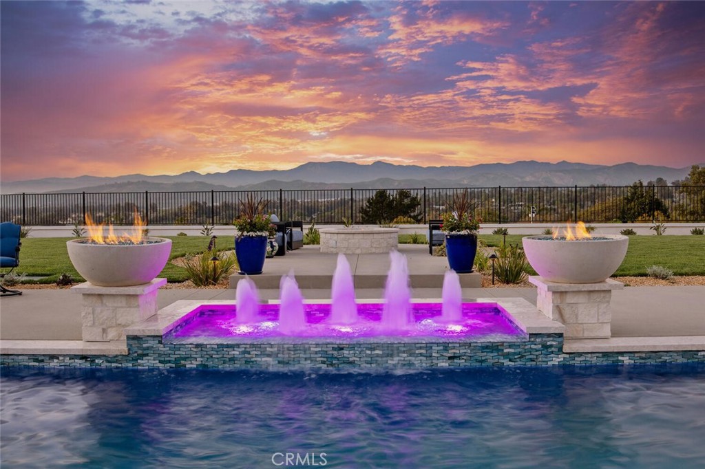 Outside, the gated motor court with permeable pavers leads to an oversized three-car garage. The resort-style grounds showcase a covered patio with wood-paneled ceiling, stone fireplace, and outdoor kitchen. The beach-entry pool features a 10-foot spa, waterfall, fire bowls, and tranquil fountain, complimented by designer pavers.