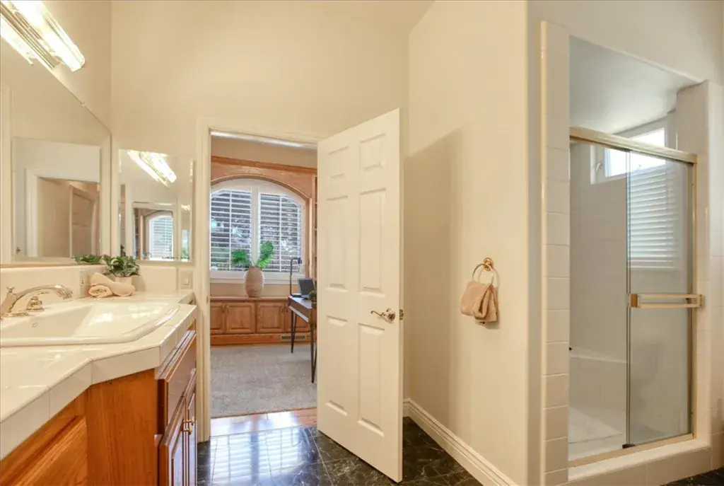 Come and enjoy this stunning three bedroom, 3.5 bath, 3,187 SF house in exclusive Leimert Estates. The home was designed by David Brown and built by BOA Constructors to include a primary bedroom that has both his and her closets, but also his and her bathrooms! Home also boasts SINGLE LEVEL LIVING, with no steps into the house from the garage, with the main level consisting of the kitchen, dining room, two separate living rooms, an office and the primary bedroom. Two additional bedrooms and a large bathroom are upstairs. There is a good sized room underneath the house which was used as an art studio, and a greenhouse close by. The half-acre grounds are beautifully landscaped with lots of drought tolerant plants, and the property backs up to open space, with lots of privacy. Call your Realtor today!