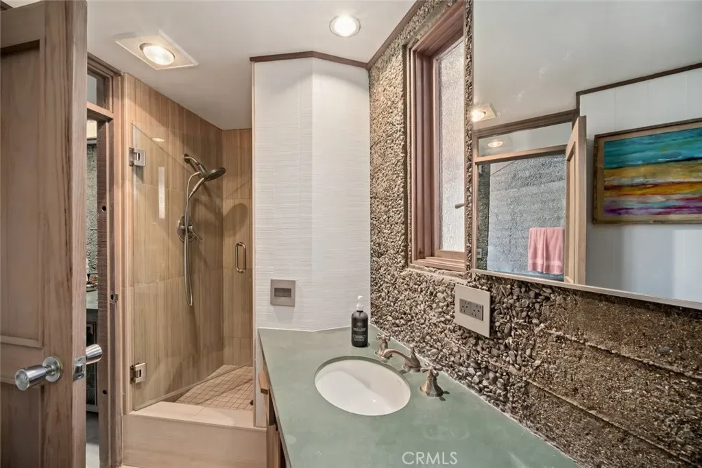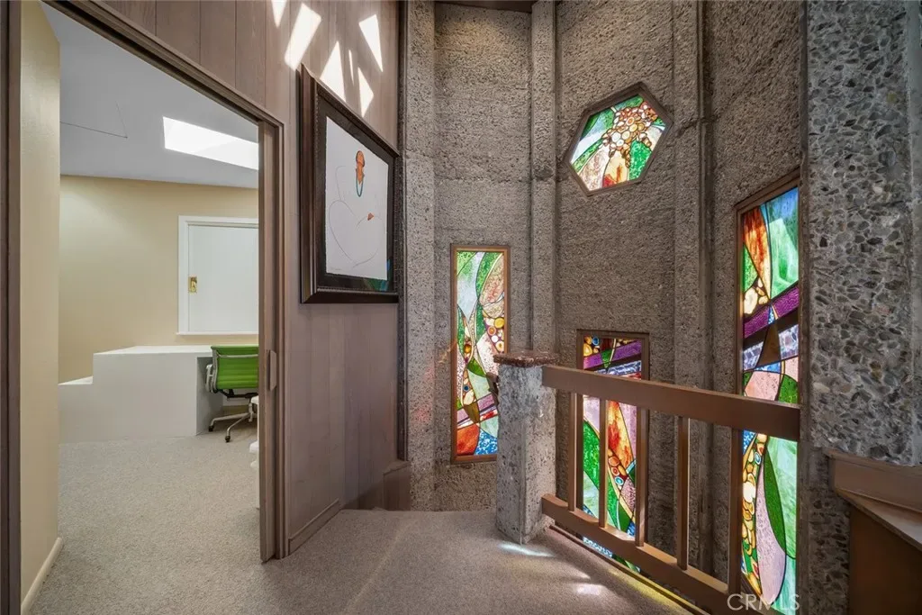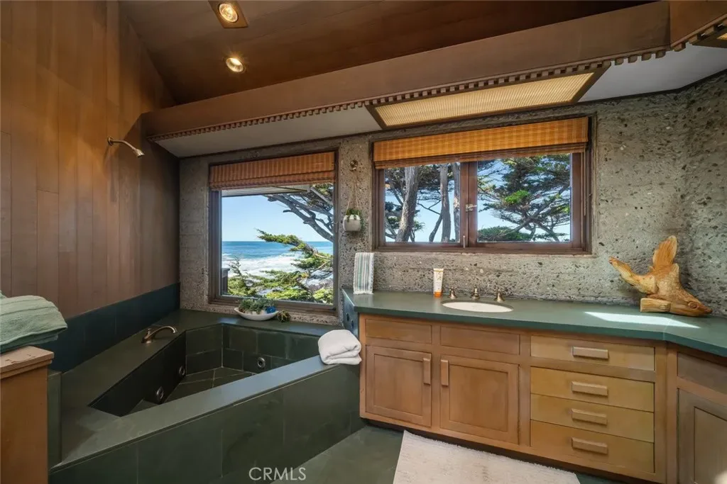 Set forward on a seawall-protected bluff, the home offers over 180 degrees of unobstructed panoramic ocean views, with daily sightings of whales, dolphins, otters, seabirds, tide pools below, and spectacular sunsets. Thick exposed aggregate walls frame expansive new dual-pane windows and signature stained glass—some inlaid with sliced agate—bringing exceptional light, color, and texture throughout.