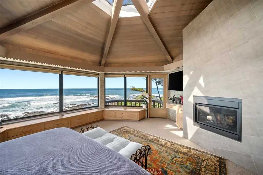 The open-concept kitchen, dining, and living areas are designed for both comfortable living and effortless entertaining. The chef’s kitchen features top-of-the-line appliances, custom cabinetry, and a generous granite island oriented toward the sea. Redwood beams, whitewashed redwood paneling, slate and stone surfaces, built-in seating, fireplaces, skylights, dentil detailing, and an indoor-outdoor bar enhance both function and character.