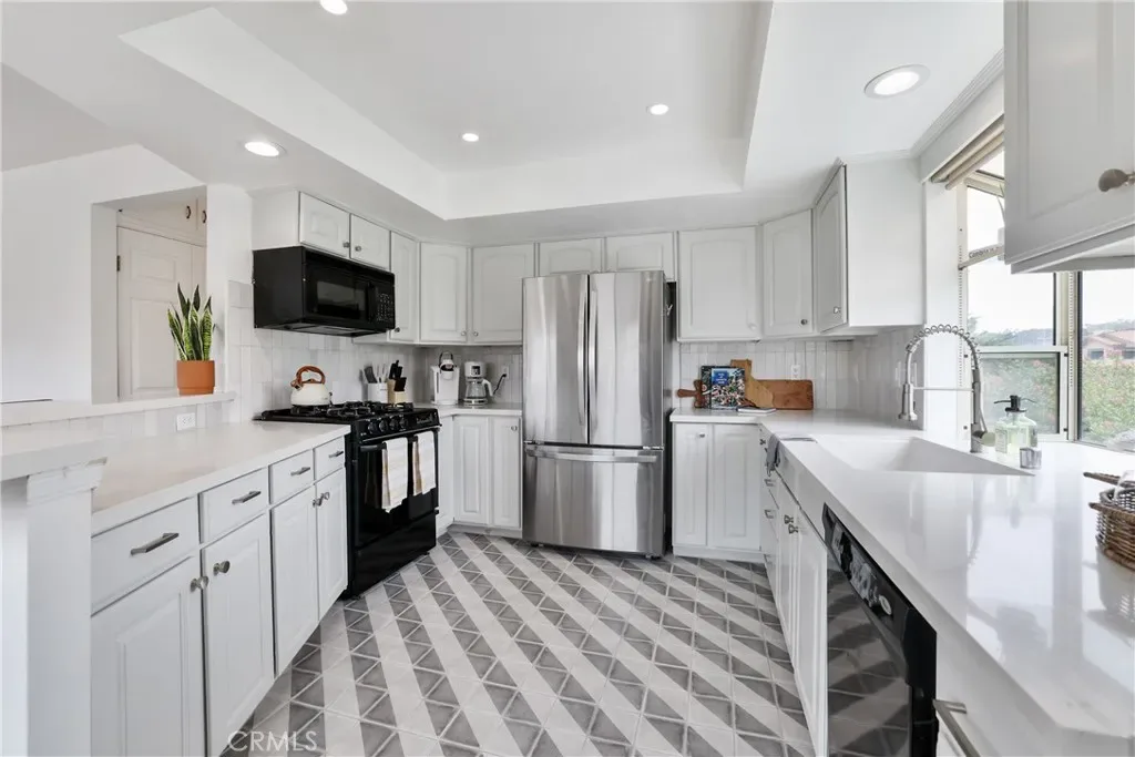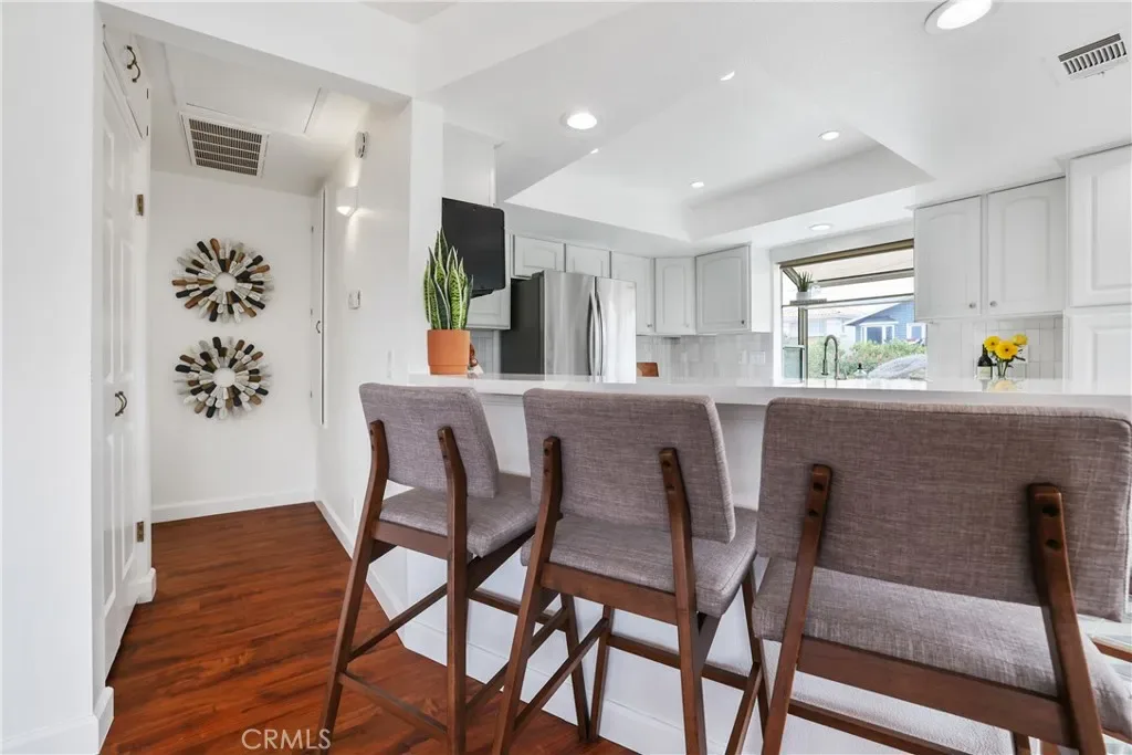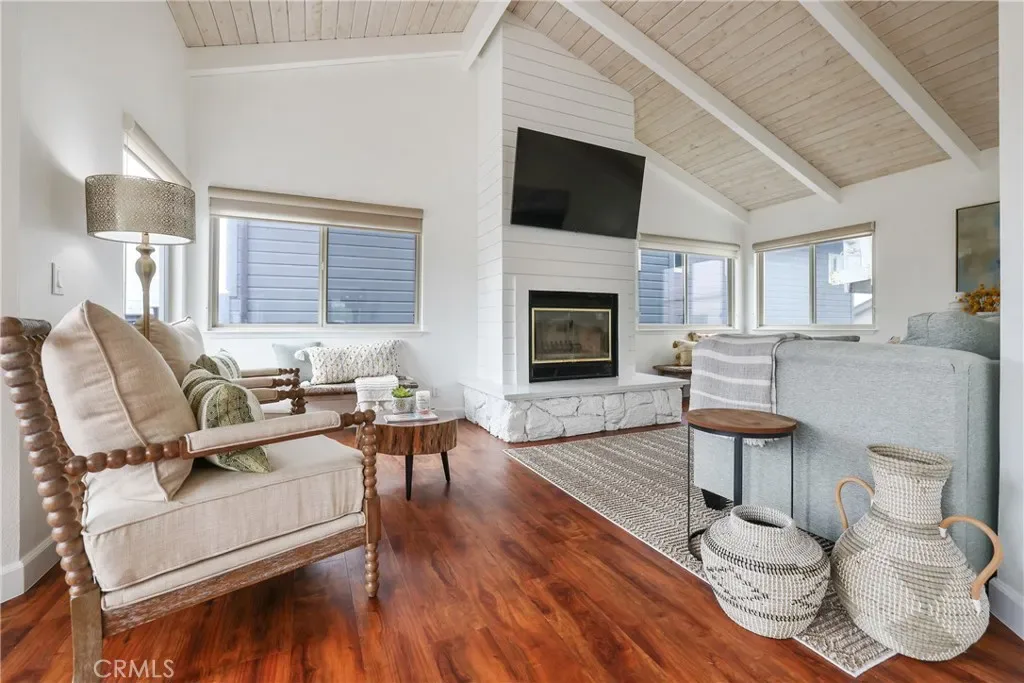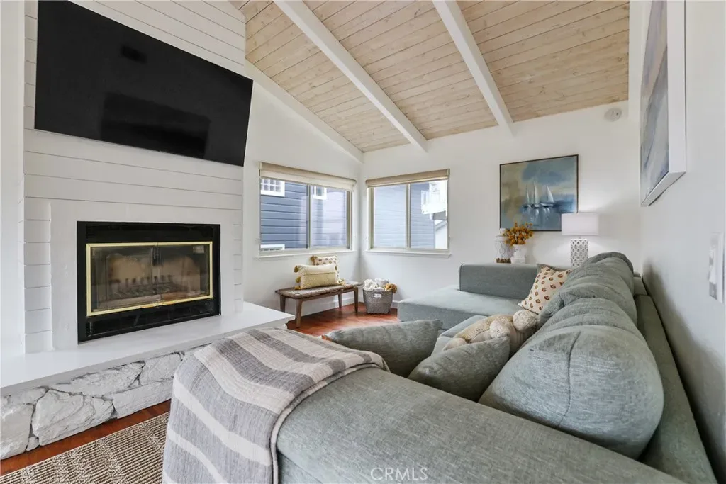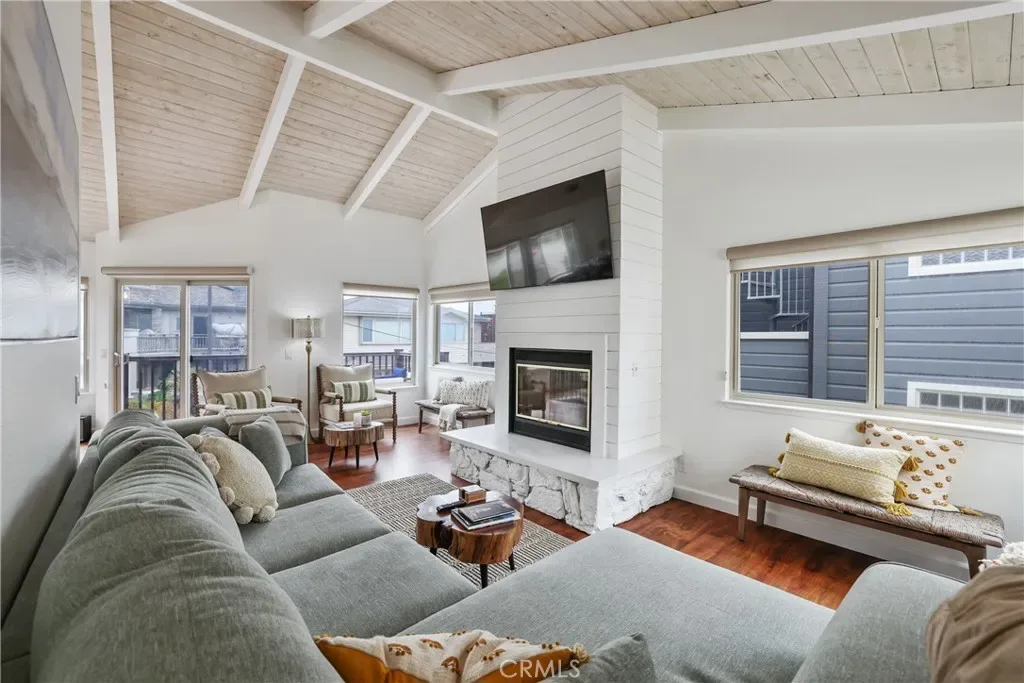 Bright, clean, and filled with natural light, the home blends modern comfort with timeless coastal charm. The classic white kitchen features elegant countertops, bar seating, and ample storage. A spacious dining area is surrounded by tall windows, while the living room showcases exposed wood beams and a cozy fireplace. Step out onto the balcony to enjoy partial ocean views and cool sea breezes.