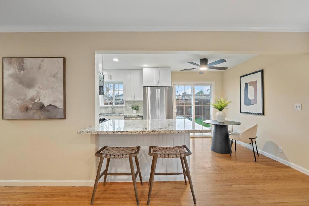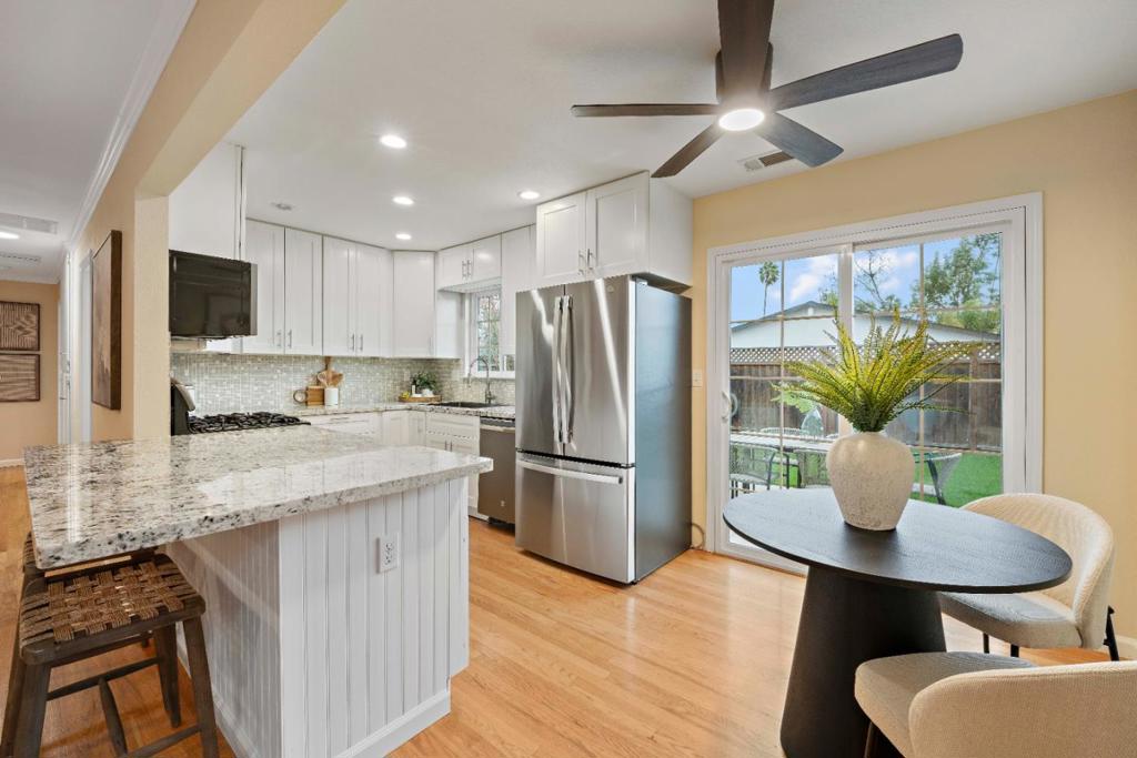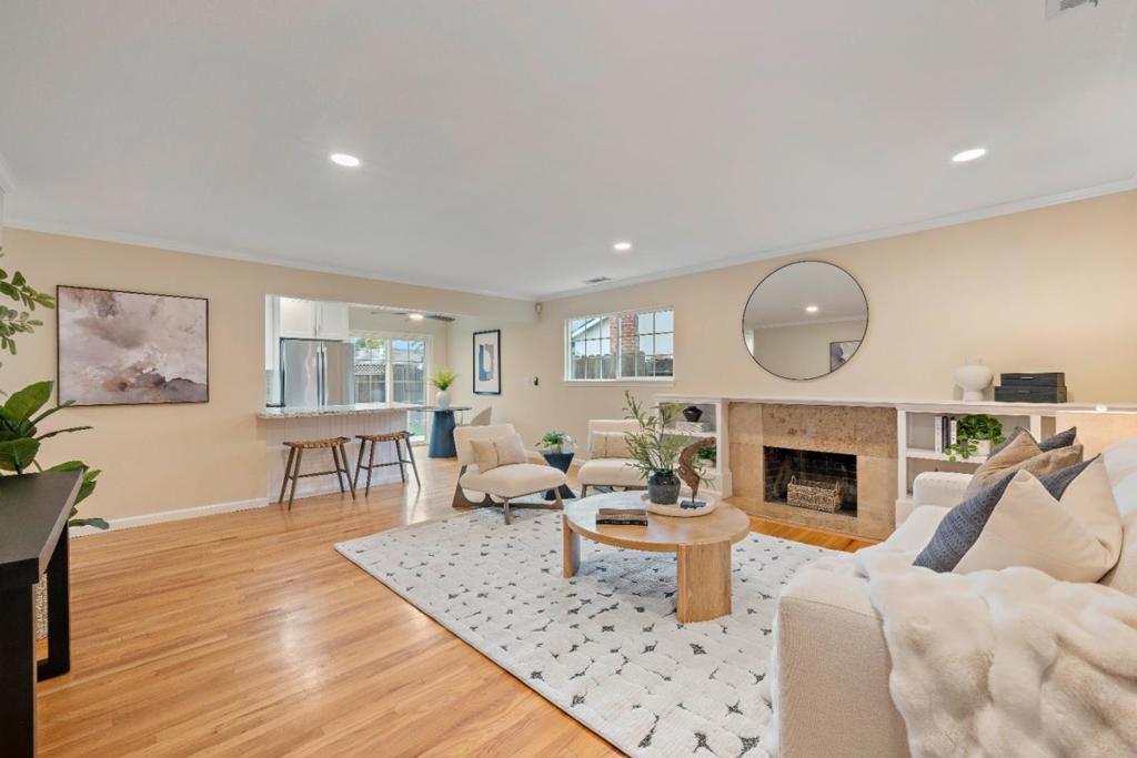 Welcome to 963 Connie Drive, a beautifully updated Campbell retreat blending modern style with effortless indoor-outdoor living. Step inside to warm hardwood floors, recessed lighting, and a light-filled living room with a cozy fireplace. The refreshed kitchen features white shaker cabinetry, granite countertops, stainless steel appliances, and a breakfast bar that flows seamlessly into the dining and living areas – perfect for everyday living and entertaining. The spacious primary suite offers direct backyard access and a remodeled bath, while two additional bedrooms provide flexibility for guests, a home office, or growing needs. Both bathrooms showcase tasteful updates and clean, contemporary finishes. Outside, enjoy your own private oasis. The low-maintenance front yard features striking drought-tolerant landscaping and excellent curb appeal, while the backyard offers a large patio, lush turf, and space to relax, play, or host gatherings under the palms. Located on a quiet street just minutes from downtown, parks, shopping, and major commute routes, this move-in-ready home delivers style, comfort, and convenience. Don’t miss your opportunity to make it yours.