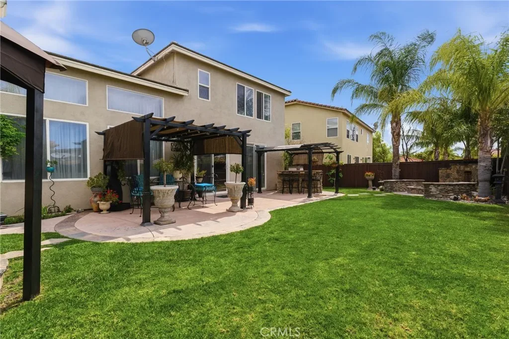 Step outside into your own private oasis, an entertainer’s dream backyard featuring a built-in jacuzzi, fire pit, tranquil water feature, covered patio, lush grass, and palm trees that create a peaceful, resort-style setting.