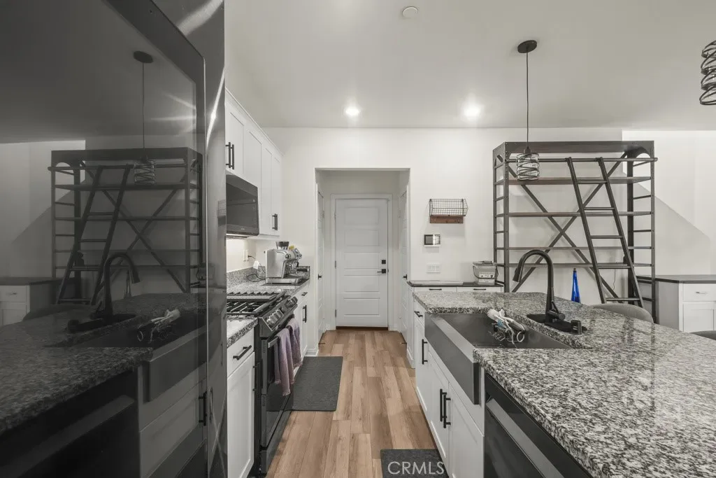 The upgraded kitchen is the heart of the home, featuring granite countertops, white cabinetry, a large center island, and stainless steel appliances, all designed to be both stylish and functional. Modern wood-type flooring flows throughout, enhancing the clean, contemporary feel while mountain views add a touch of natural beauty to your daily living.