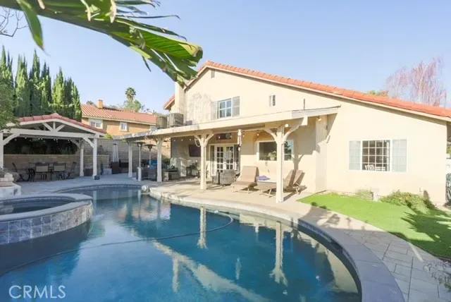 Exquisite two-story residence located in the highly sought-after American Beauty “Dean” tract, offering a perfect blend of refined design and resort-style living. This exceptional home showcases a stunning 3-year-old custom-built pool and spa, creating a private backyard oasis ideal for both relaxation and upscale entertaining. Step inside to a beautifully designed open-concept floor plan featuring new flooring throughout, expansive living spaces, and a warm, inviting fireplace. The gourmet kitchen flows effortlessly into the main living and dining areas, providing a seamless setting for gatherings and everyday elegance. A versatile downstairs room currently configured as a office can easily be converted back into a bedroom, offering flexibility to suit your lifestyle. Upstairs, generously sized bedrooms provide comfort and privacy, including a luxurious primary suite complete with a well-appointed bath. The outdoor living space is equally impressive, featuring a stylish gazebo, spacious patio, and meticulously designed areas perfect for entertaining or unwinding under the California sun. The property also boasts oversized paved RV parking, accommodating additional vehicles or recreational toys with ease. This remarkable home delivers sophistication, functionality, and resort-inspired amenities—an exceptional opportunity not to be missed. Home has solar lease and a Tesla Battery leased system! Seller states when power has gone out, theirs does not because it reverts right to the Tesla battery System! Solar system and Tesls battery is leased and buyer will need to assume payments. On a cul-de-sac and a whole house fan too!