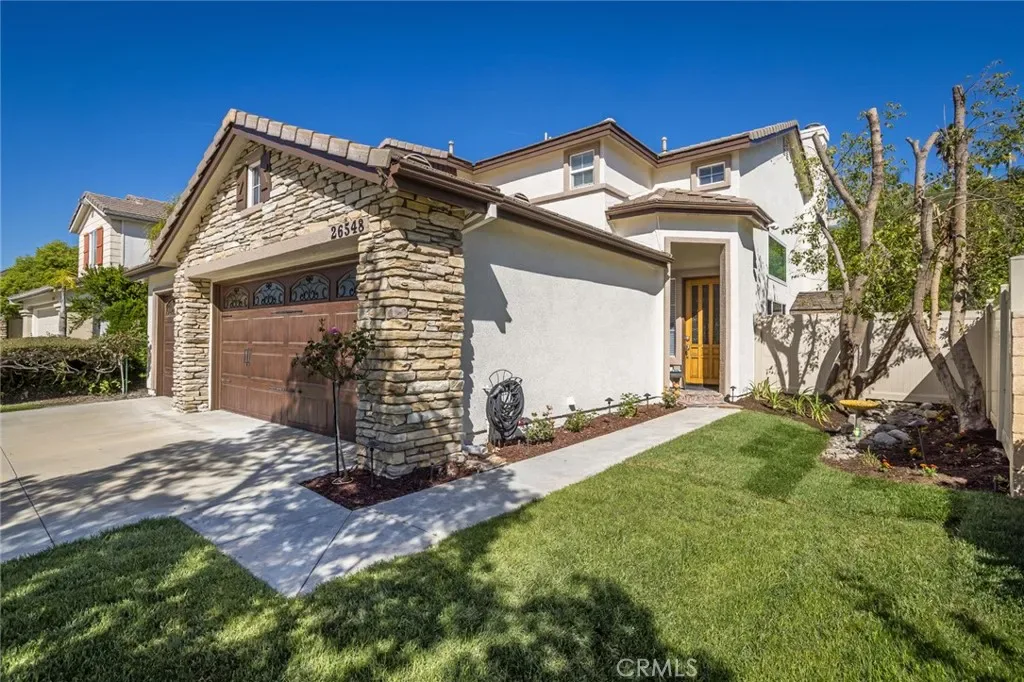 Welcome to 26548 Cardinal Drive, where warm character, thoughtful upgrades, and inviting indoor-outdoor living come together beautifully. This two-story home makes a strong first impression with its stone-accent exterior, beautiful landscaping and three-car garage. Inside, you’ll find soaring ceilings, abundant natural light, rich wood laminate flooring, and a spacious layout that feels both open and comfortable. The home offers multiple living and gathering spaces, including a dramatic main living area, a separate dining room, a cozy family room with a floor-to-ceiling river rock fireplace and office that could be a 4th bedroom. The kitchen is bright and functional with white cabinetry, granite countertops, stainless steel appliances, a gas range, and a large center island that opens nicely for everyday living and entertaining. The primary bathroom feels like a private retreat with a freestanding soaking tub, dual-sink vanity, and an oversized walk-in shower with designer stone finishes. Outside, the backyard is set up for relaxation and enjoyment with a covered patio, spa, mature landscaping, and hillside views that create a peaceful setting for morning coffee or evening gatherings. Leased solar system in place; buyer to assume lease. A valuable feature for energy-conscious buyers seeking improved efficiency and lower monthly utility costs. If you’ve been looking for a home with character, space, upgraded finishes, and inviting outdoor living, this one checks all the boxes without trying too hard.