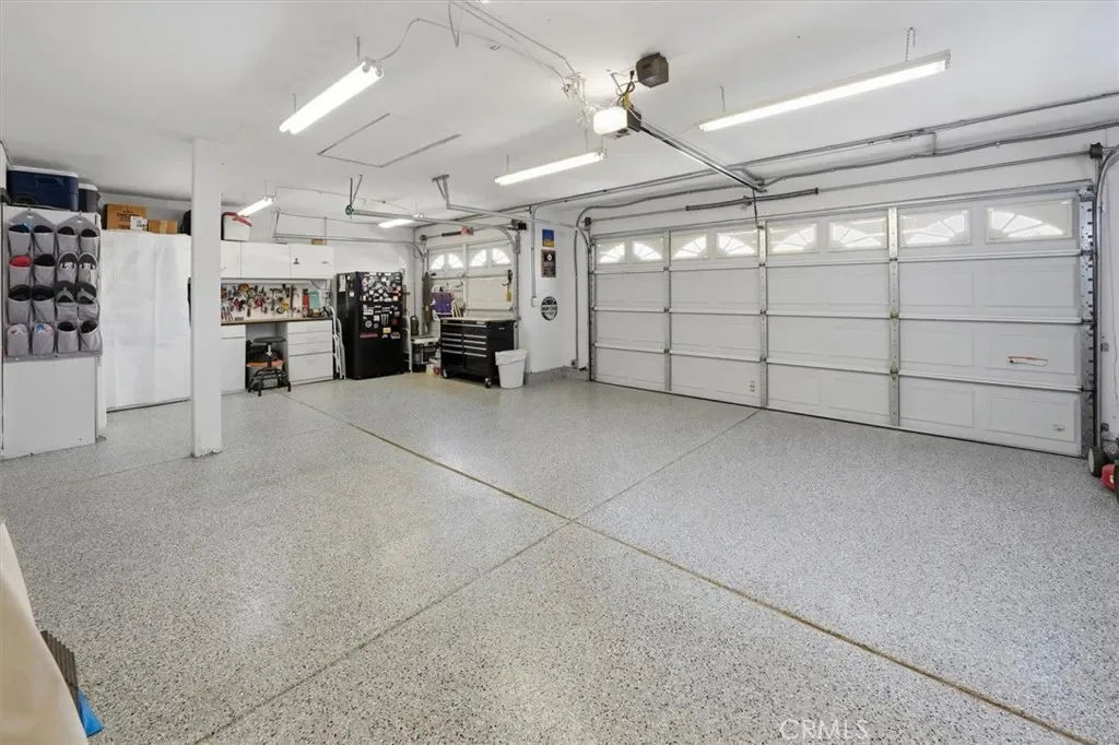 Additional highlights include ceiling fans throughout and a direct-access 3-car garage with epoxy flooring, built-in cabinetry, and a workbench.