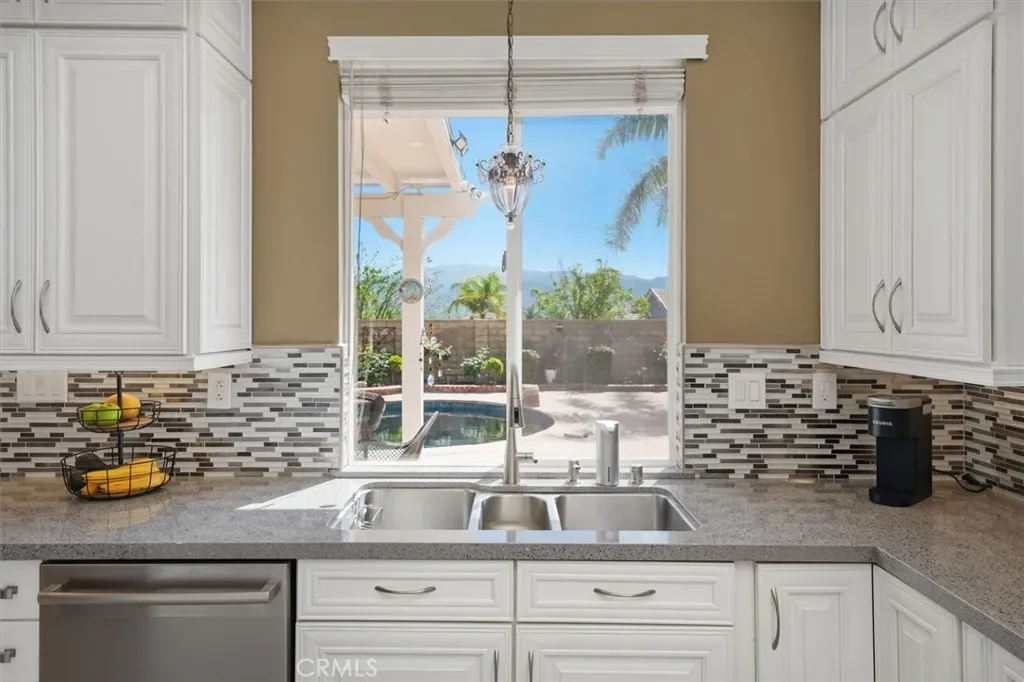 Step outside to your private backyard oasis, complete with a covered patio, sparkling pool and spa, flagstone hardscape, and beautifully landscaped grounds—perfect for relaxing or entertaining year-round.