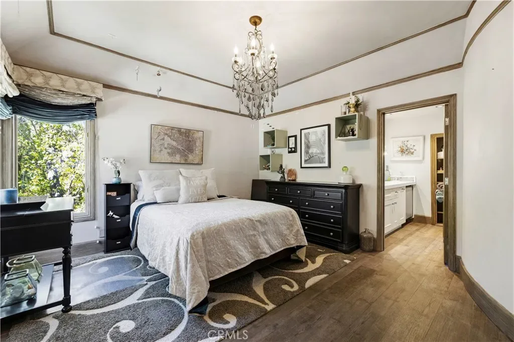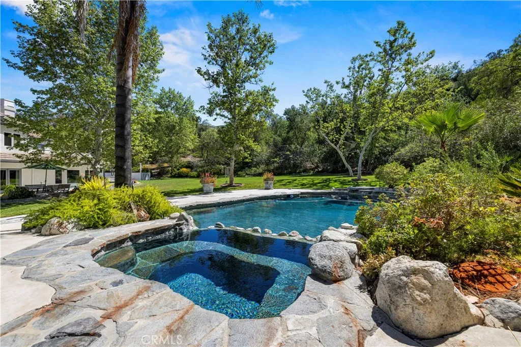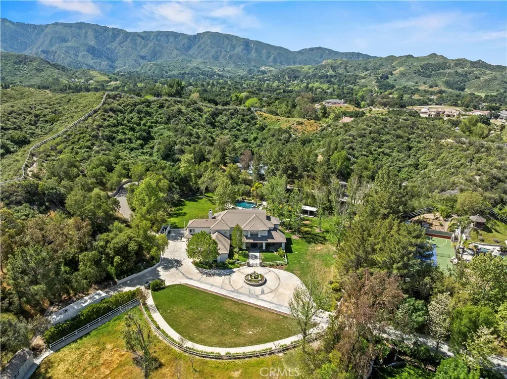 Welcome to your dream home in the prestigious Sand Canyon neighborhood! This California contemporary estate offers 5,134 sq ft of living space on a nearly 9-acre private and fully fenced property with serene mountain views. The gated drive leads to a grand circular driveway featuring a centerpiece fountain. A gorgeous custom metal front door opens into a sun-drenched great room with soaring ceilings, oversized windows, double doors leading outside, and a stunning custom statement fireplace, perfect for gathering or effortless entertaining. The formal dining room flows seamlessly from the main living space. The main level includes two well-appointed ensuite bedrooms with custom built-ins. The chef’s kitchen is a true showpiece with a soapstone island, natural stone countertops, and custom cabinetry all opening seamlessly to the breakfast nook and family room. Enjoy the 6 burner Dacor range, double ovens, dual refrigerator/freezer, steamer and generous pantry storage. The expansive family room features exposed beams, a custom feature wall, an architectural fireplace with extended hearth, and a bay window seat. Upstairs, an airy loft overlooks the great room. The primary suite is a private sanctuary with a fireplace, balcony views, and a sun patio with above-ground spa. A generous walk-in closet leads to a flexible bonus room. The ensuite bath offers dual vanities, a separate soaking tub, steam shower with rainfall feature and towel warmer, plus a laundry chute for added convenience. There are three additional bedrooms on the second floor, including one en-suite. Outside, enjoy a sprawling lawn, resort-style pool and waterfall spa, built-in BBQ, and a sport court lined for basketball and pickleball. A detached workshop/5-car garage, RV electrical hookup, and generator system (with potential backup to the main house) complete this exceptional property. Whether you’re dreaming of unforgettable gatherings, space for hobbies and toys, or a true retreat surrounded by nature, this property delivers a rare lifestyle in an exclusive neighborhood!