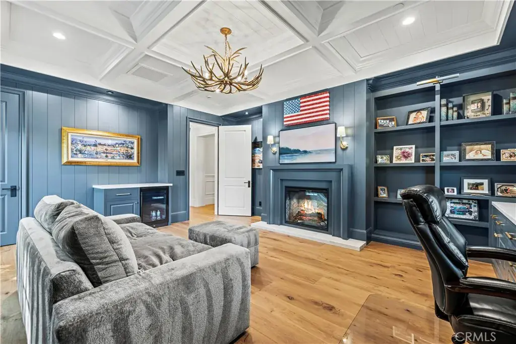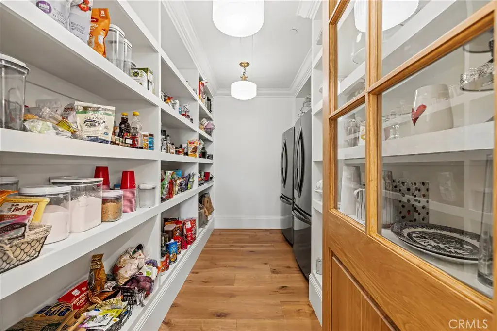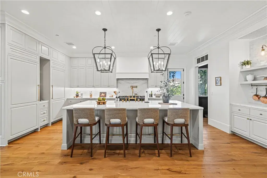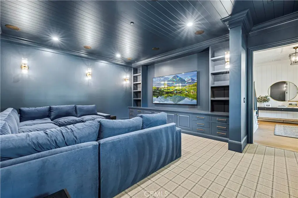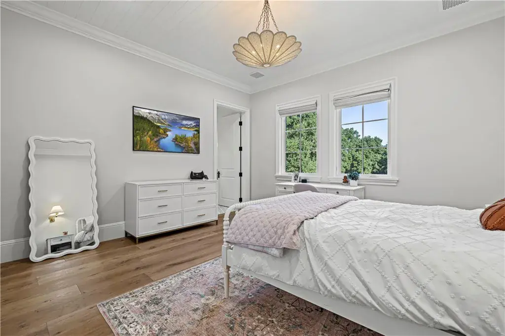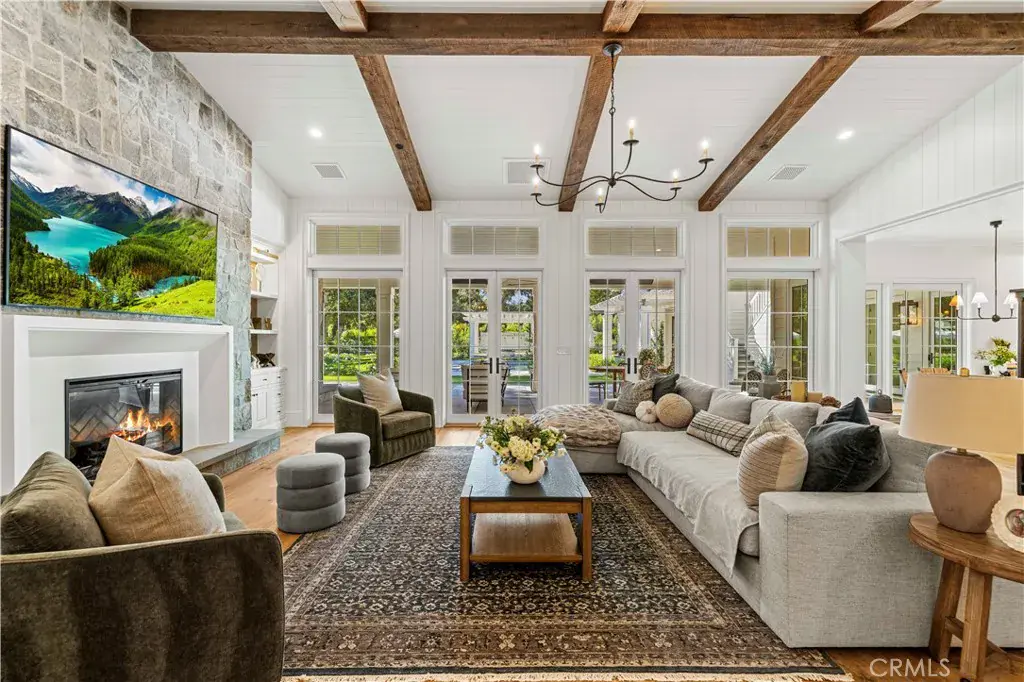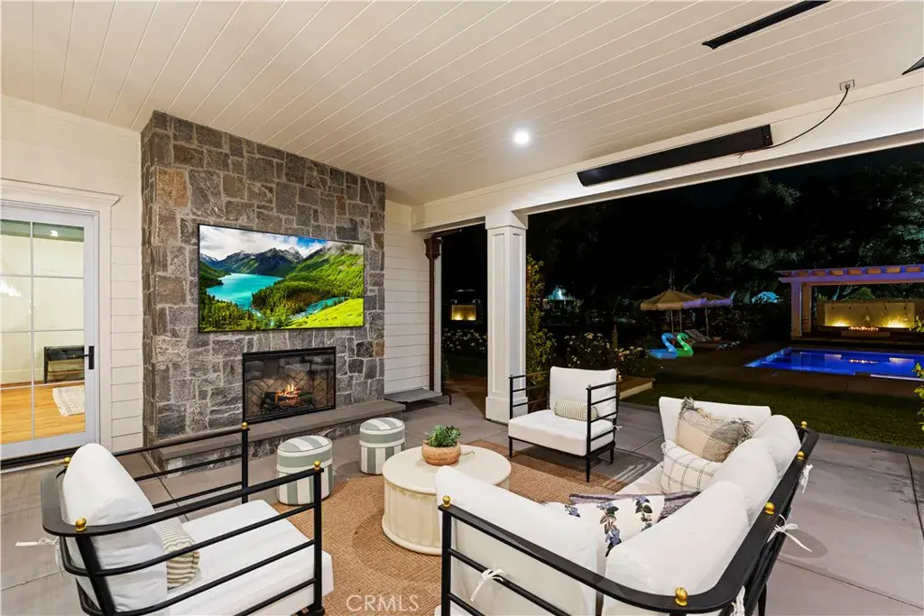 Tucked behind private gates and approached by a long paver stone driveway, this truly magnificent Sand Canyon estate spans approximately 7,815 sqft across five exquisitely manicured acres. The 6,800 sqft main residence is complemented by a spacious 653 sqft ADU above the attached three car garage, along with a separate two car carriage garage connected to a 362 square foot gym or office. Inside, soaring ceilings, coffered detailing, custom wall paneling, rich wood accents, and wide plank oak floors set a warm yet grand tone, anchored by striking stone fireplaces and reclaimed beams showcased in the family room. The home flows effortlessly into a showpiece kitchen finished in Calacatta marble with a statement Lacanche range, Thermador appliances, handmade tile, a butler’s pantry, wine refrigeration, seamless custom cabinetry, and a large walk-in pantry with two additional refrigerators. The main level features both the expansive primary bedroom suite and an additional downstairs bedroom with a full bath, while upstairs offers three guest bedrooms each with their own ensuite baths, a spacious loft, and beautifully appointed bathrooms finished in Carrera marble. The primary suite is a true retreat with its own fireplace, breathtaking estate views, and a spa inspired bath featuring herringbone marble floors, a luxurious shower, and a stunning standalone soaking tub. Entertaining continues with a refined dining room with classic wainscoting, a dedicated movie theater with insulated soundproofed walls, and space beneath the stairs that could offer a potential wine cellar. The ADU provides private guest accommodations with tall ceilings, kitchenette, separate HVAC, studio style living, and marble shower. Outdoors, the estate unfolds with stone patios and walkways, copper lanterns and gutters, a stunning resort style pool with deck jets and spa, a tranquil pond with multiple water features for added ambiance, an outdoor shower, a fully equipped outdoor kitchen, covered entertaining areas with heaters and oversized fan, 48 heritage oak trees, a stone encased raised bed garden with greenhouse, full perimeter snake fencing, manicured lawns, professional lighting, a five stall barn with turnouts, sport courts, sauna, and generous storage, all powered by a 600 amp electrical panel, paid off solar, public water for the home, and a private irrigation well, firmly positioning this exceptional property among the most premier estates Santa Clarita has to offer.