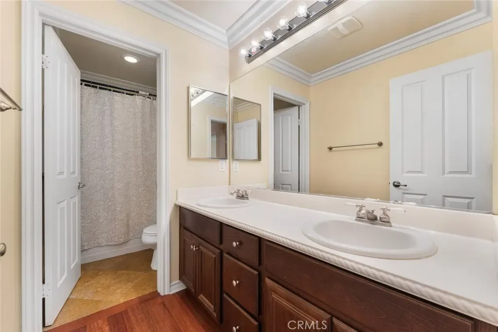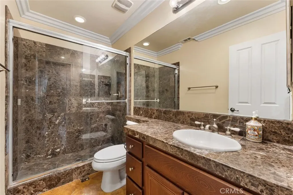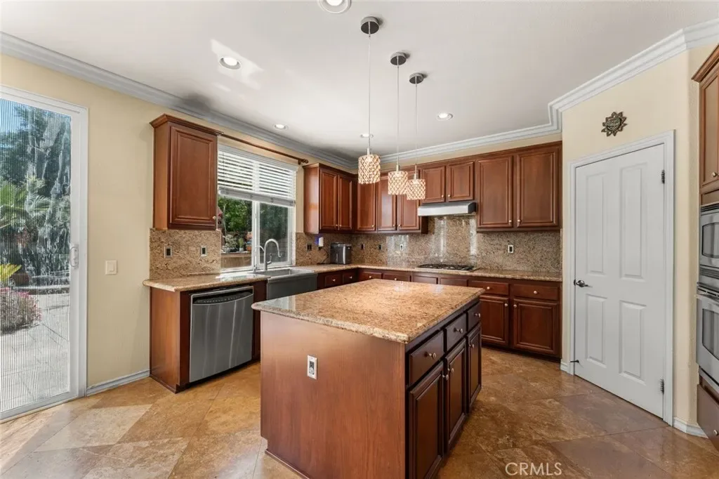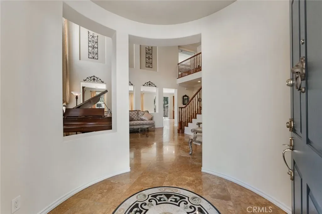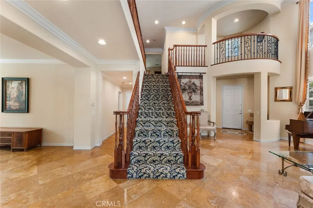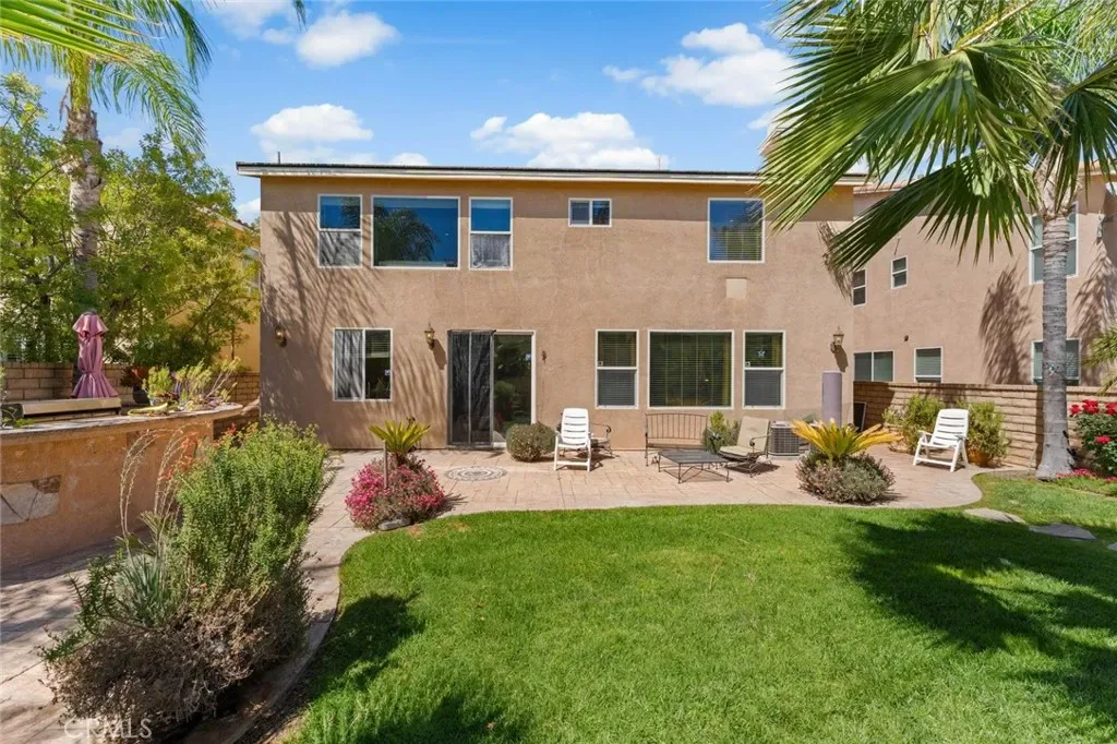 Welcome to this expansive 5-bedroom 4-bathroom home boasting over 3,450 sq ft of thoughtfully designed living space located in the highly sought-after Fair Oaks community of Santa Clarita. Home features elegant entry with custom Onyx & Stone medallion inlay and 24 x 24 travertine stone flooring downstairs and mahogany wood flooring upstairs. Enjoy an open concept floor plan with spacious living and dining areas, soaring high ceilings and abundant natural light throughout. Spacious Master suite and master bath with two walk-in closets, dual sinks, oval soaking tub and separate shower. Home also features a beautiful kitchen with granite counters and a built-in desk area. Other features include a custom stair handrail, crown molding throughout and a separate laundry room upstairs. The backyard offers gorgeous landscaping, a fountain, stamped concrete and a custom BBQ with cook top perfect for entertaining. Private backyard with no rear neighbors. Walking distance to the pool and rec area. Close proximity to the freeway, parks, shopping and restaurants. Very low HOA!