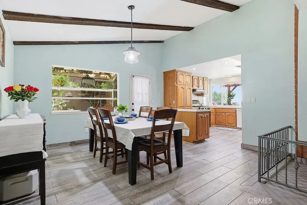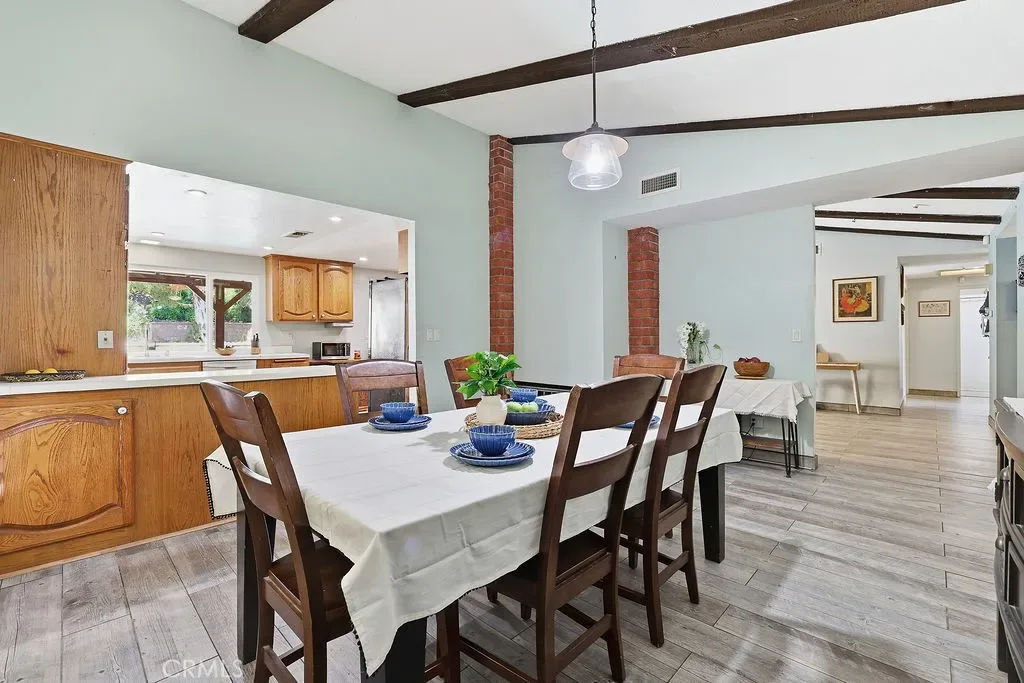 Charming single-story pool home in Canyon Country, ideally located near the desirable Sand Canyon Plaza shopping center, and well-rated schools with easy commuter access. Situated on a corner lot. This 3 bedroom, 2 bathroom home features an open-concept layout with exposed wood beam ceilings, a statement brick fireplace, recessed lighting throughout, ceiling fans, newer laminate and tile flooring plus so much natural light! Spacious living and dining areas flow seamlessly with large sliding glass doors creating effortless indoor-outdoor living.