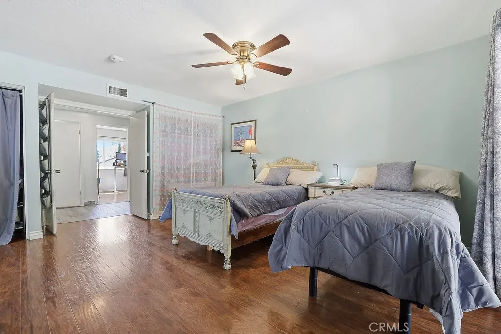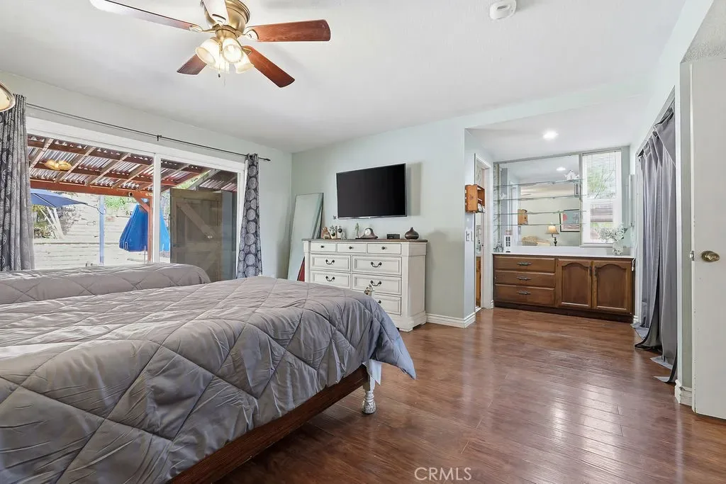 The primary suite includes direct backyard access and extended vanity area. There’s also dual closets and large secondary bedrooms.