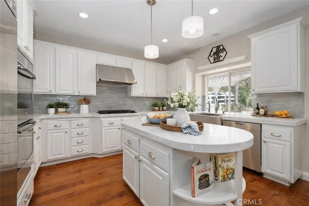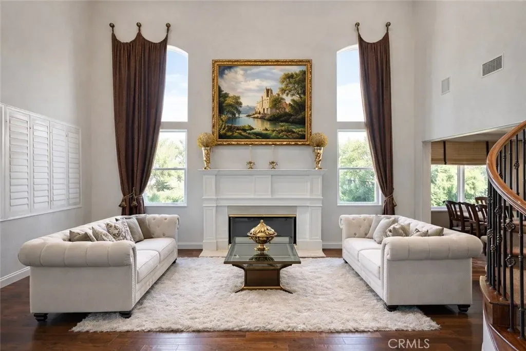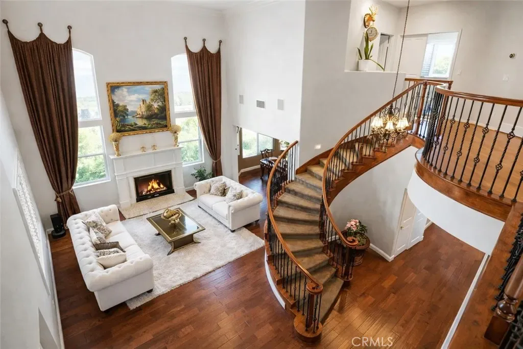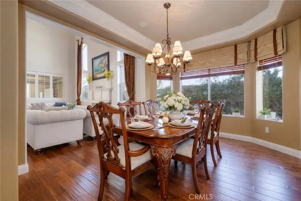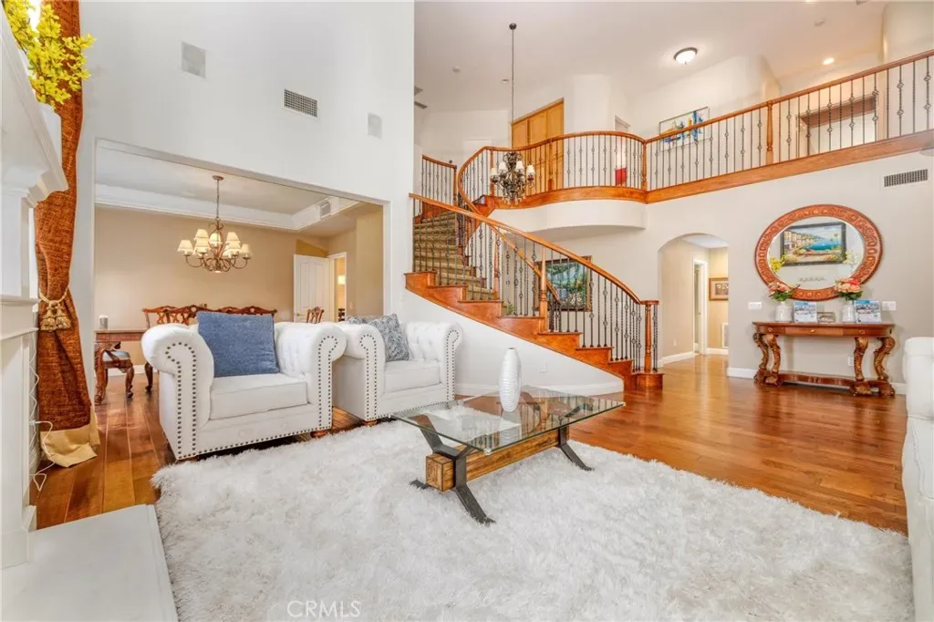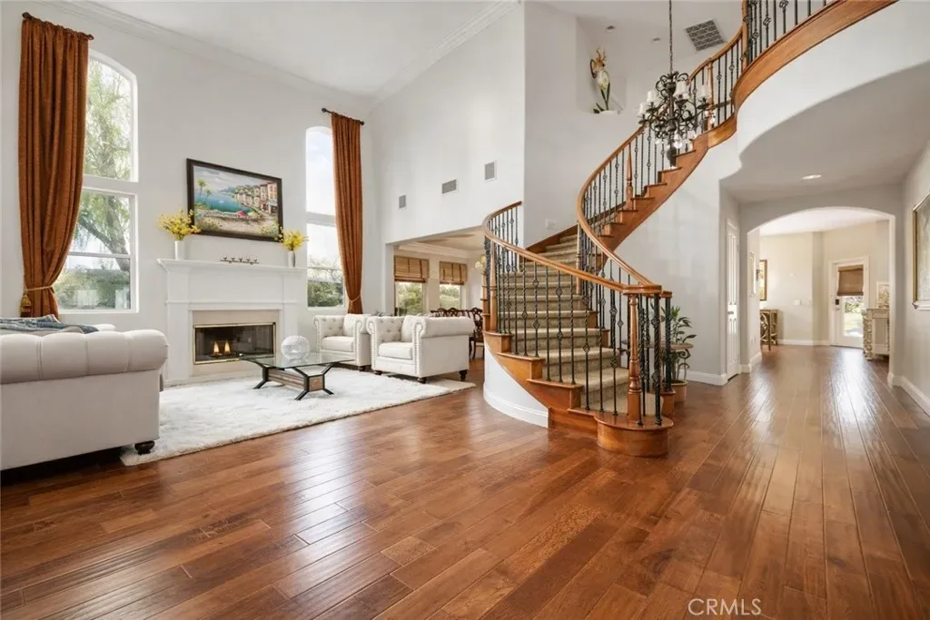 This impressive home features a dramatic formal entry with cathedral ceilings, abundant natural light, and a bright open floor plan connecting the main living areas. The chef’s kitchen is designed for both everyday living and entertaining with quartz countertops, stainless steel appliances, center island, butler’s pantry, and breakfast area, flowing seamlessly into the surrounding gathering spaces and family areas.
